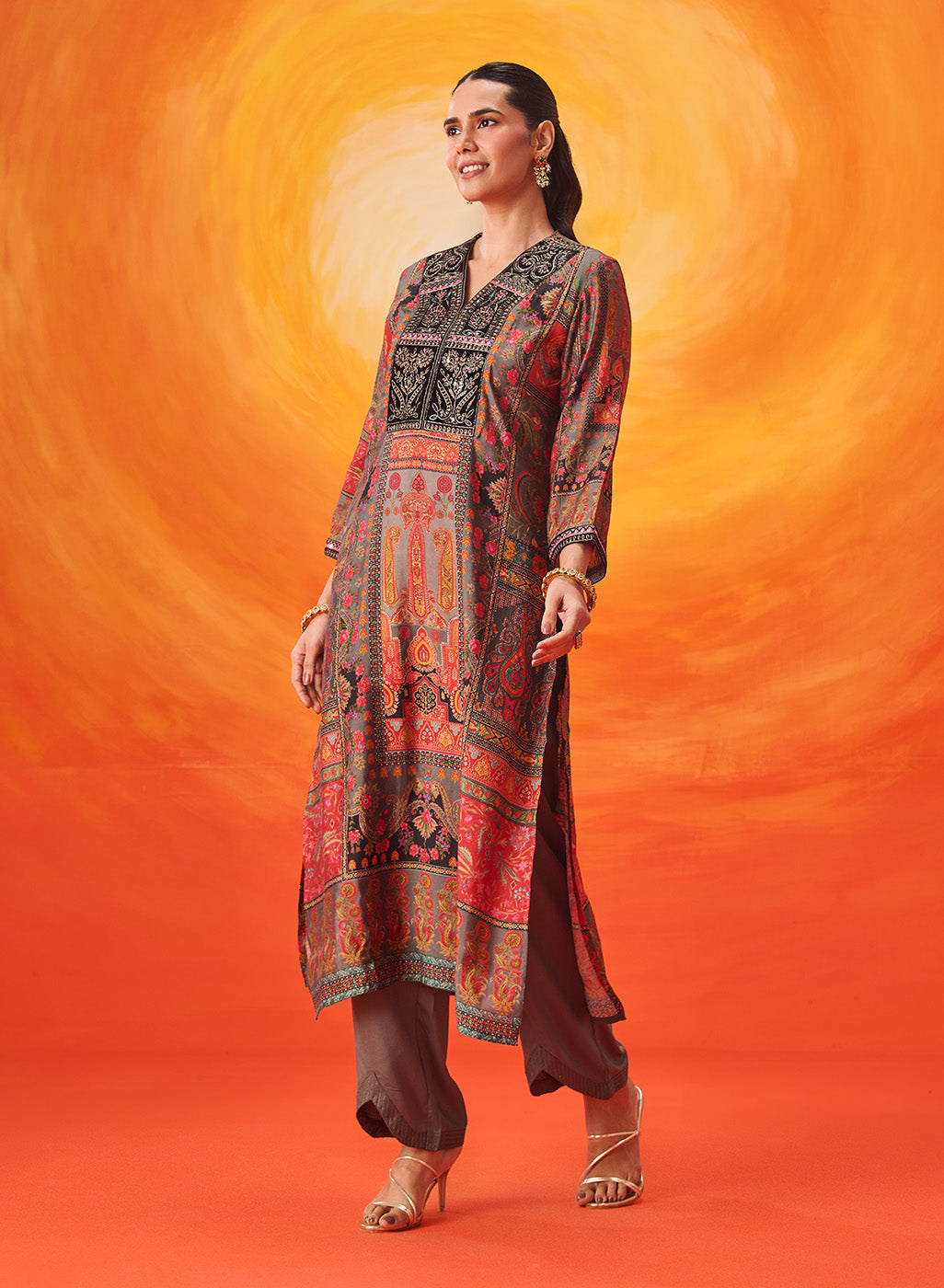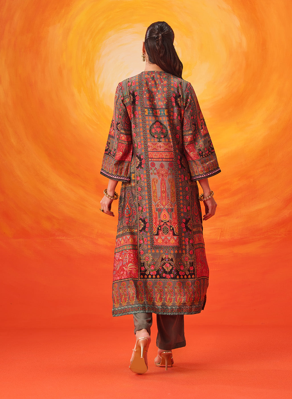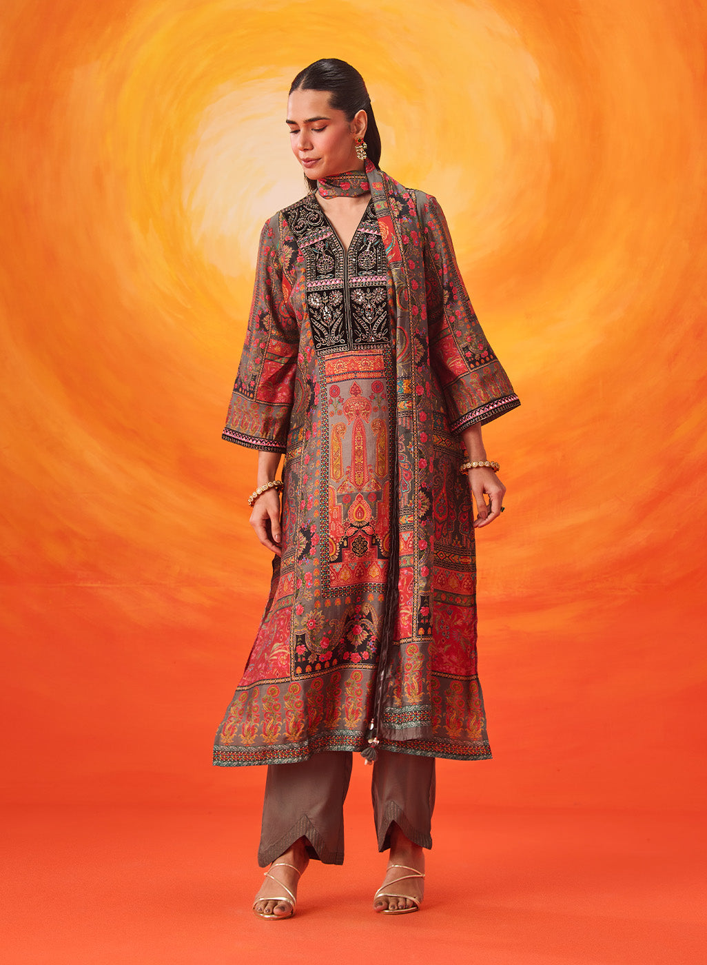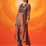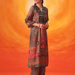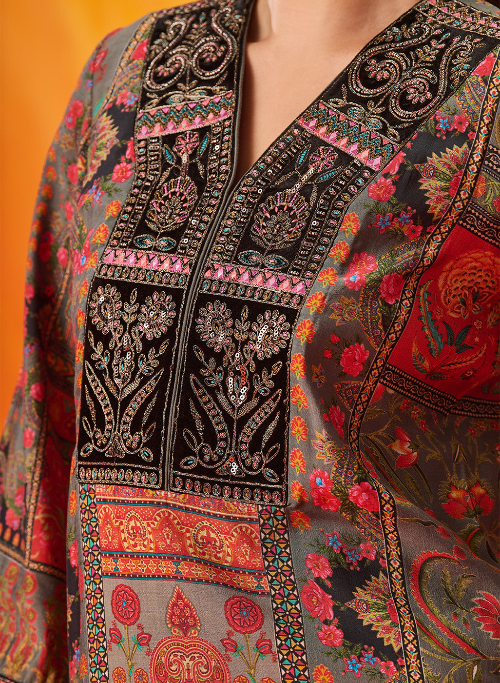 Crafted in a refined grey, this kurta set speaks in soft elegance. The layered prints, velvet accents and delicate embroidery come together to create a look that feels composed, thoughtful, and quietly luxurious.