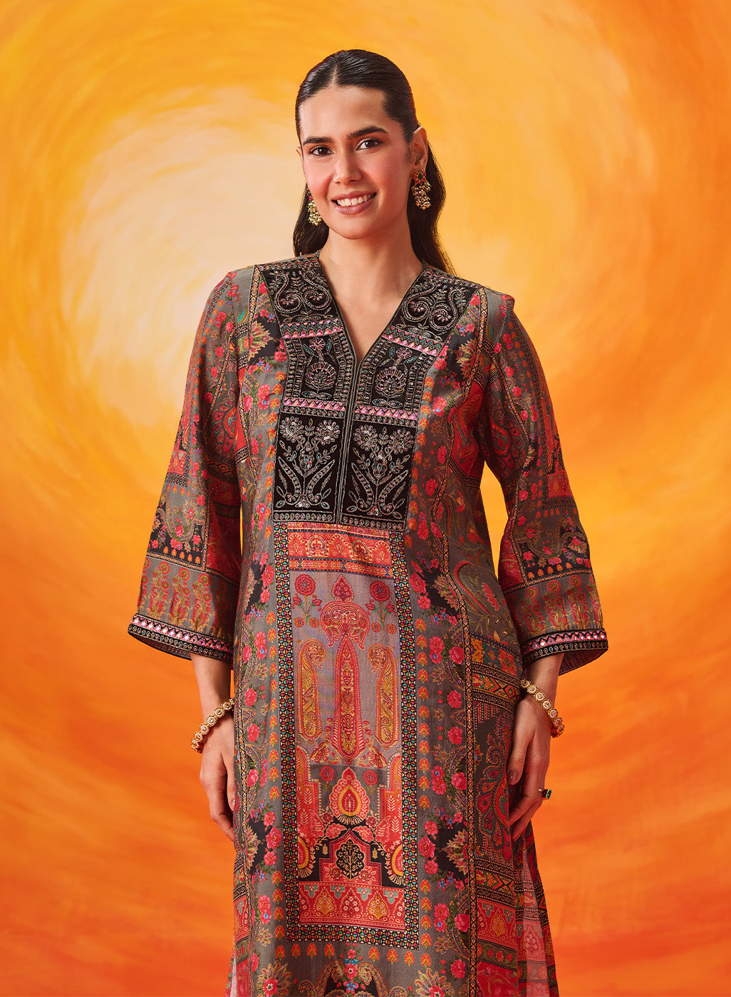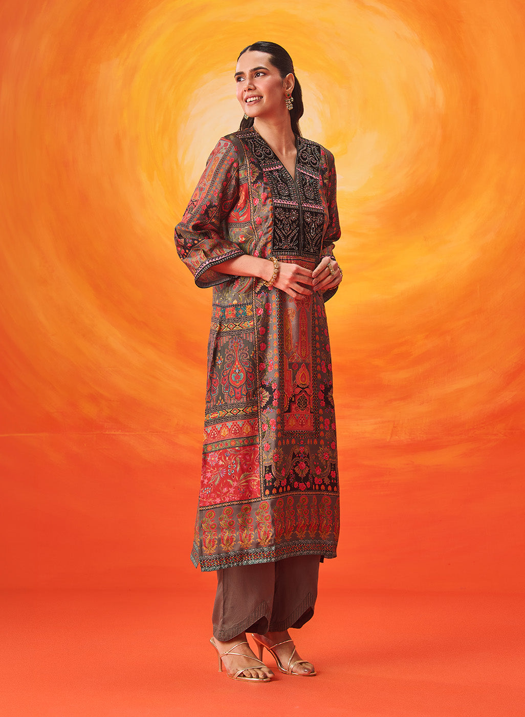 • All-over printed kurta with fine dori embroidery, beadwork and resham highlights.