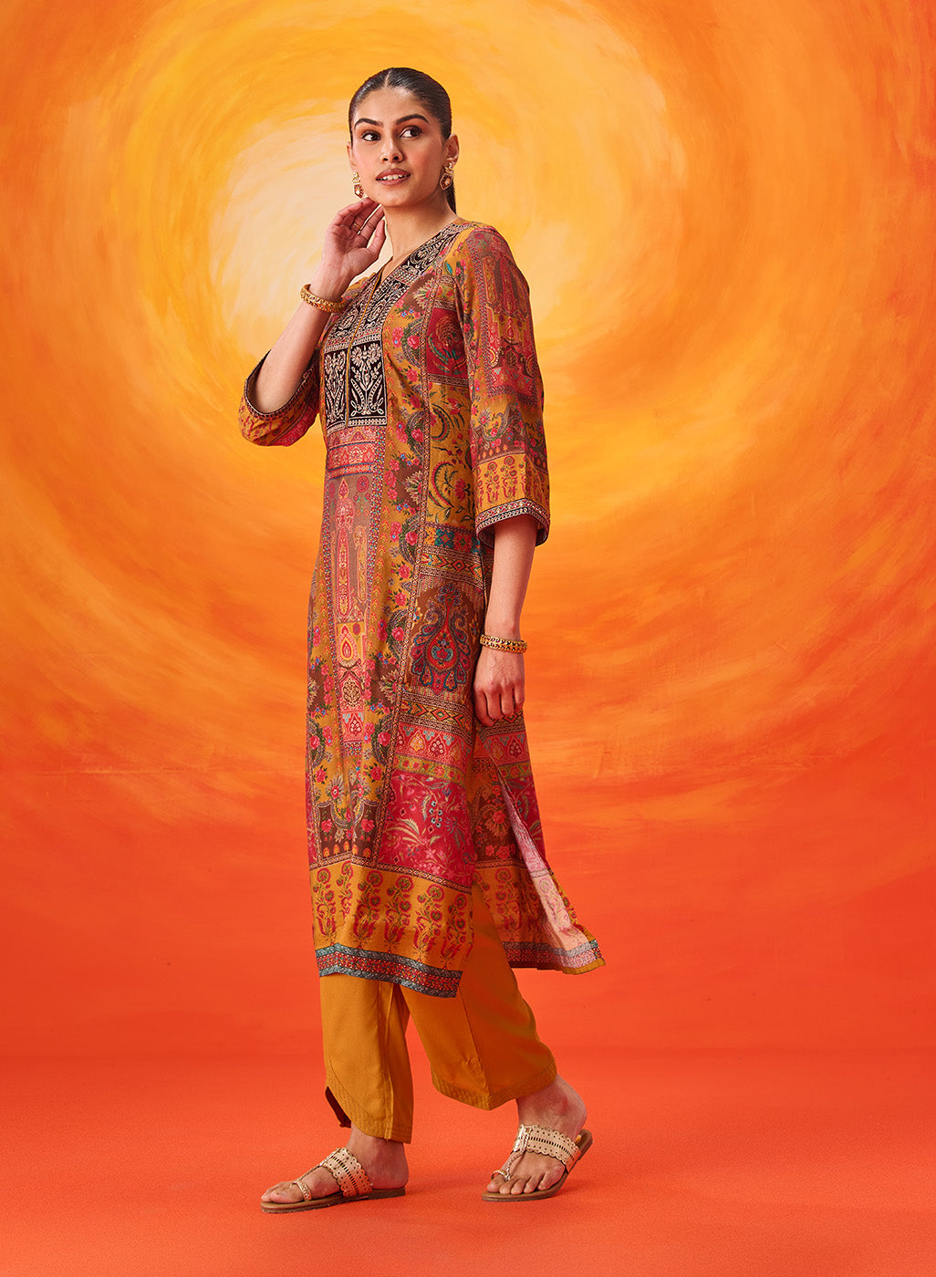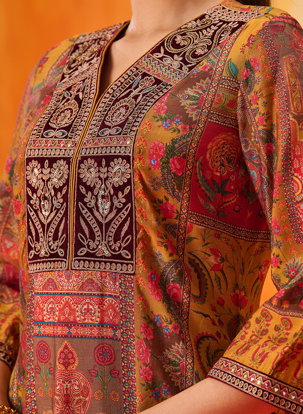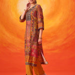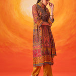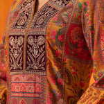 This mustard kurta set feels like a quiet ode to craft—rich in colour, layered in detail, and timeless in spirit. The all-over print forms a beautiful canvas for intricate dori embroidery, while velvet accents and soft shimmer add depth without excess.