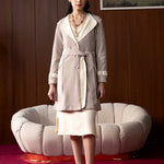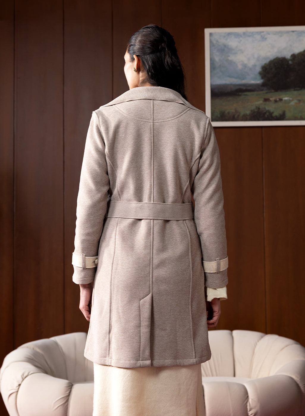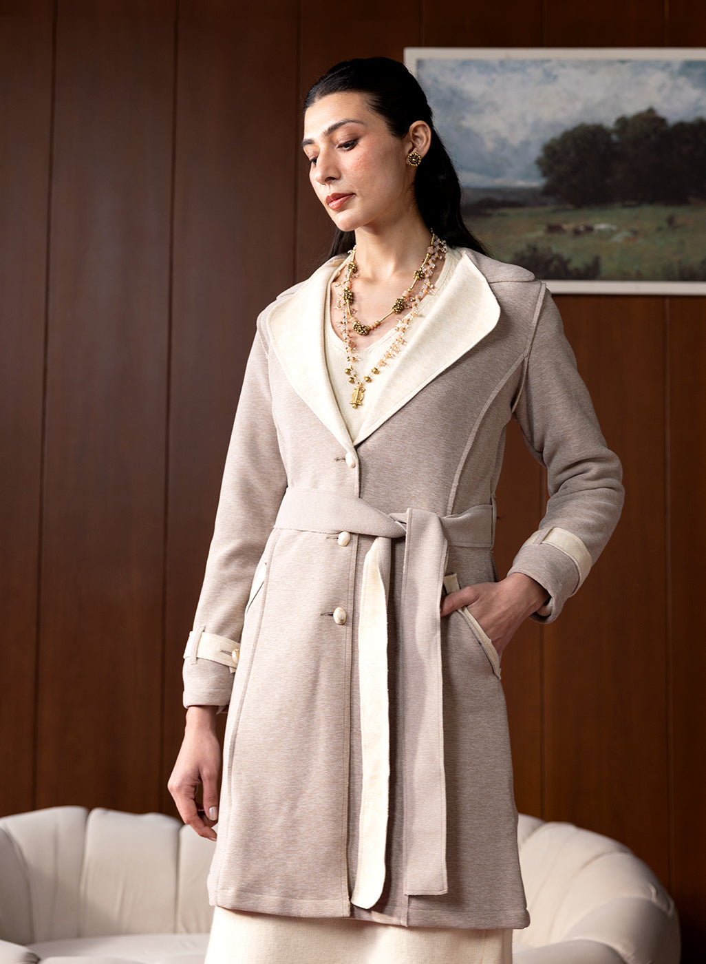 This beige coat is your go-to for understated winter elegance. The muted neutral shade paired with off-white contrast detailing makes it effortlessly chic and endlessly versatile. Finished with a notch lapel, buttoned front, and a flattering waist belt, it adds structure without compromising on comfort.