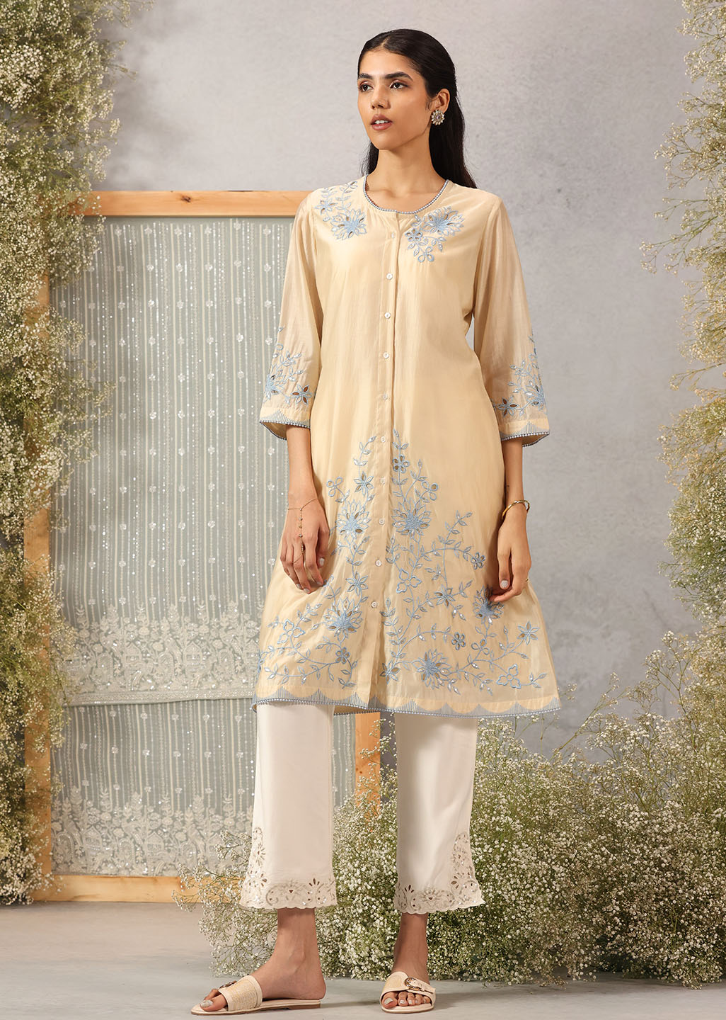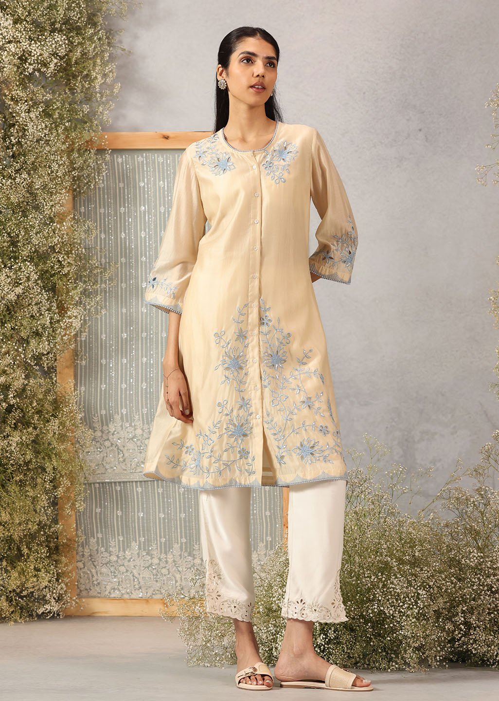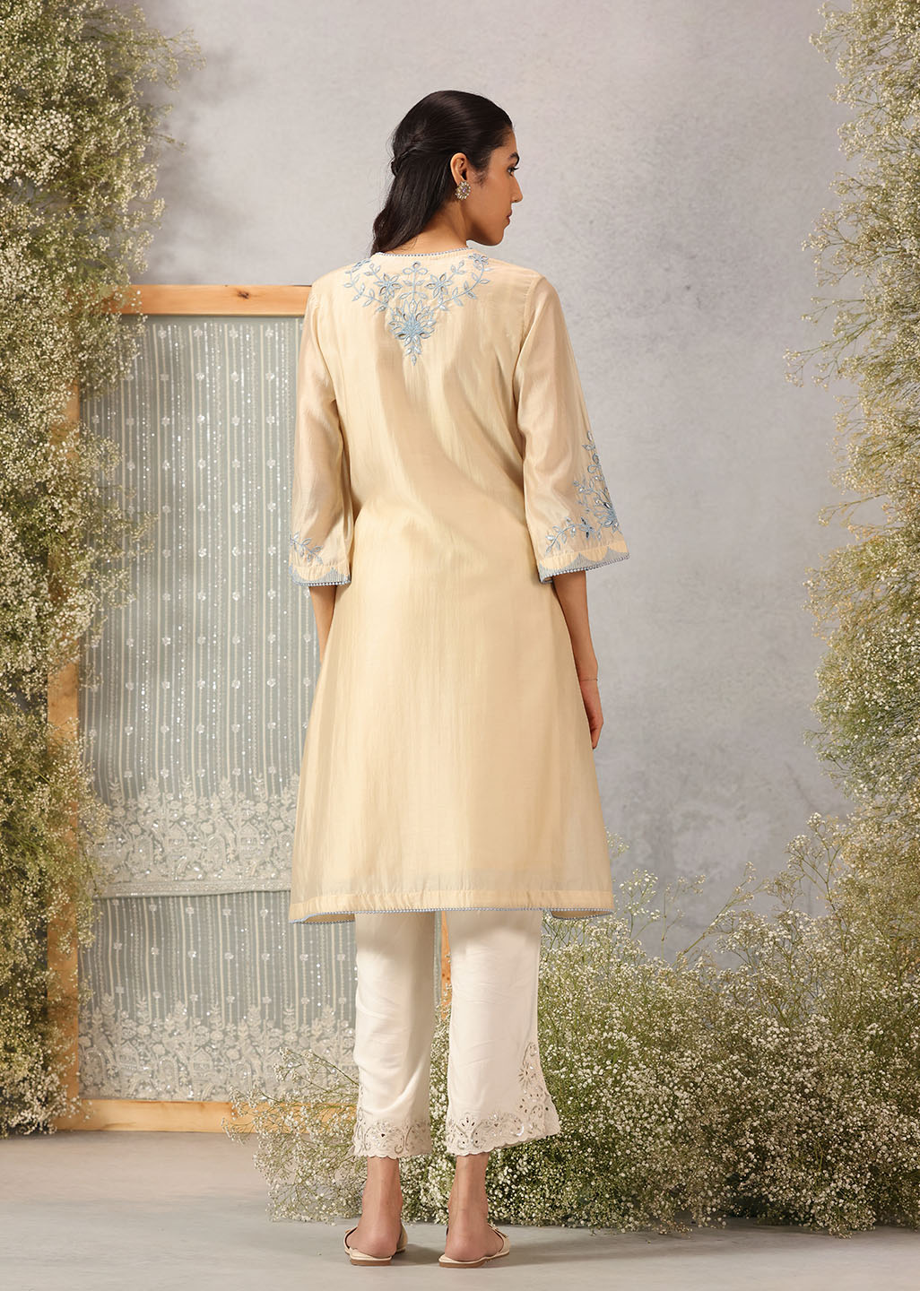Like morning light poured into fabric, this butter-hued kurta embodies softness and serenity. The A-line silhouette drapes gently, while the floral silk threadwork unfurls across the neckline, sleeves, hem, and back with graceful artistry. Scuplted cutwork, shimmering accents, and delicate lace edging bring a whisper of celebration to its tranquil palette, making it an elegant choice for both day and dusk.