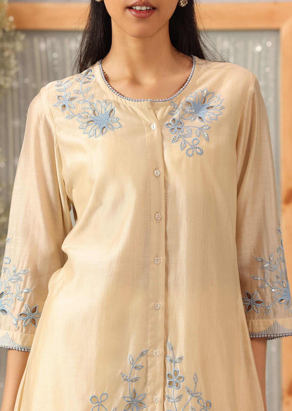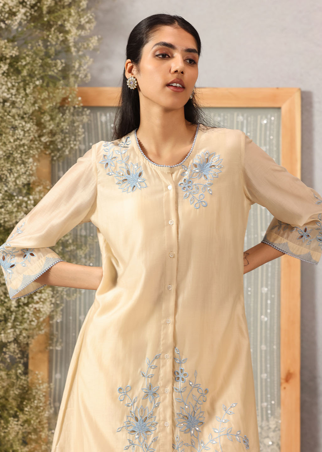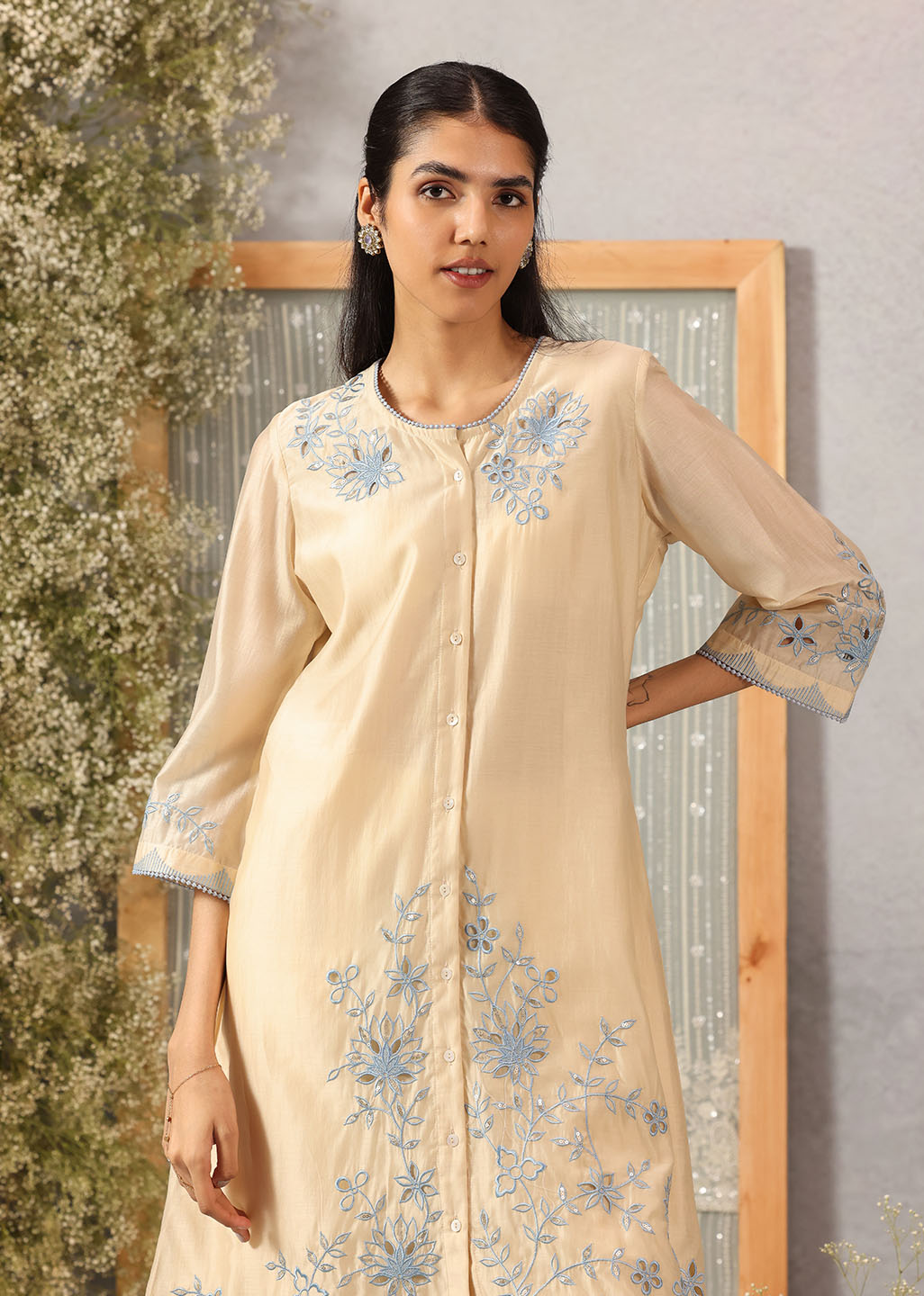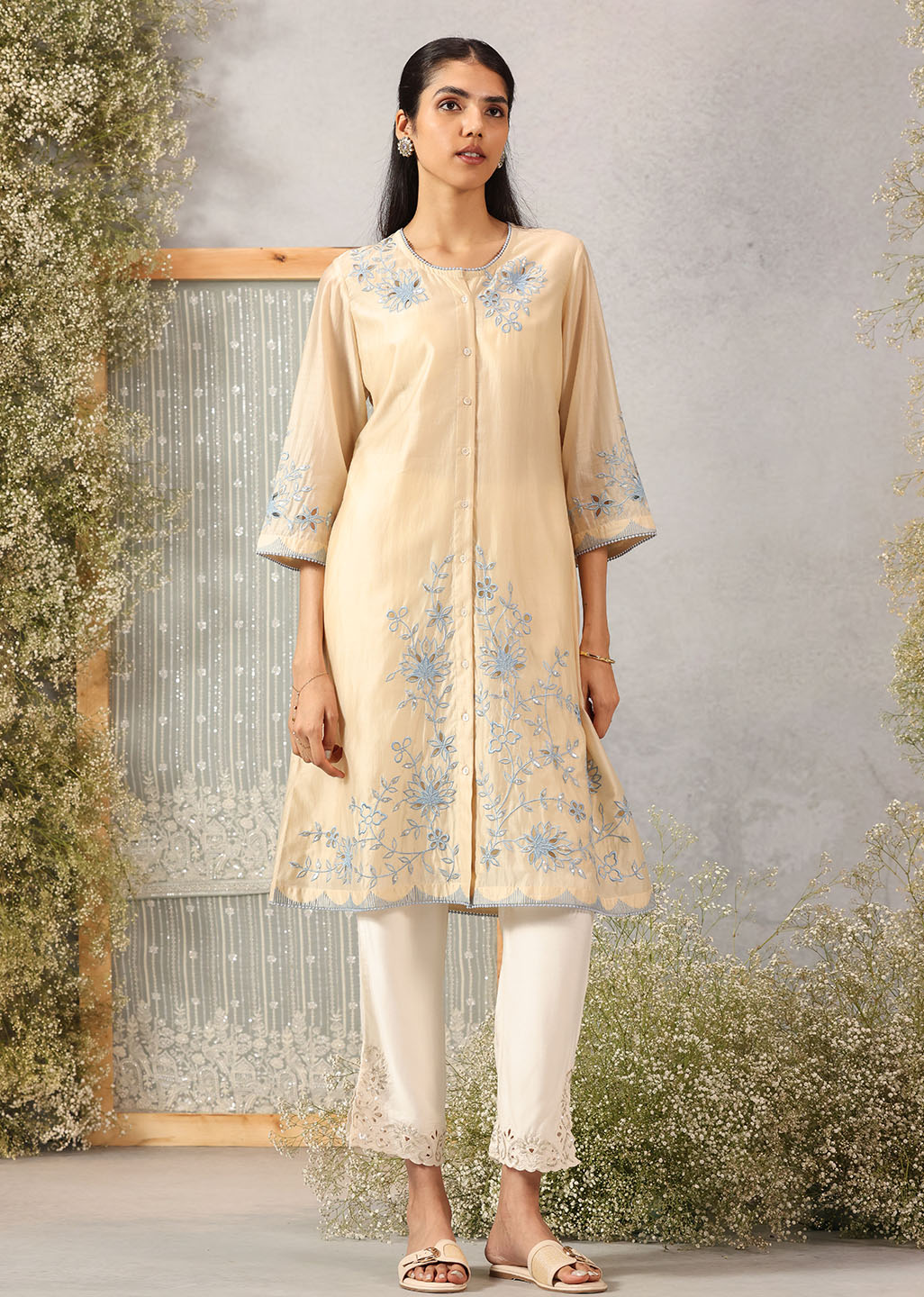 Like morning light poured into fabric, this butter-hued kurta embodies softness and serenity. The A-line silhouette drapes gently, while the floral silk threadwork unfurls across the neckline, sleeves, hem, and back with graceful artistry. Scuplted cutwork, shimmering accents, and delicate lace edging bring a whisper of celebration to its tranquil palette, making it an elegant choice for both day and dusk.