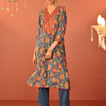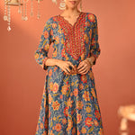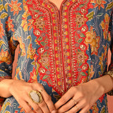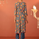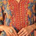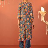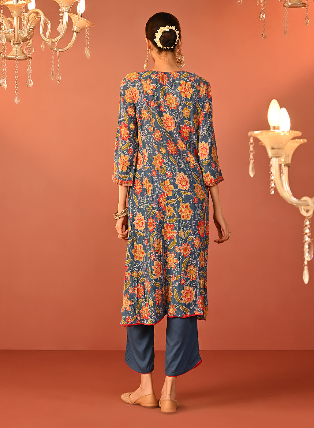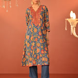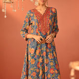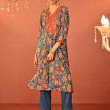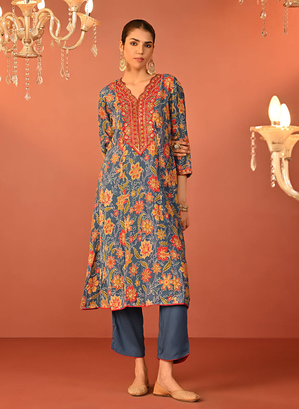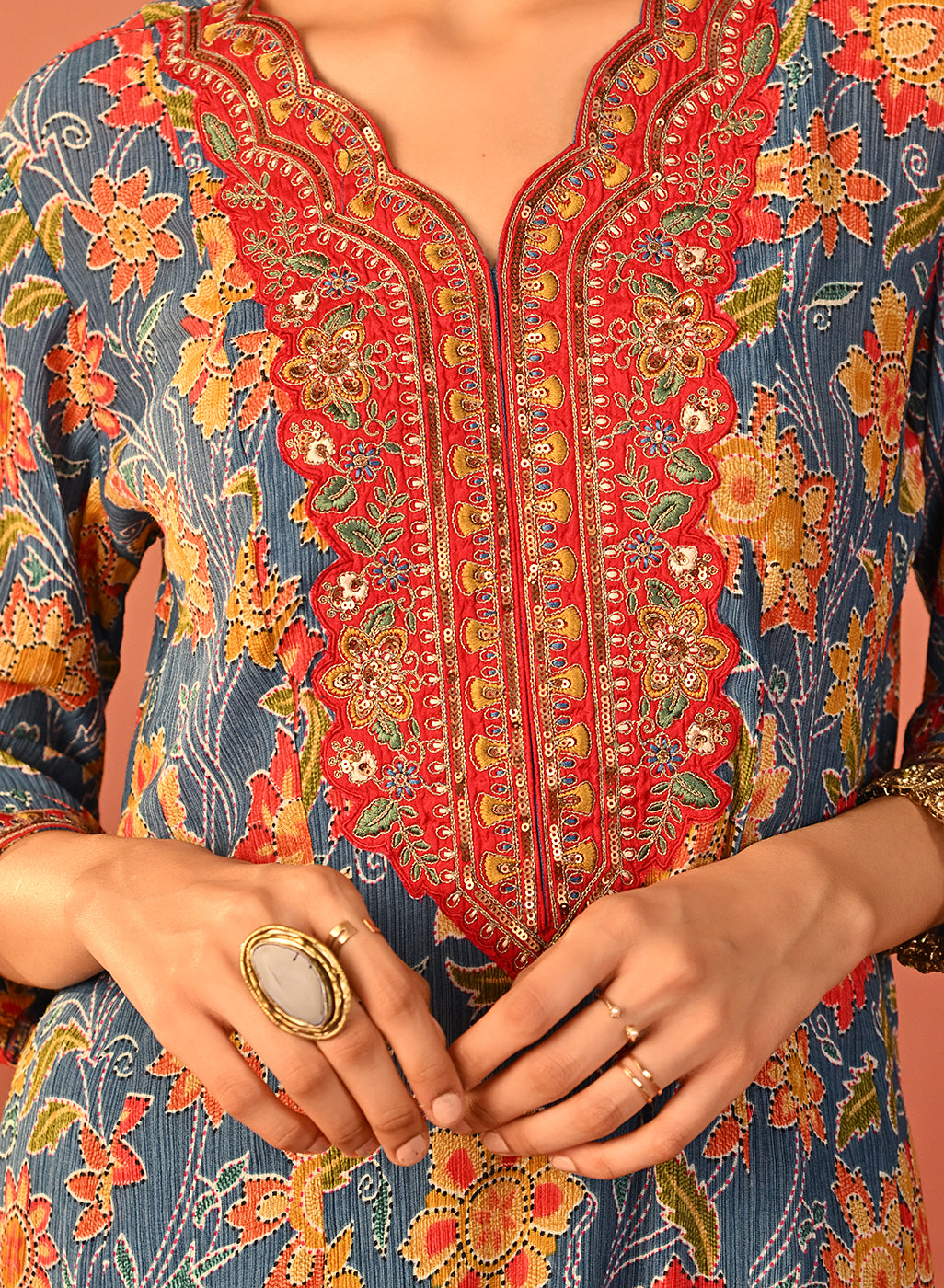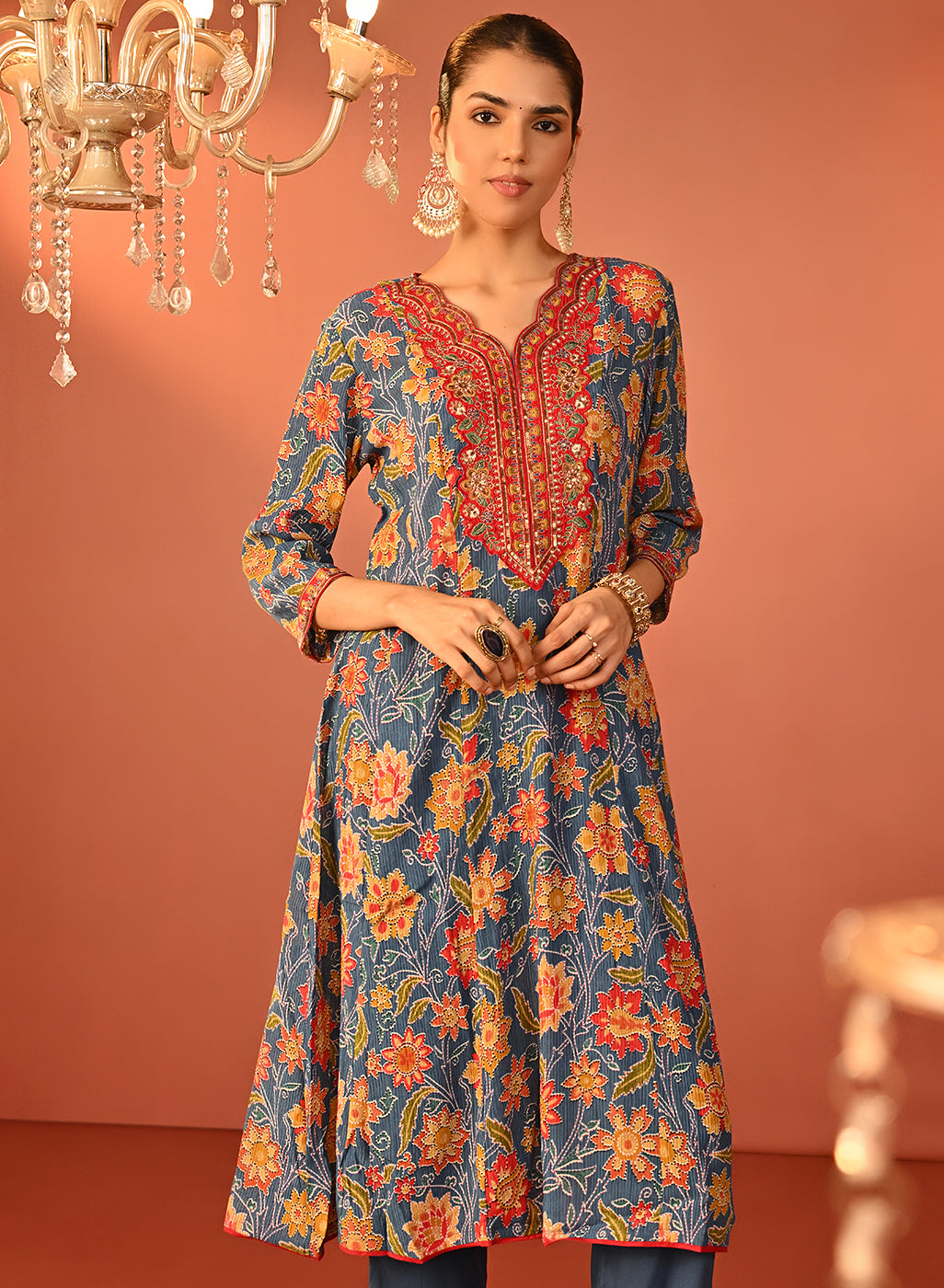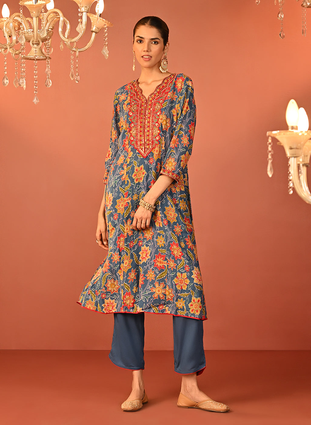Our Blue Kurta Set is a perfect for festive celebrations with an all-over print, enhanced by intricate craftsmanship of Resham embroidery and sequin highlights. The coordinating straight pants, made from smooth fabric in a complementary solid sea green hue create a cohesive and stylish ensemble.