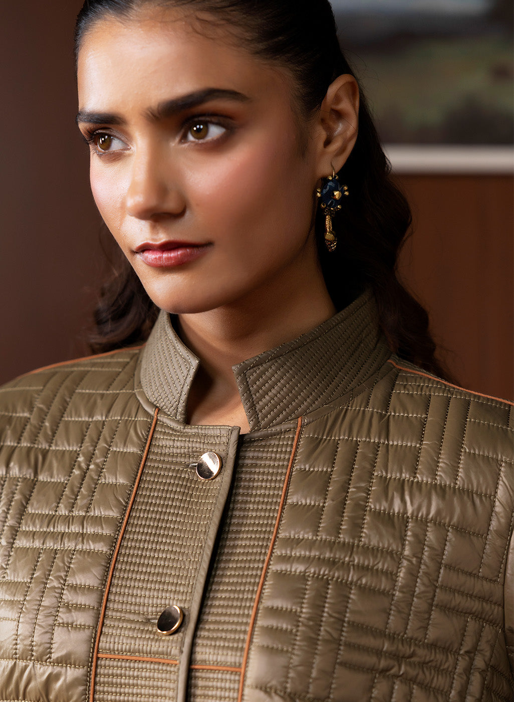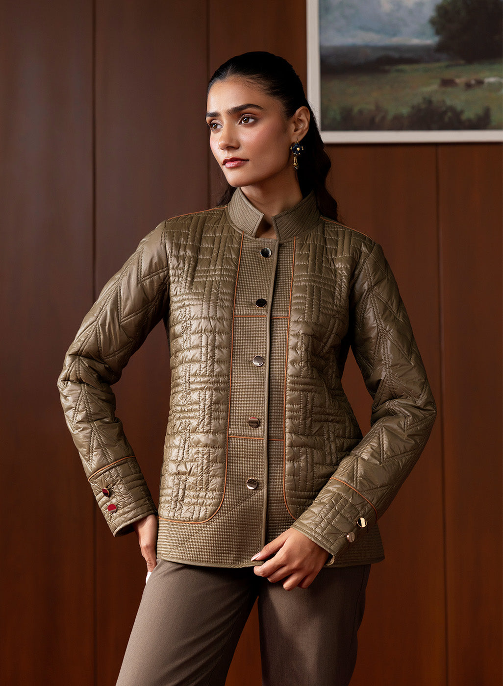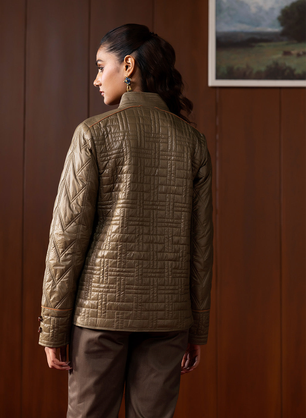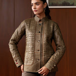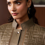 Understated yet refined, this olive quilted jacket brings together earthy tones and contemporary structure. Its textured panels, chevron-stitched sleeves, and clean high-collar silhouette make it a versatile winter essential that blends warmth, functionality, and polished style. The soft lining and thoughtful detailing elevate it beyond everyday outerwear, offering a modern yet timeless appeal.