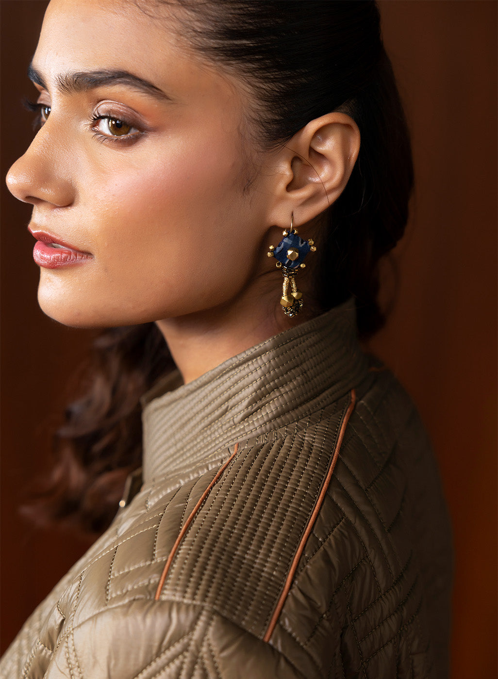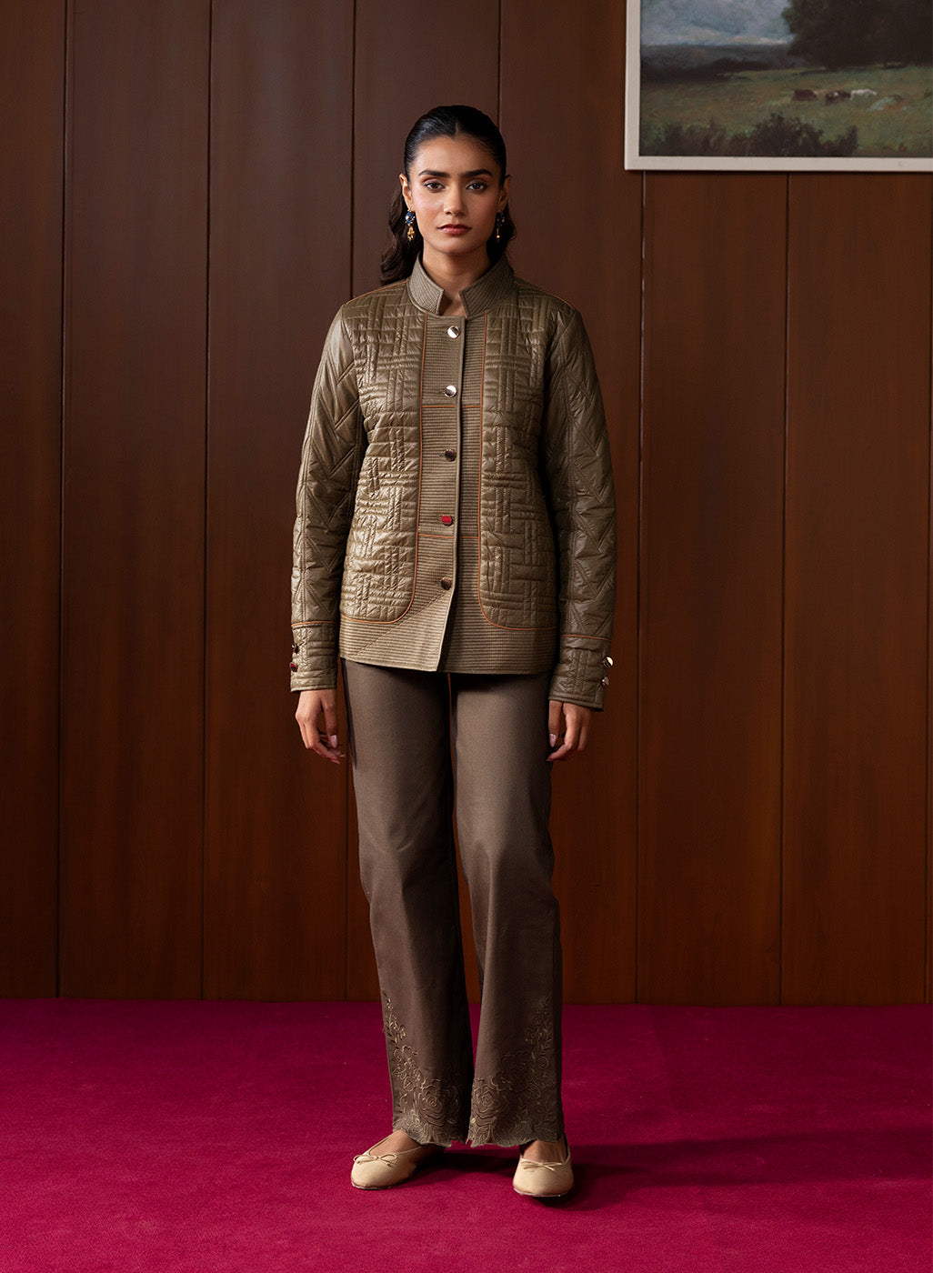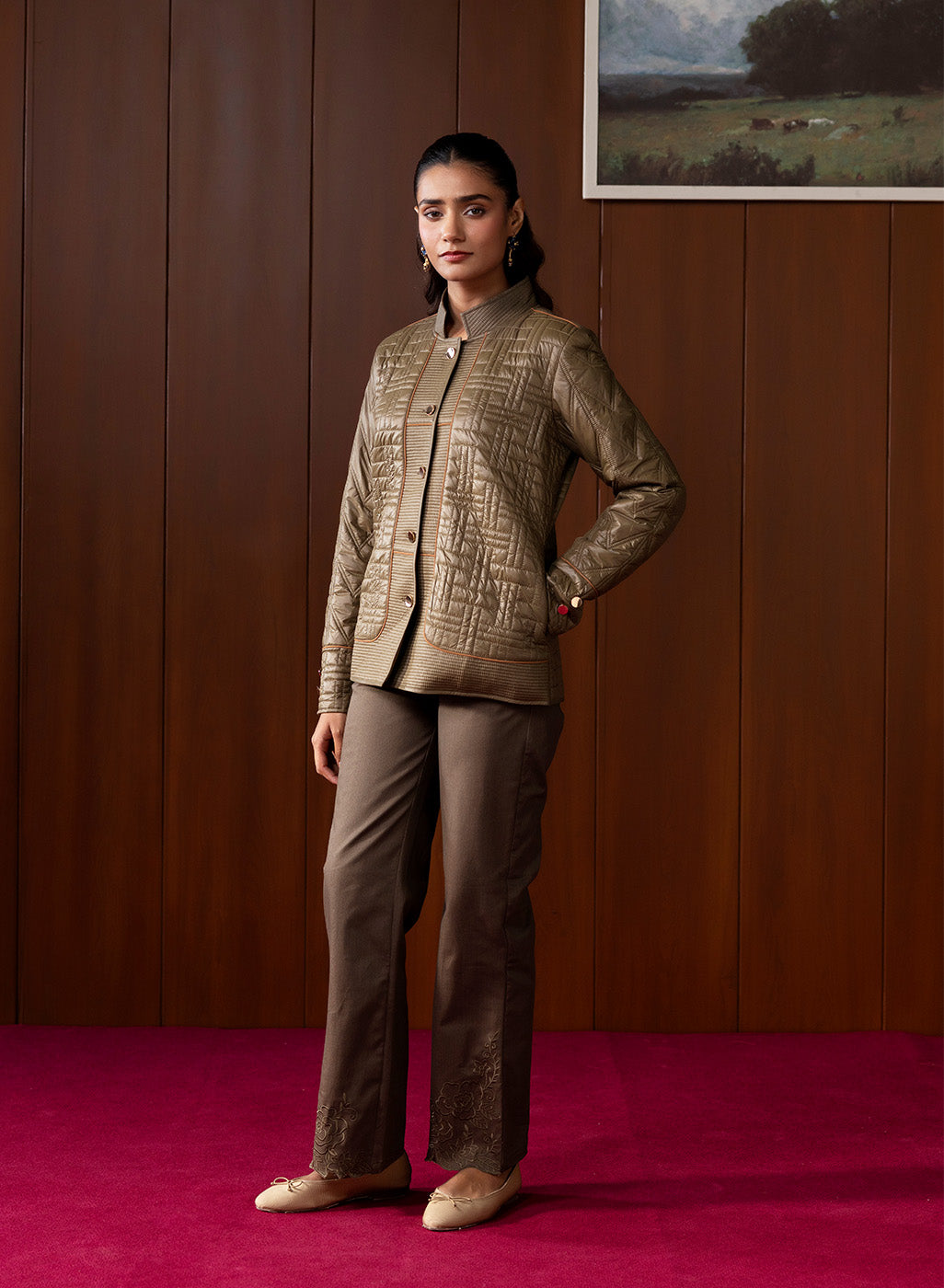 Understated yet refined, this olive quilted jacket brings together earthy tones and contemporary structure. Its textured panels, chevron-stitched sleeves, and clean high-collar silhouette make it a versatile winter essential that blends warmth, functionality, and polished style. The soft lining and thoughtful detailing elevate it beyond everyday outerwear, offering a modern yet timeless appeal.