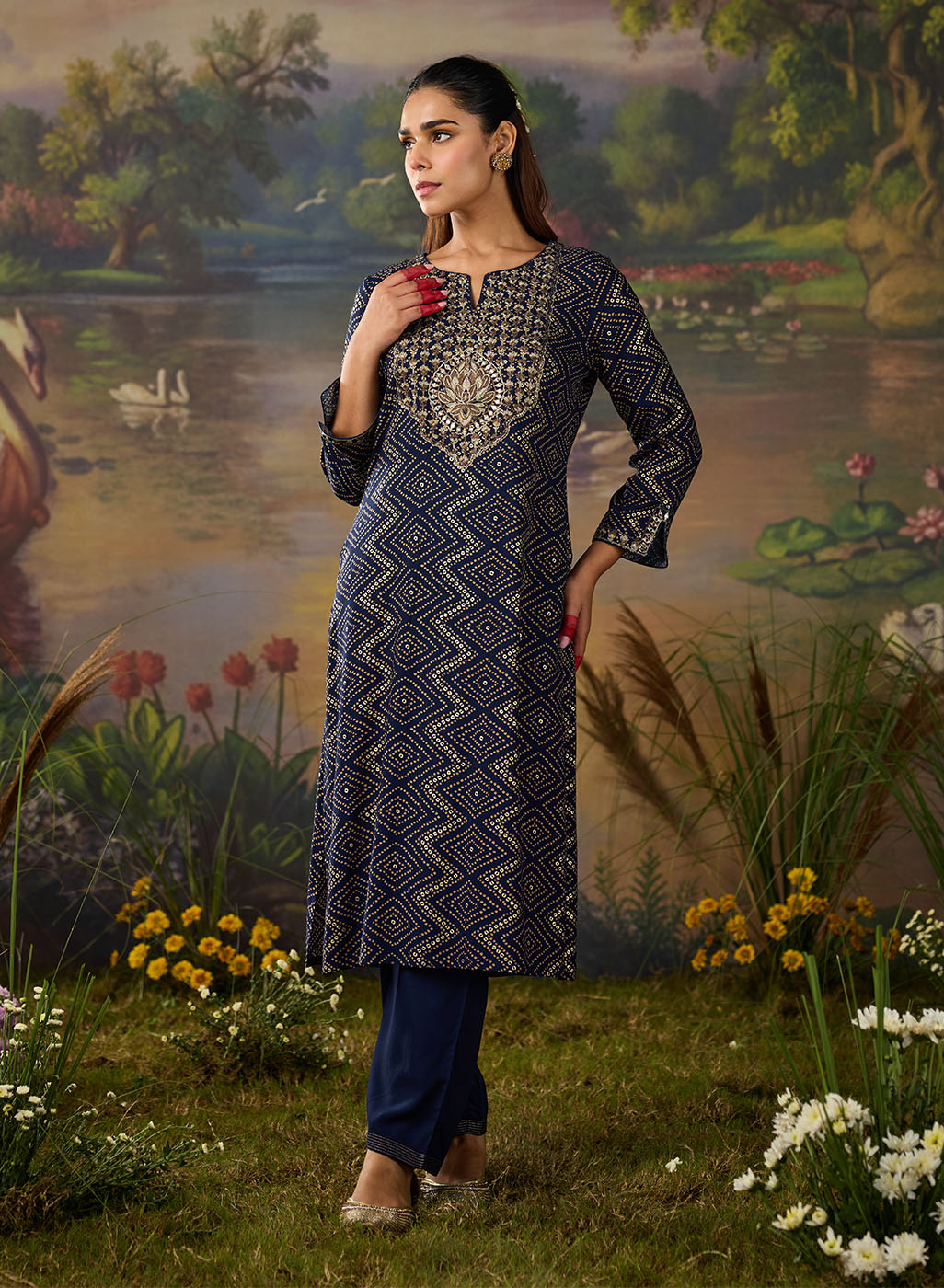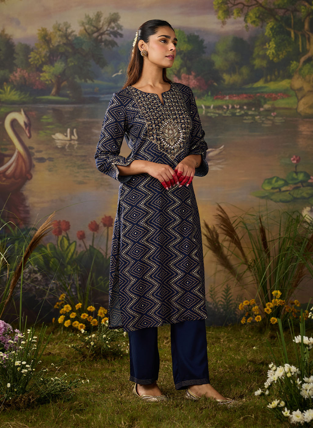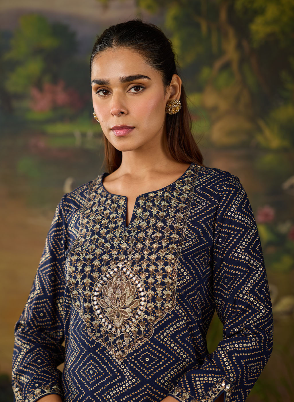 Elegant and effortlessly festive, this midnight blue kurta set brings a refined depth to traditional charm. The straight kurta in soft, lightweight viscose is adorned with a bandhni-inspired print in a chevron pattern, elevated with subtle gold foil detailing that shimmers beautifully against the dark base. Zari embroidery with sequin highlights and mirror accents adorns the neckline and sleeve slit, making it perfect for celebratory occasions. The solid straight bottoms with embroidered hems complete the ensemble with a polished touch.