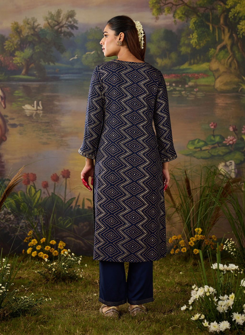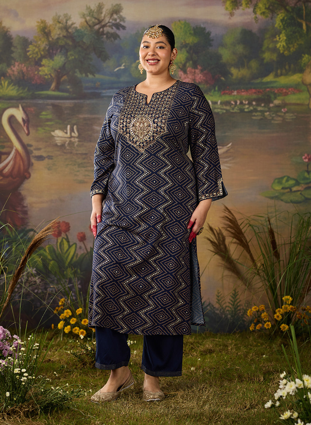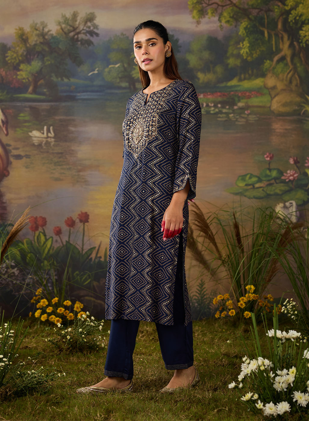 Elegant and effortlessly festive, this midnight blue kurta set brings a refined depth to traditional charm. The straight kurta in soft, lightweight viscose is adorned with a bandhni-inspired print in a chevron pattern, elevated with subtle gold foil detailing that shimmers beautifully against the dark base. Zari embroidery with sequin highlights and mirror accents adorns the neckline and sleeve slit, making it perfect for celebratory occasions. The solid straight bottoms with embroidered hems complete the ensemble with a polished touch.