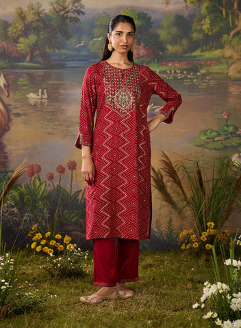 • Straight kurta with all-over chevron bandhani-inspired print and gold foil detailing