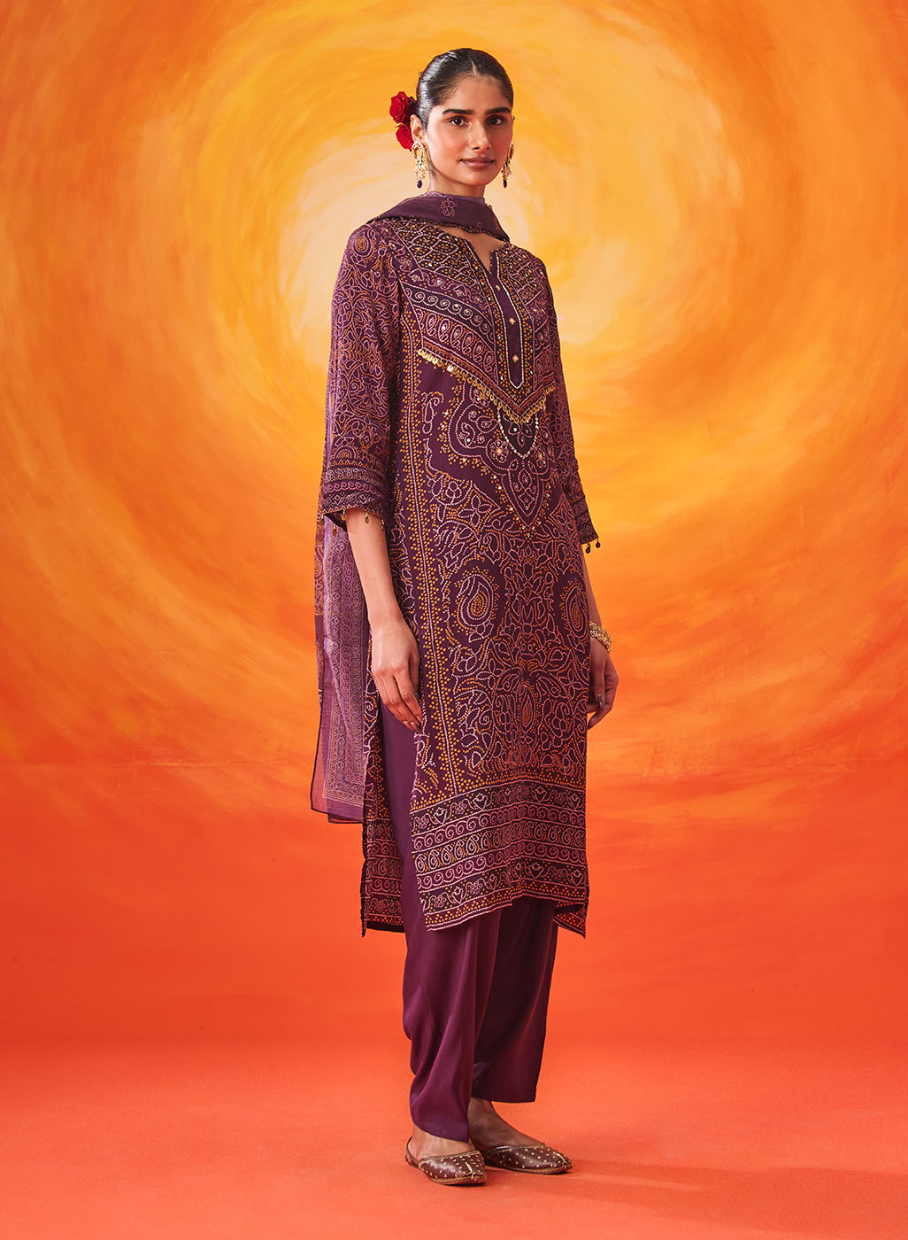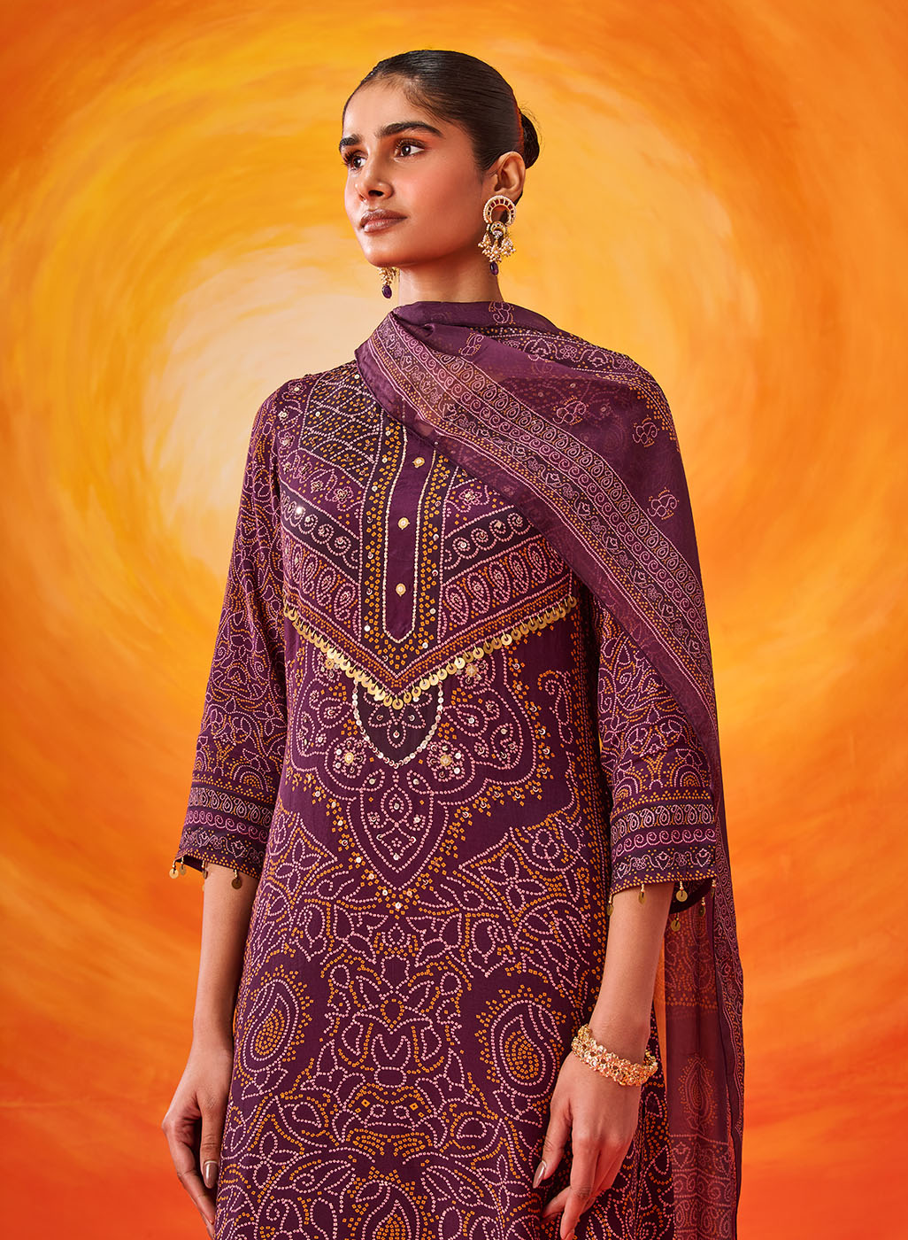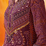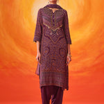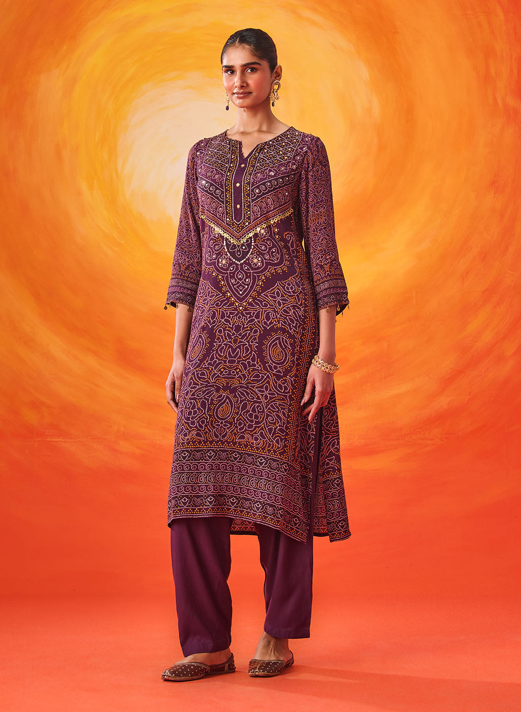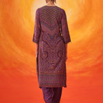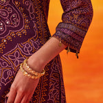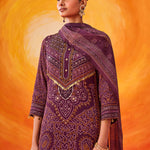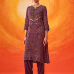 Rich and festive, this purple printed suit set blends traditional prints with an easy, comfortable silhouette. The Bandhani-inspired motifs, elevated with bead and sequin accents, make it an easy pick for celebrations that stretch from day to evening.