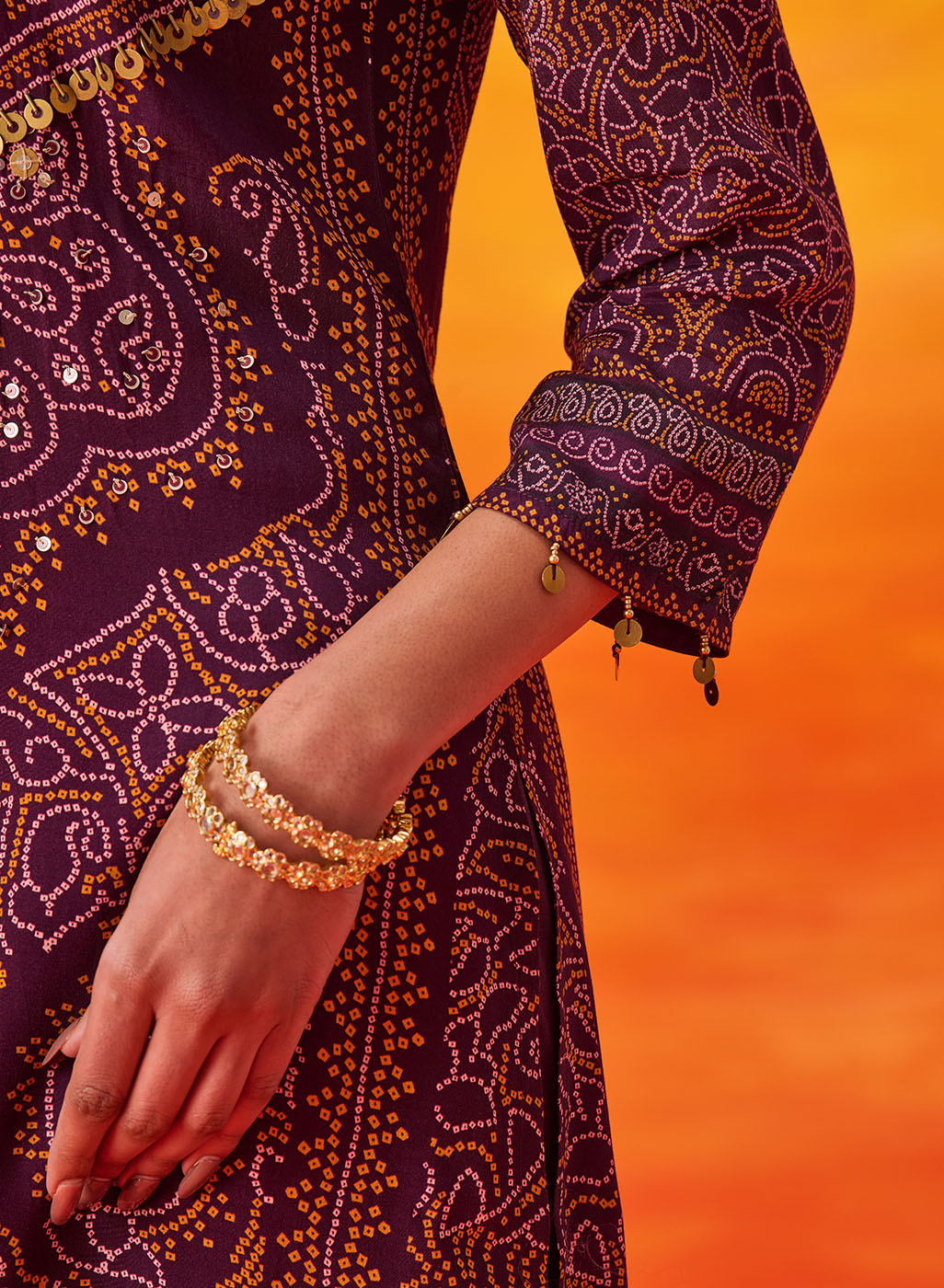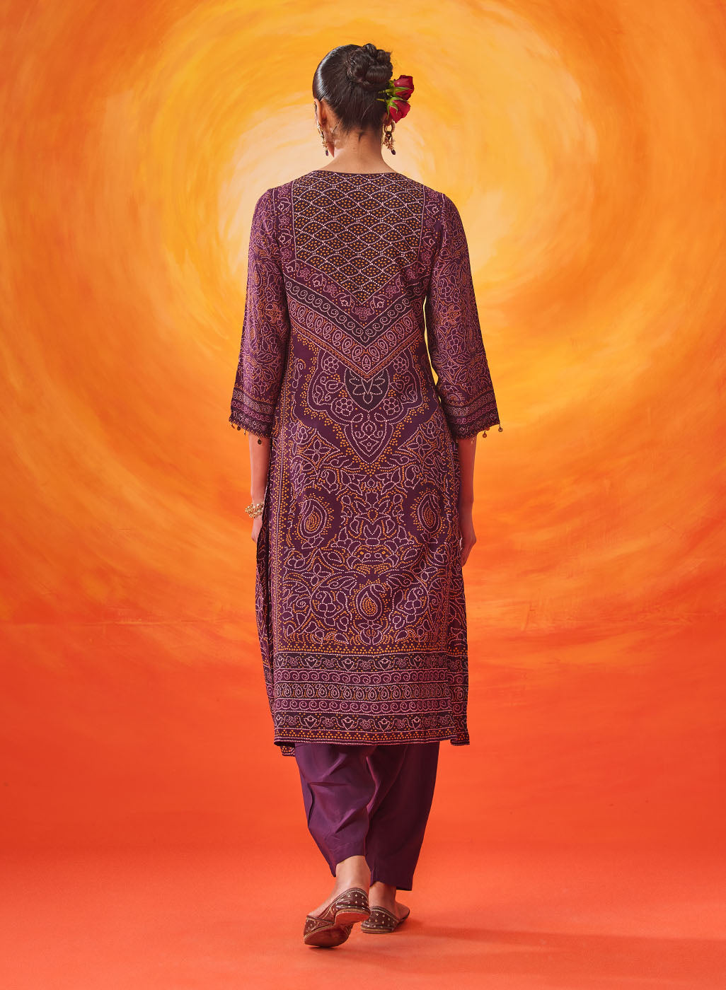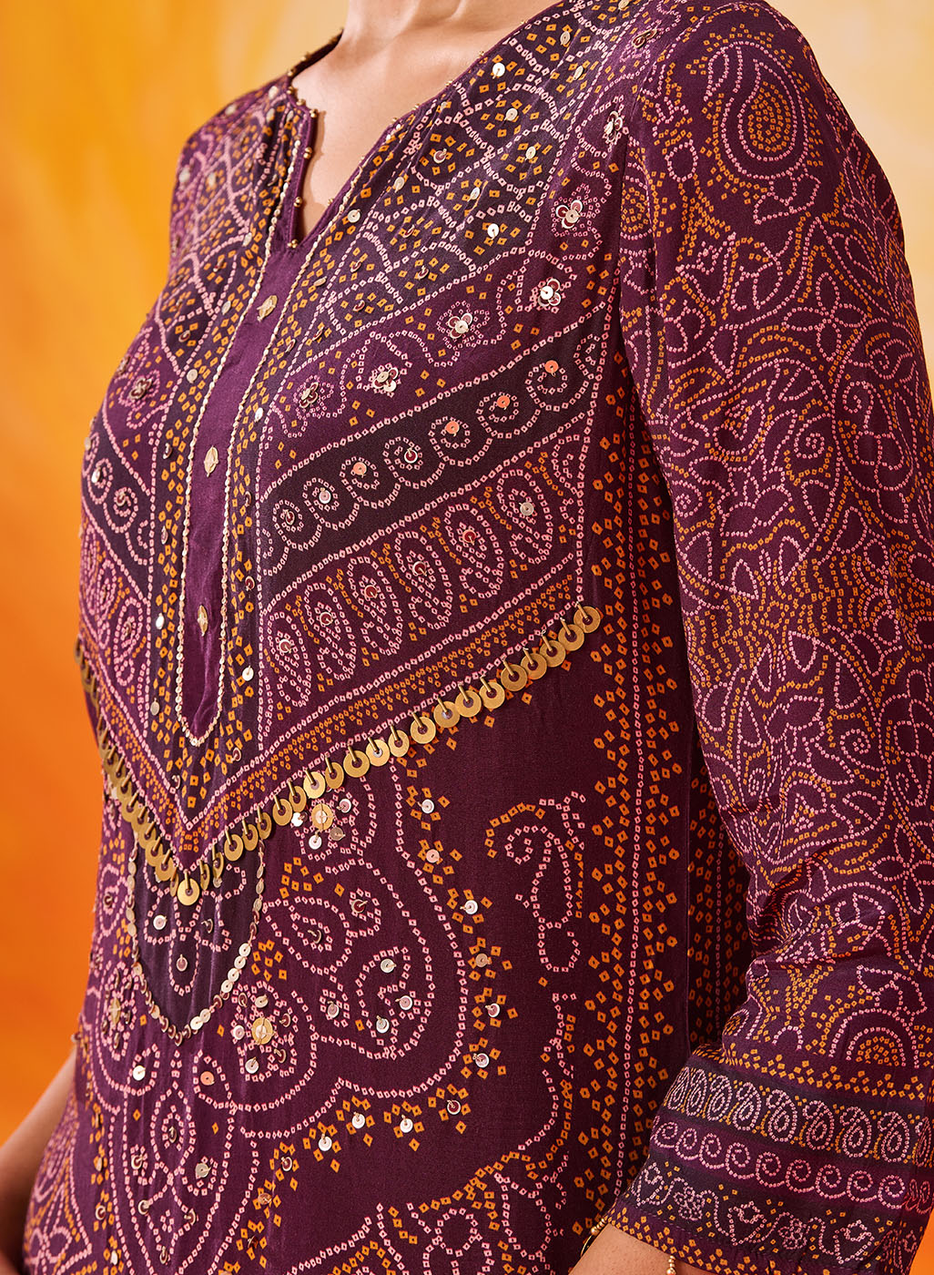 Rich and festive, this purple printed suit set blends traditional prints with an easy, comfortable silhouette. The Bandhani-inspired motifs, elevated with bead and sequin accents, make it an easy pick for celebrations that stretch from day to evening.