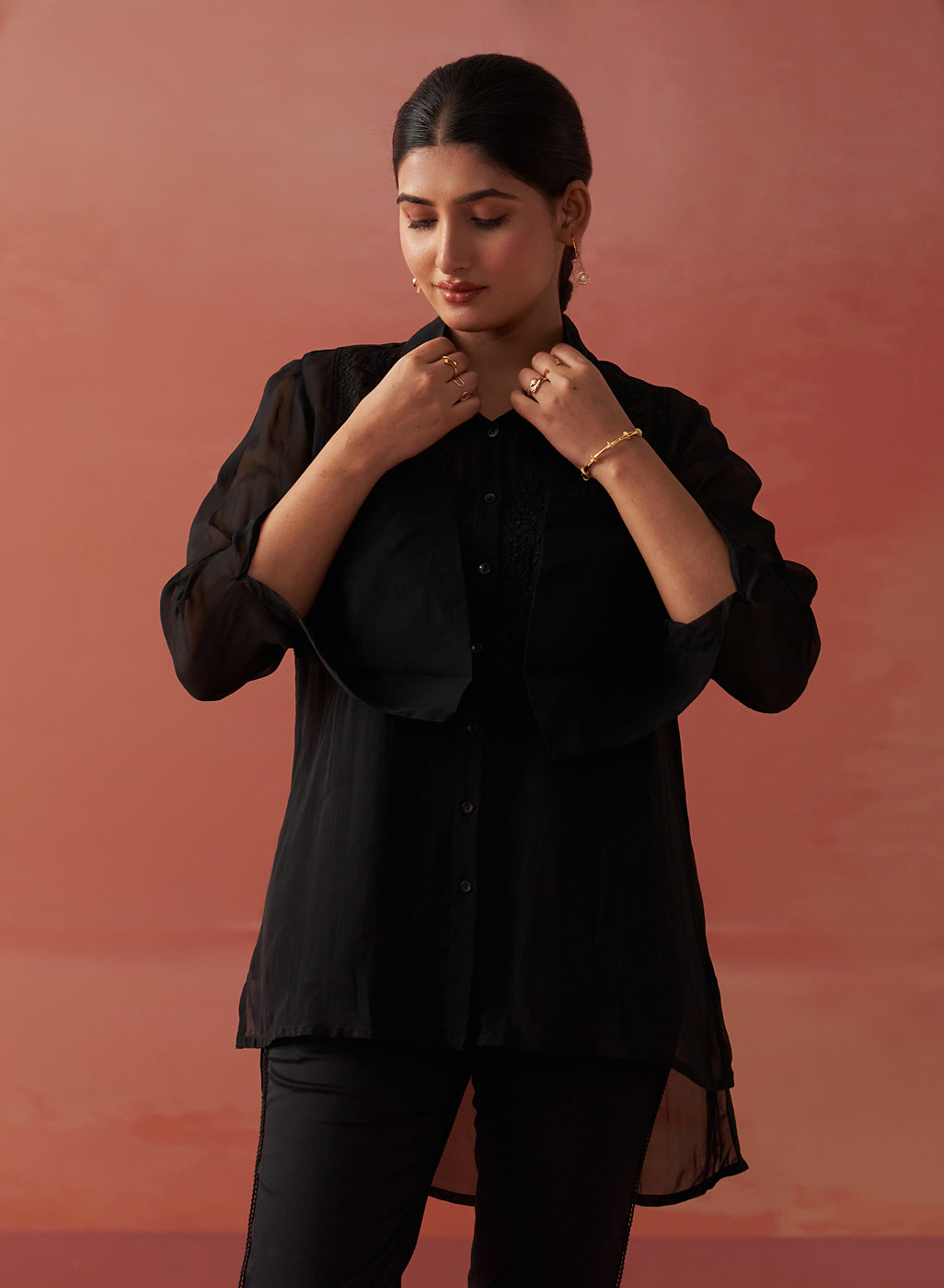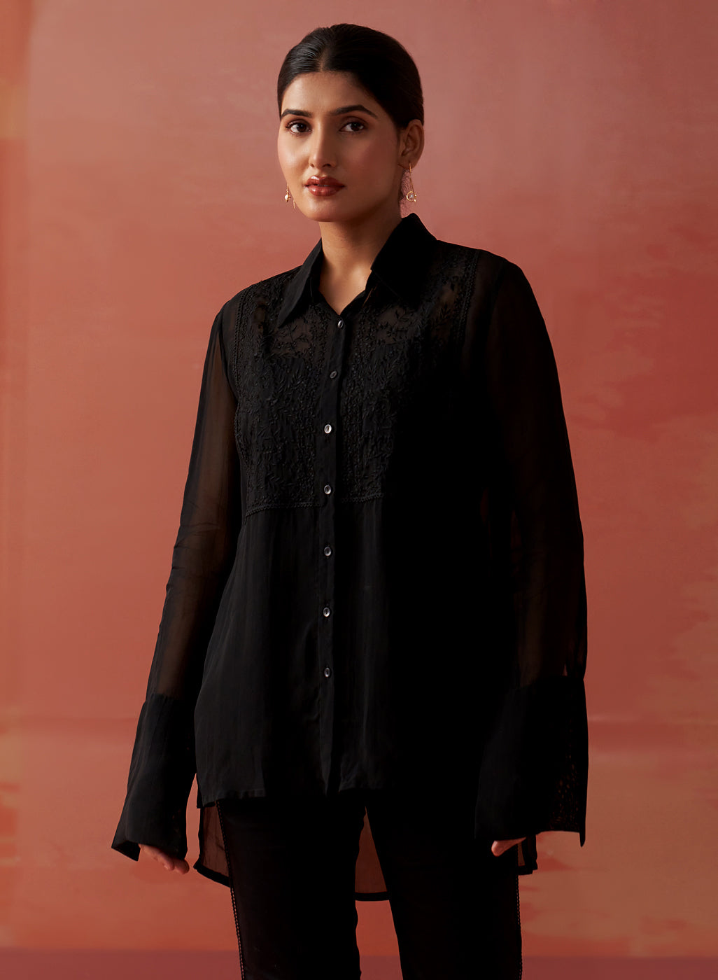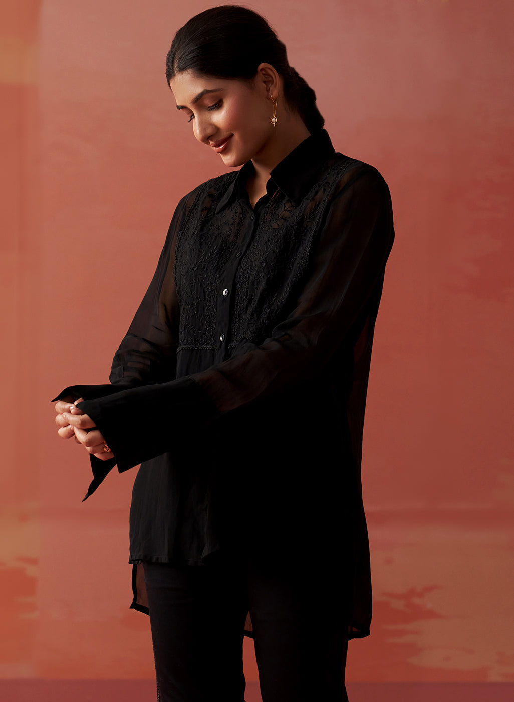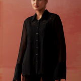 This ruby Black evening shirt, made from lightweight sheer organza, features delicate monochrome thread embroidery along the collar neckline.
