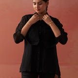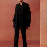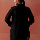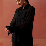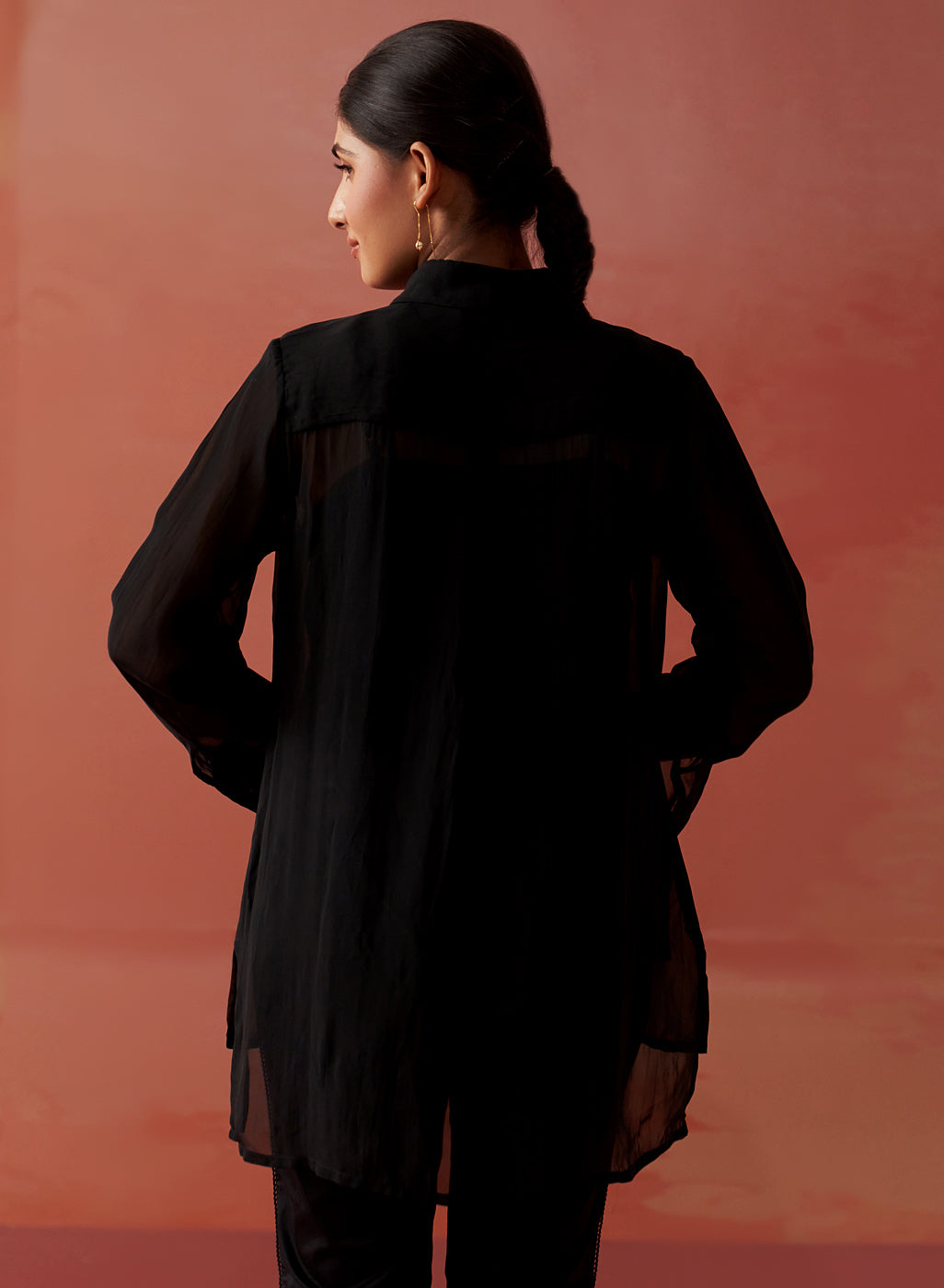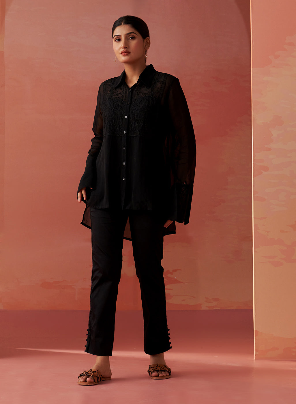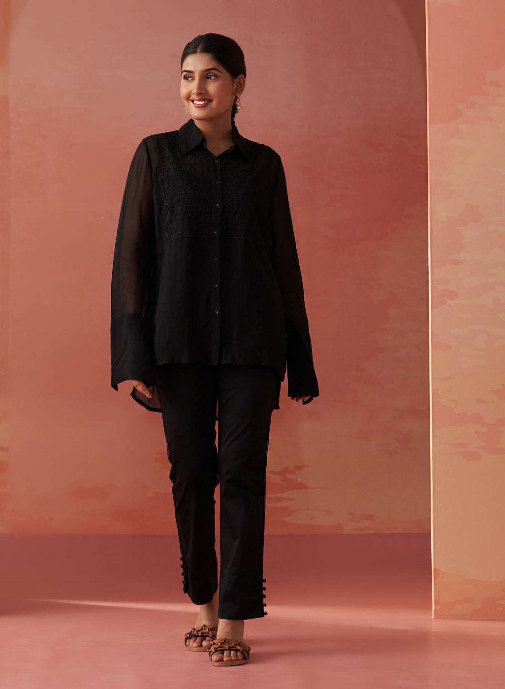 This ruby Black evening shirt, made from lightweight sheer organza, features delicate monochrome thread embroidery along the collar neckline.