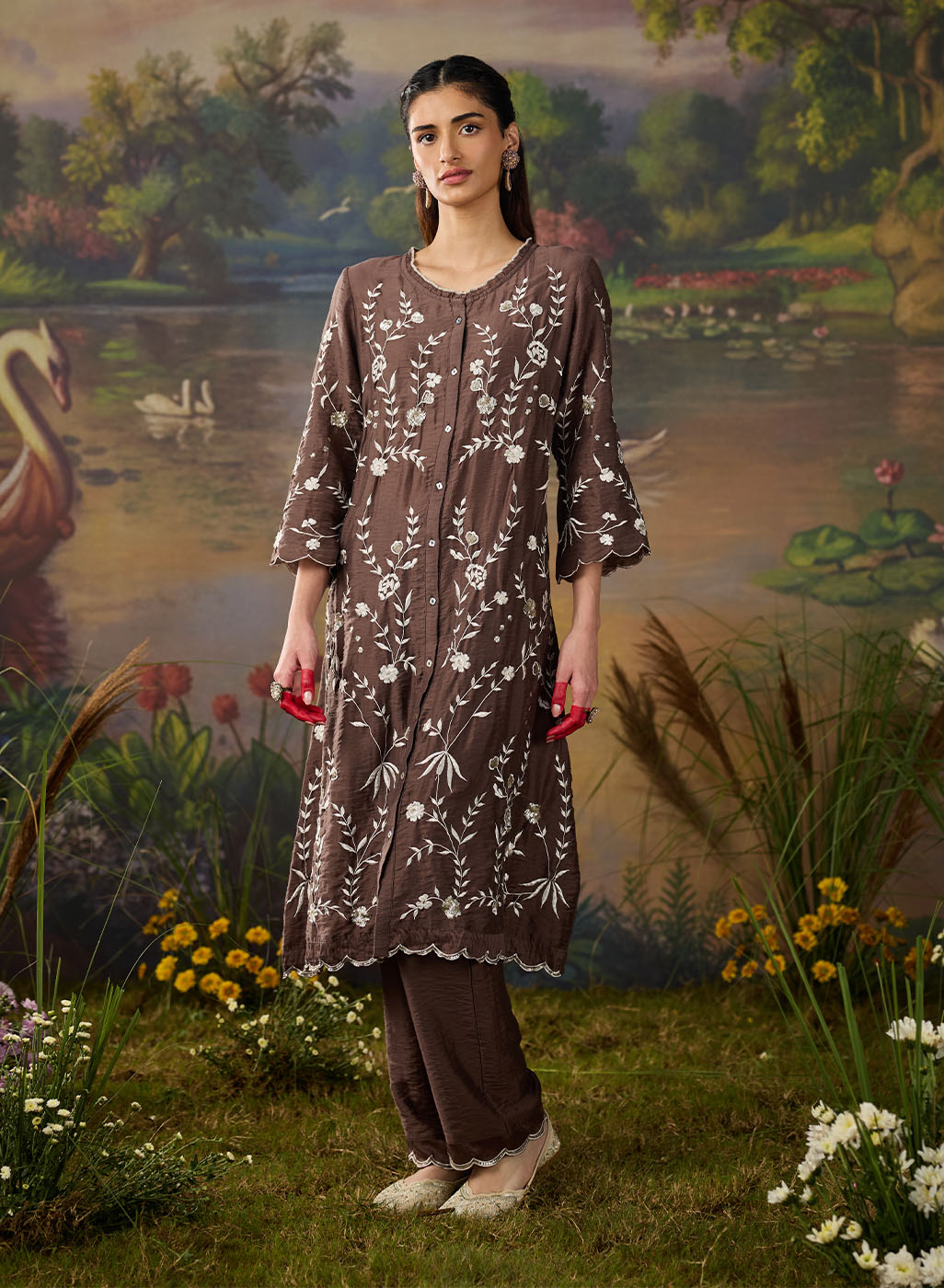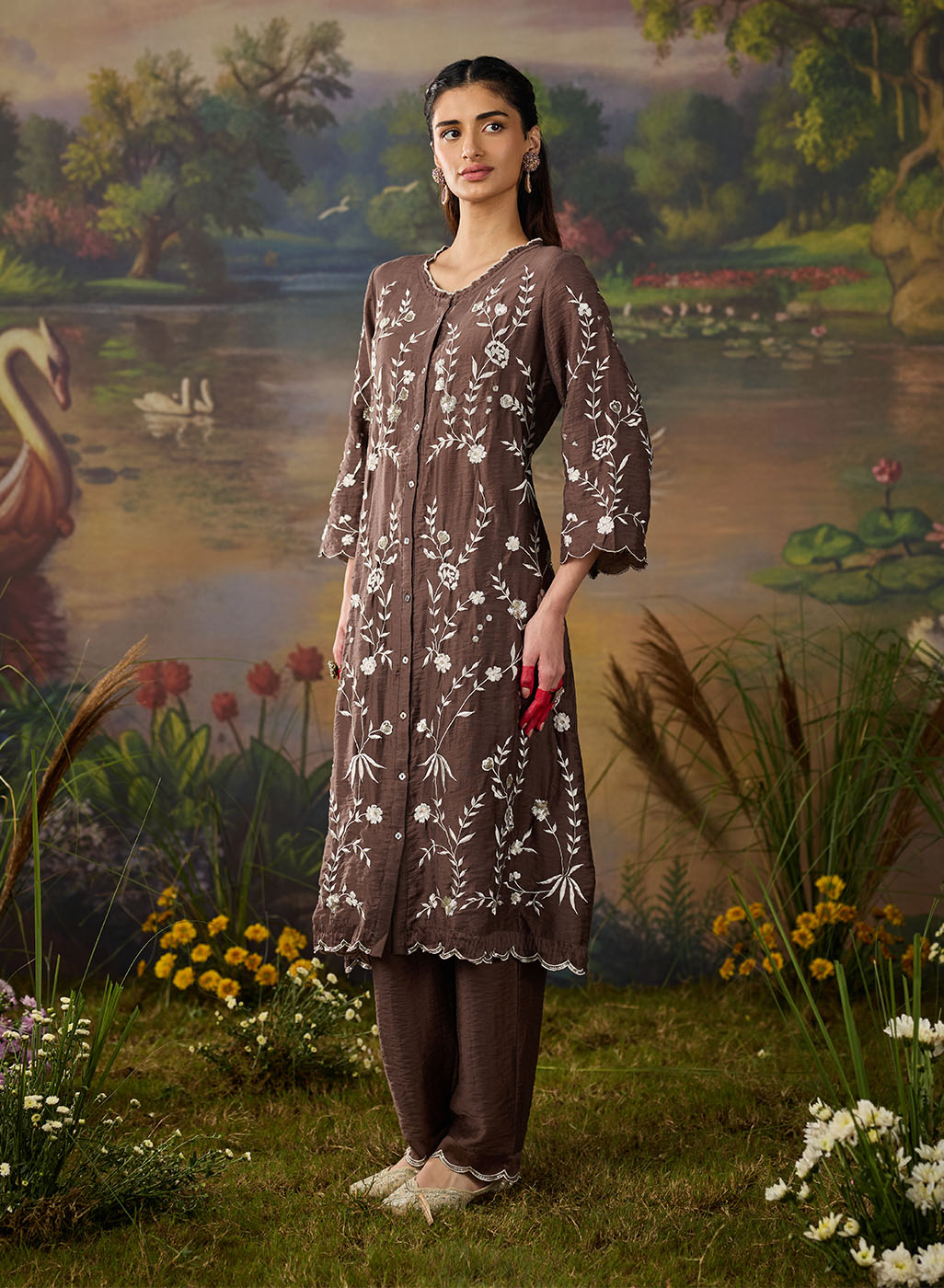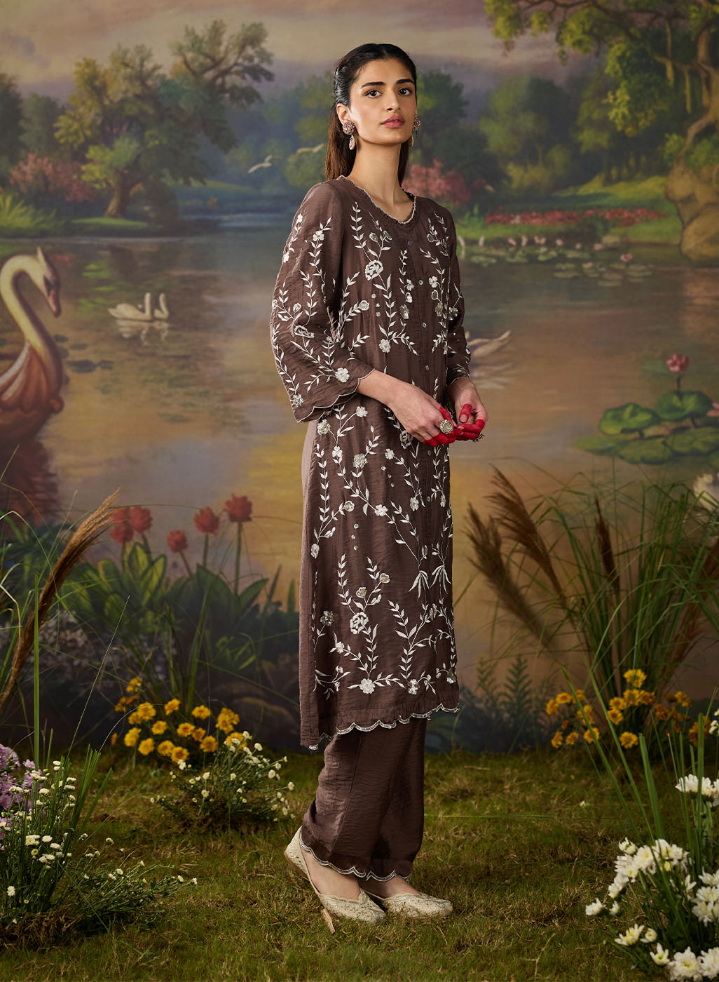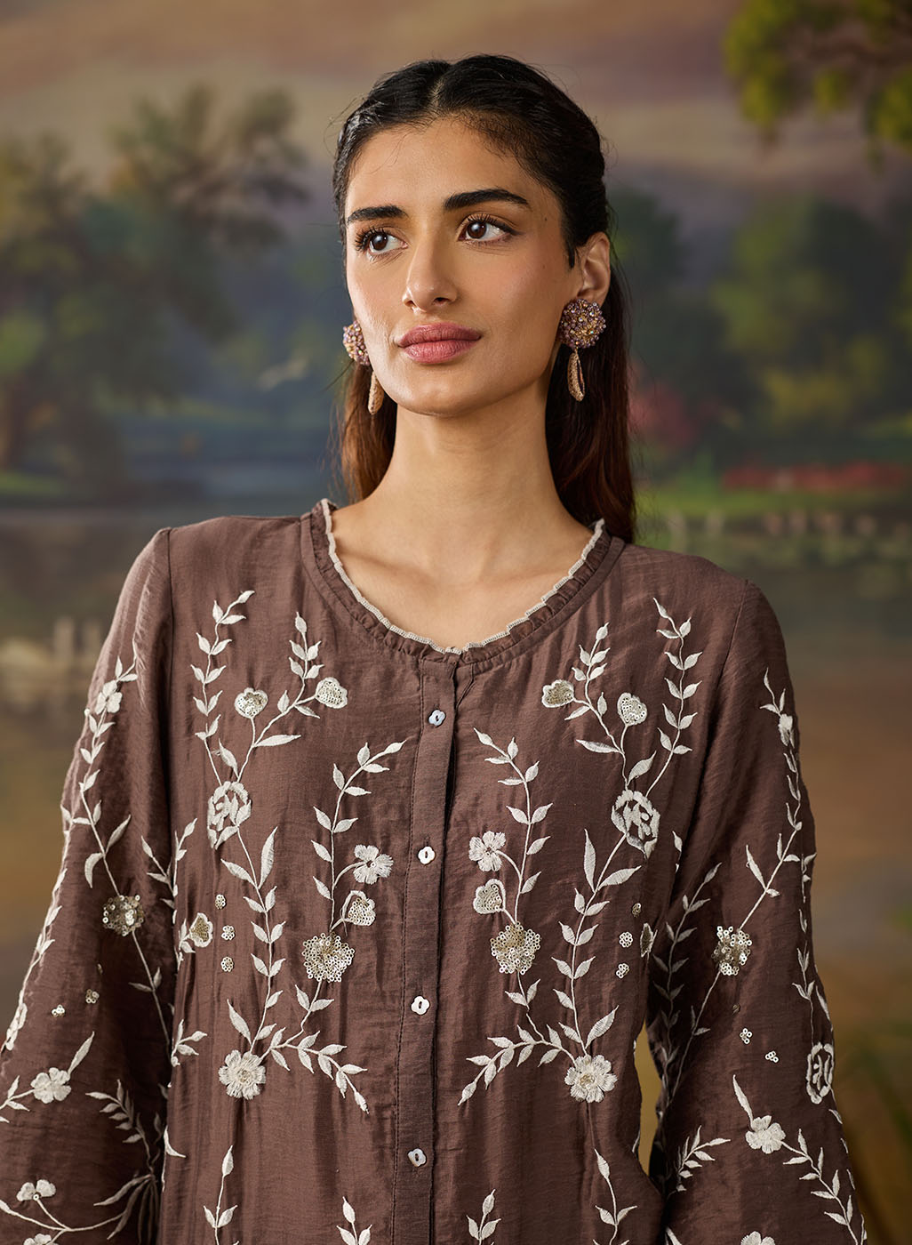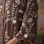 Radiating quiet opulence, this brown satin kurta set is the perfect blend of sophistication and understated glamour. The shirt-style kurta, cut in a straight silhouette, drapes fluidly with a soft sheen while intricate resham embroidery and sequin highlights lend it an artisanal charm. Delicate scalloped edges on the hem and bell sleeves elevate the design, complemented by refined pearl buttons and ruffle detailing at the neckline. Paired with straight bottoms with embroidered scalloped hems, this set balances elegance with ease; ideal for both festive evenings and elevated everyday dressing.