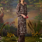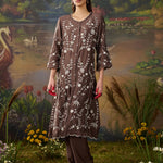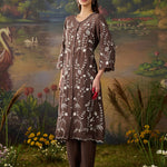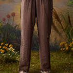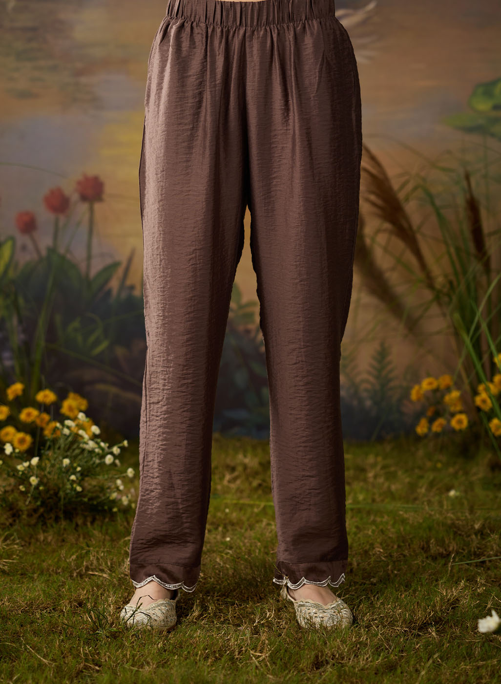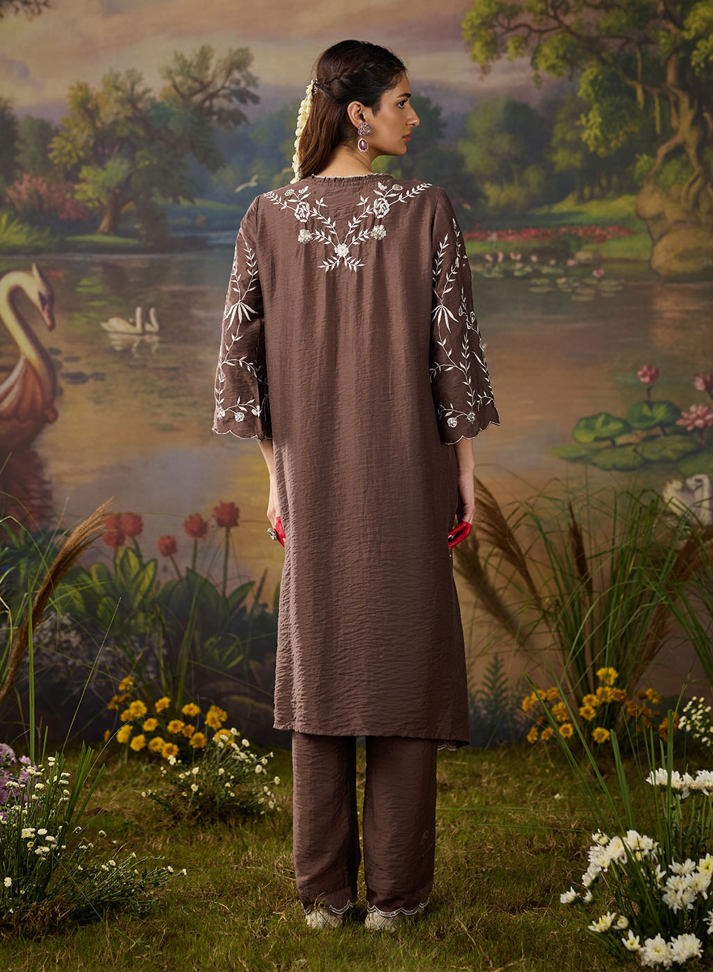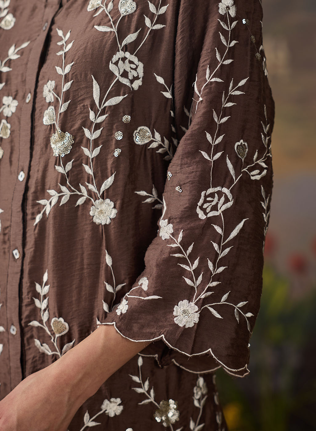 Radiating quiet opulence, this brown satin kurta set is the perfect blend of sophistication and understated glamour. The shirt-style kurta, cut in a straight silhouette, drapes fluidly with a soft sheen while intricate resham embroidery and sequin highlights lend it an artisanal charm. Delicate scalloped edges on the hem and bell sleeves elevate the design, complemented by refined pearl buttons and ruffle detailing at the neckline. Paired with straight bottoms with embroidered scalloped hems, this set balances elegance with ease; ideal for both festive evenings and elevated everyday dressing.