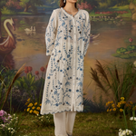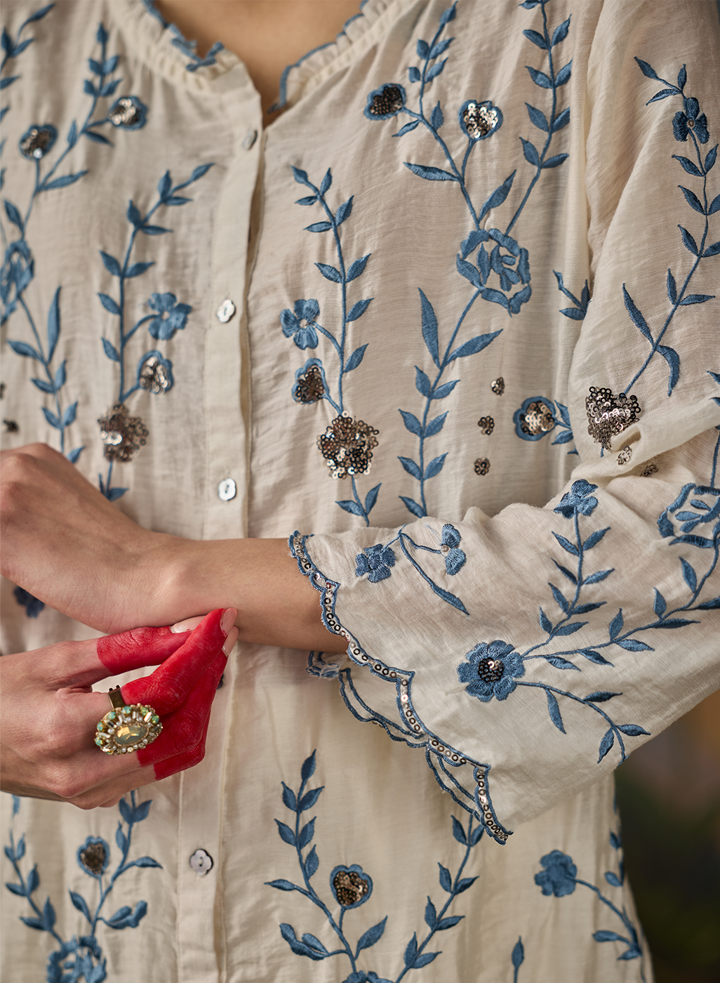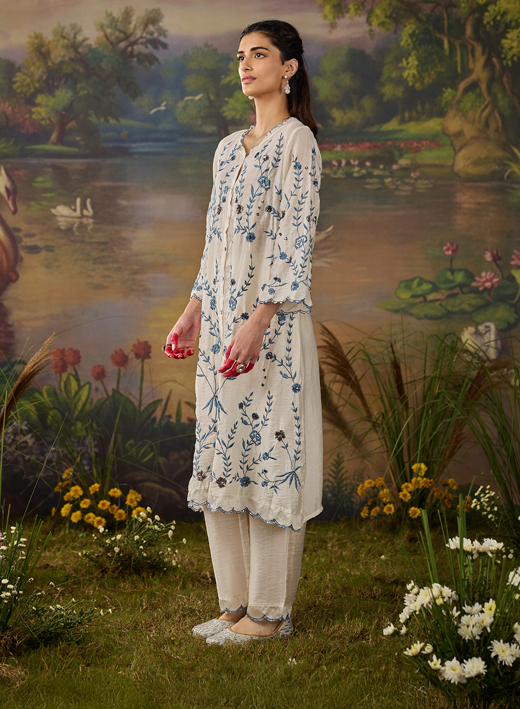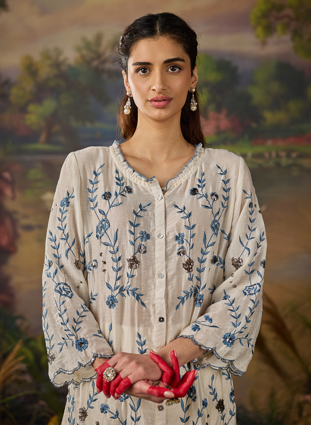 A vision of refined elegance, this ivory satin kurta set is brought to life with vibrant jewel-tone embroidery that adds a striking pop of colour against its serene base. The straight, shirt-style kurta exudes fluid grace with its soft sheen, enhanced by the resham embroidery and sequin highlights. Scalloped edges on the bell sleeves and hem lend a delicate finish, while pearl buttons and ruffle detailing at the neckline infuse it with a feminine charm. Paired with straight mid-rise bottoms featuring embroidered scalloped hems, this set is a timeless yet contemporary choice for occasions where subtlety meets statement.