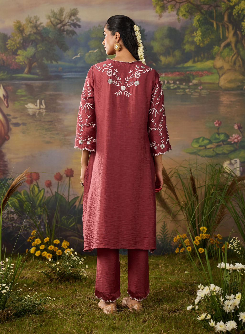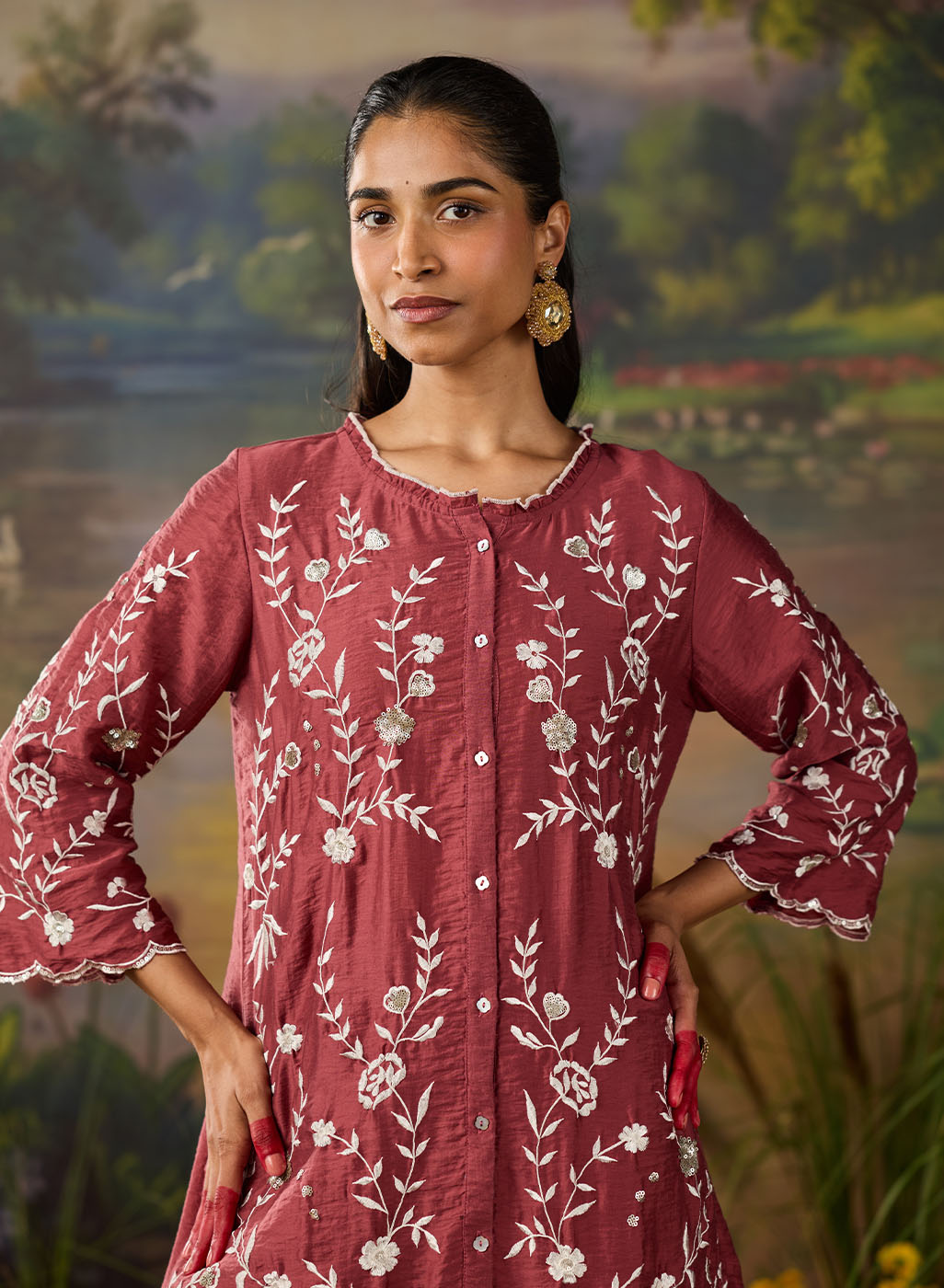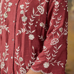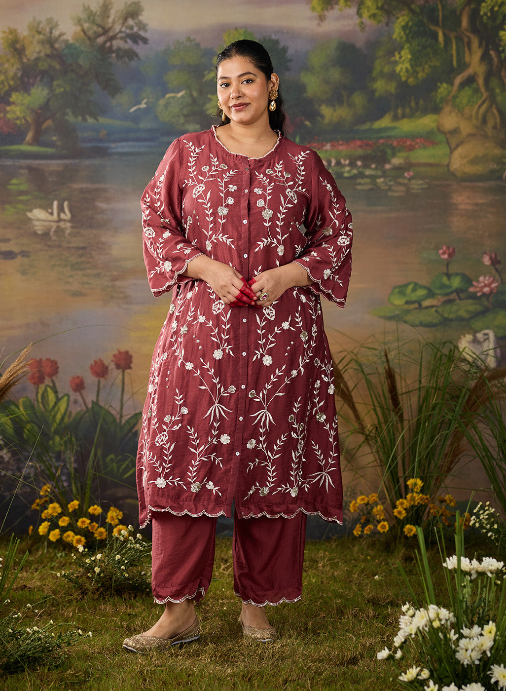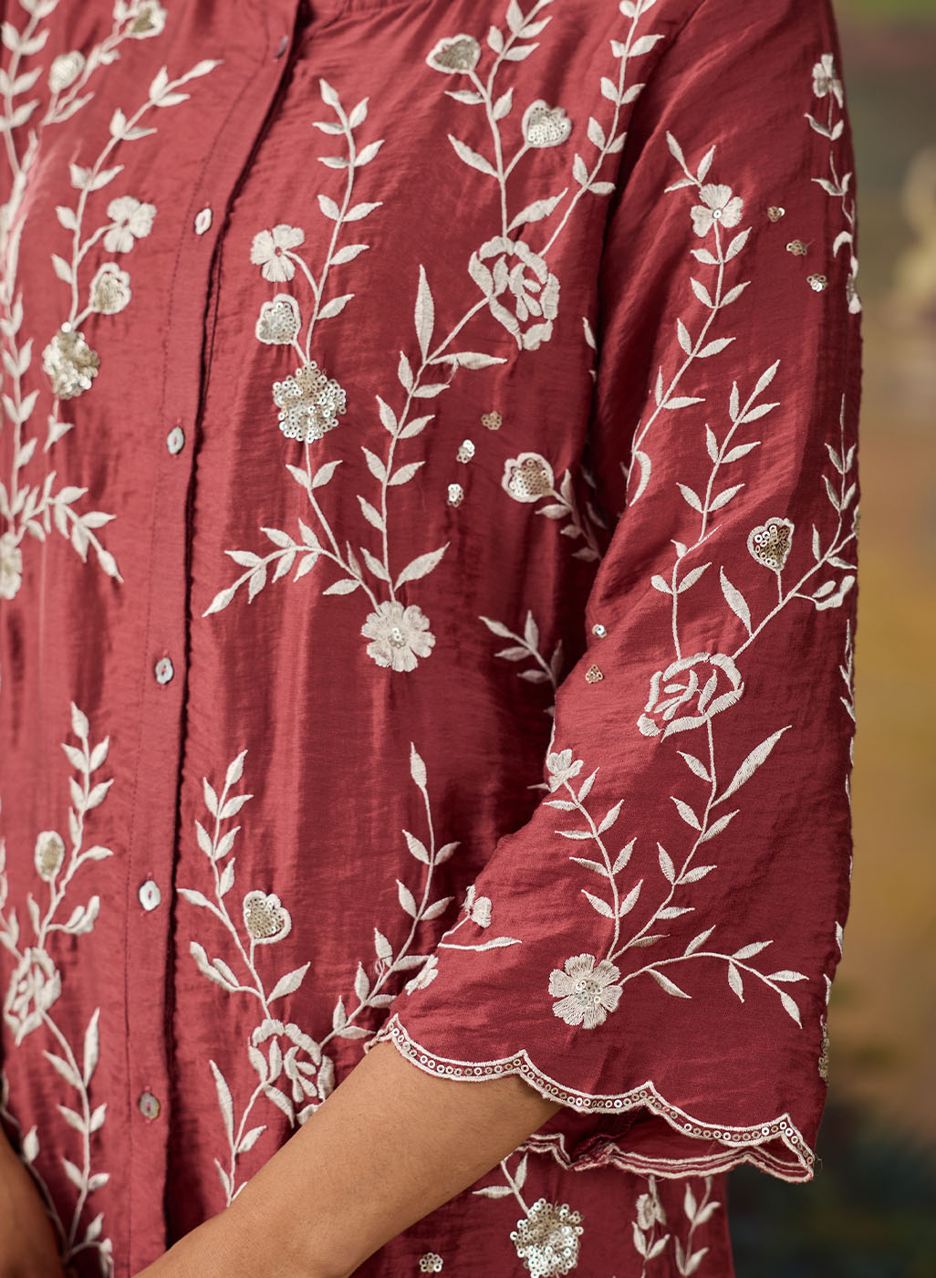 Radiating quiet opulence, this maroon satin kurta set is the perfect blend of sophistication and understated glamour. The shirt-style kurta, cut in a straight silhouette, drapes fluidly with a soft sheen while intricate resham embroidery and sequin highlights lend it an artisanal charm. Delicate scalloped edges on the hem and bell sleeves elevate the design, complemented by refined pearl buttons and ruffle detailing at the neckline. Paired with straight bottoms with embroidered scalloped hems, this set balances elegance with ease; ideal for both festive evenings and elevated everyday dressing.