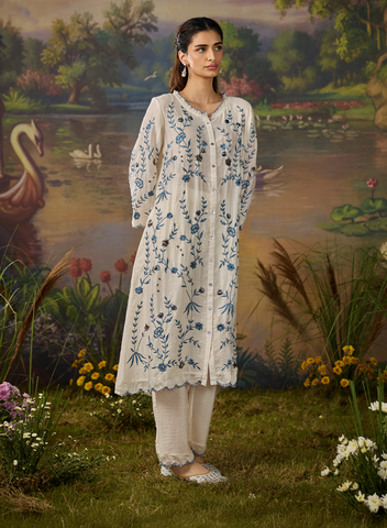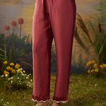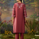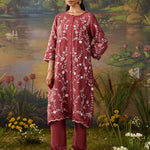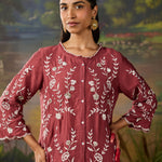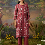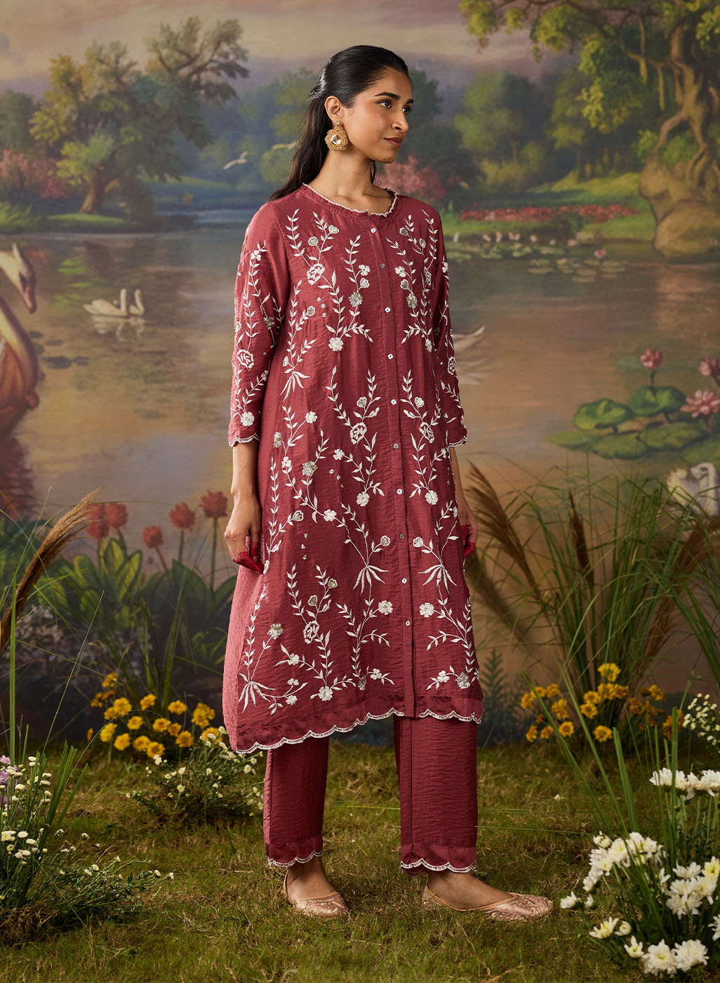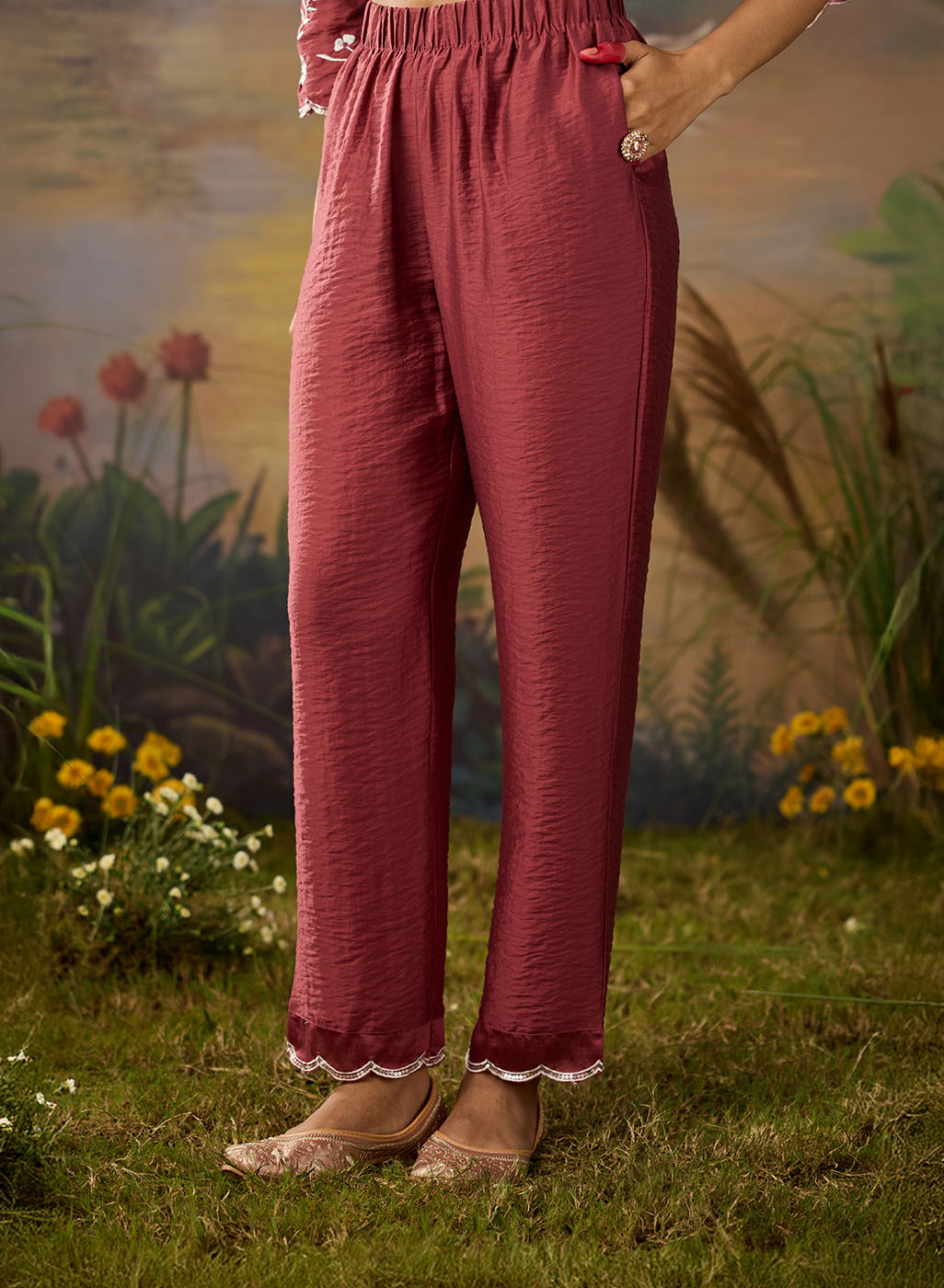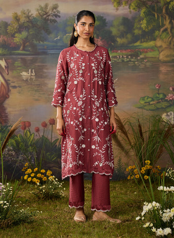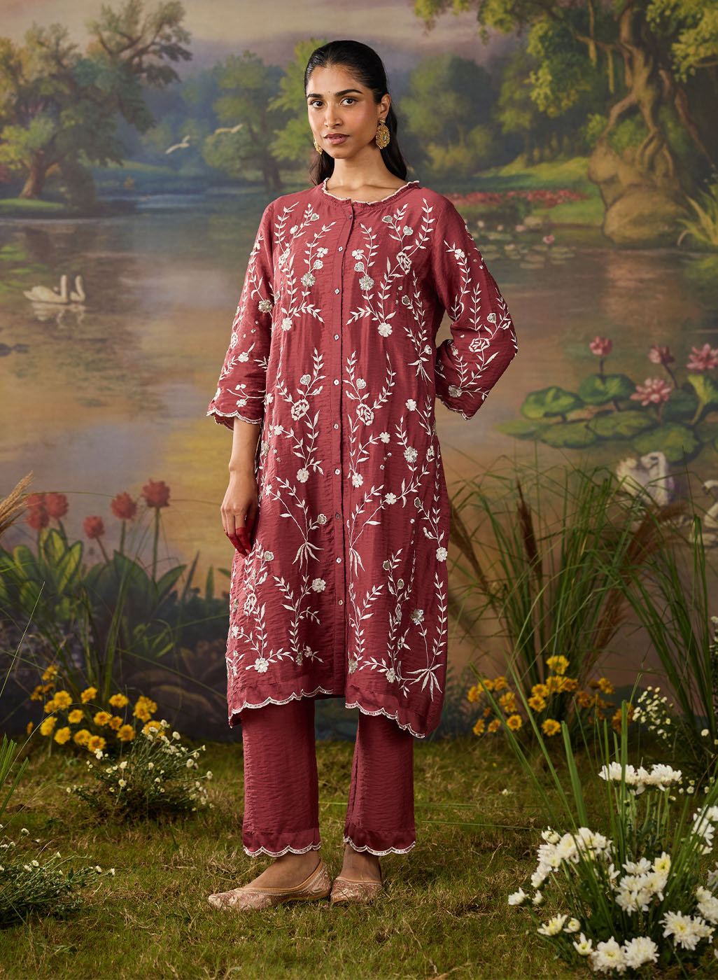 Radiating quiet opulence, this maroon satin kurta set is the perfect blend of sophistication and understated glamour. The shirt-style kurta, cut in a straight silhouette, drapes fluidly with a soft sheen while intricate resham embroidery and sequin highlights lend it an artisanal charm. Delicate scalloped edges on the hem and bell sleeves elevate the design, complemented by refined pearl buttons and ruffle detailing at the neckline. Paired with straight bottoms with embroidered scalloped hems, this set balances elegance with ease; ideal for both festive evenings and elevated everyday dressing.