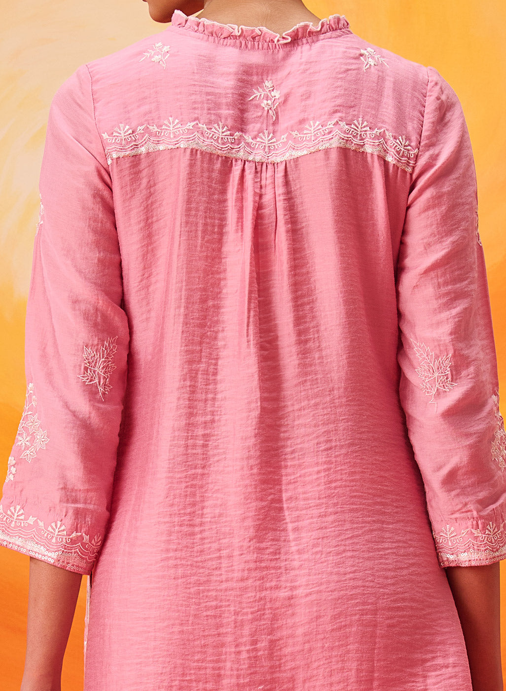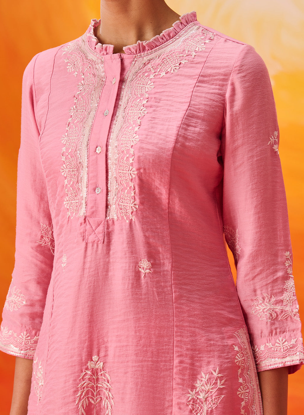 • Resham embroidery with sequin highlights on the front, neckline, sleeves and back yoke.
