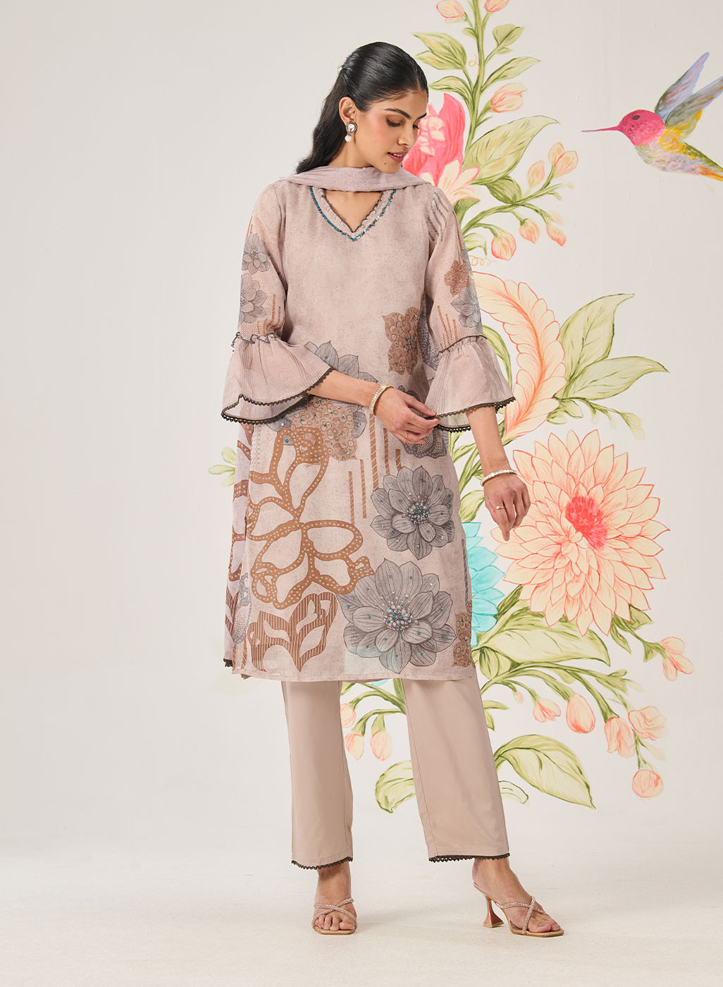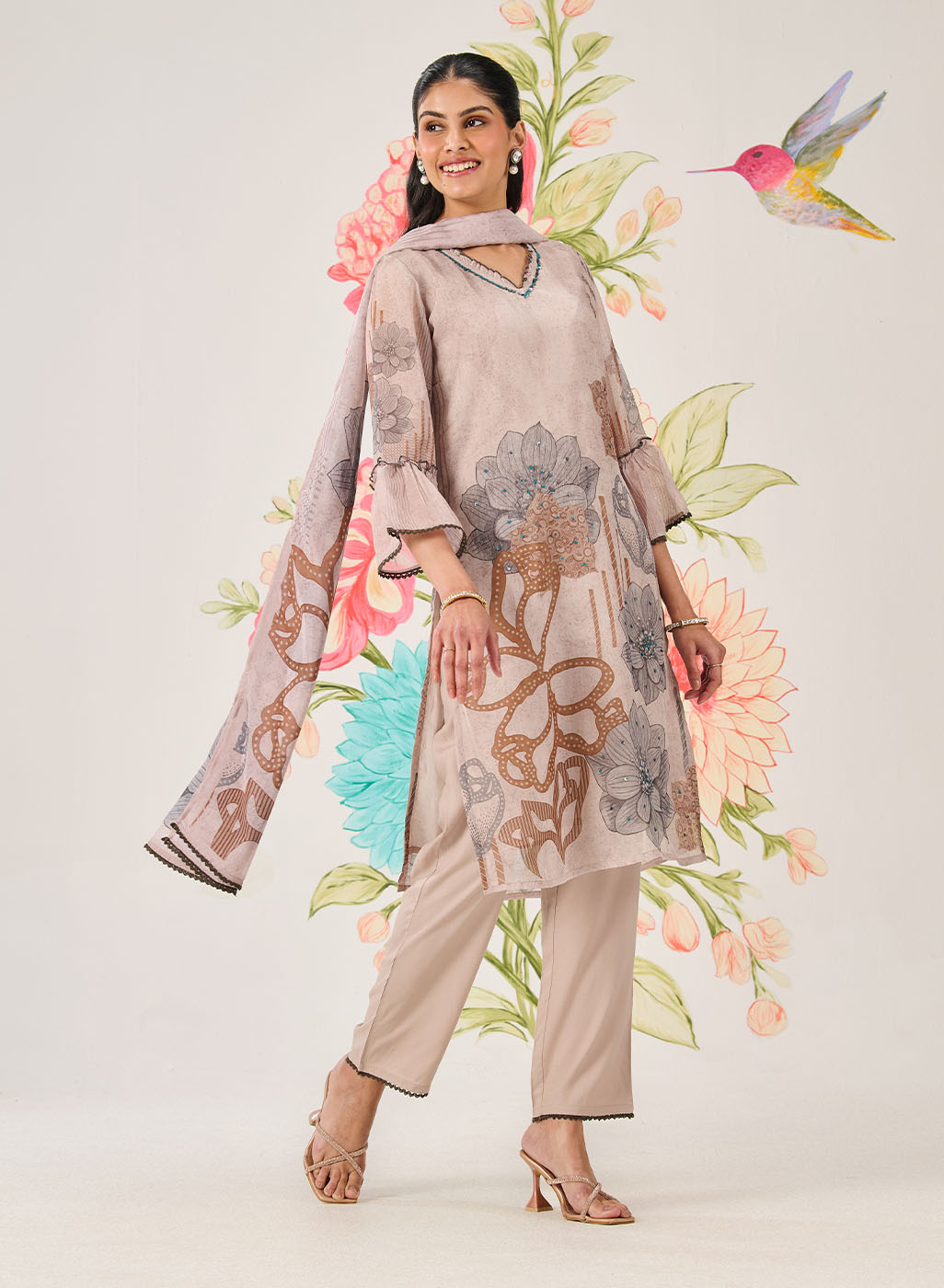Anvi Grey Floral Printed Organza Suit Set with Dupatta