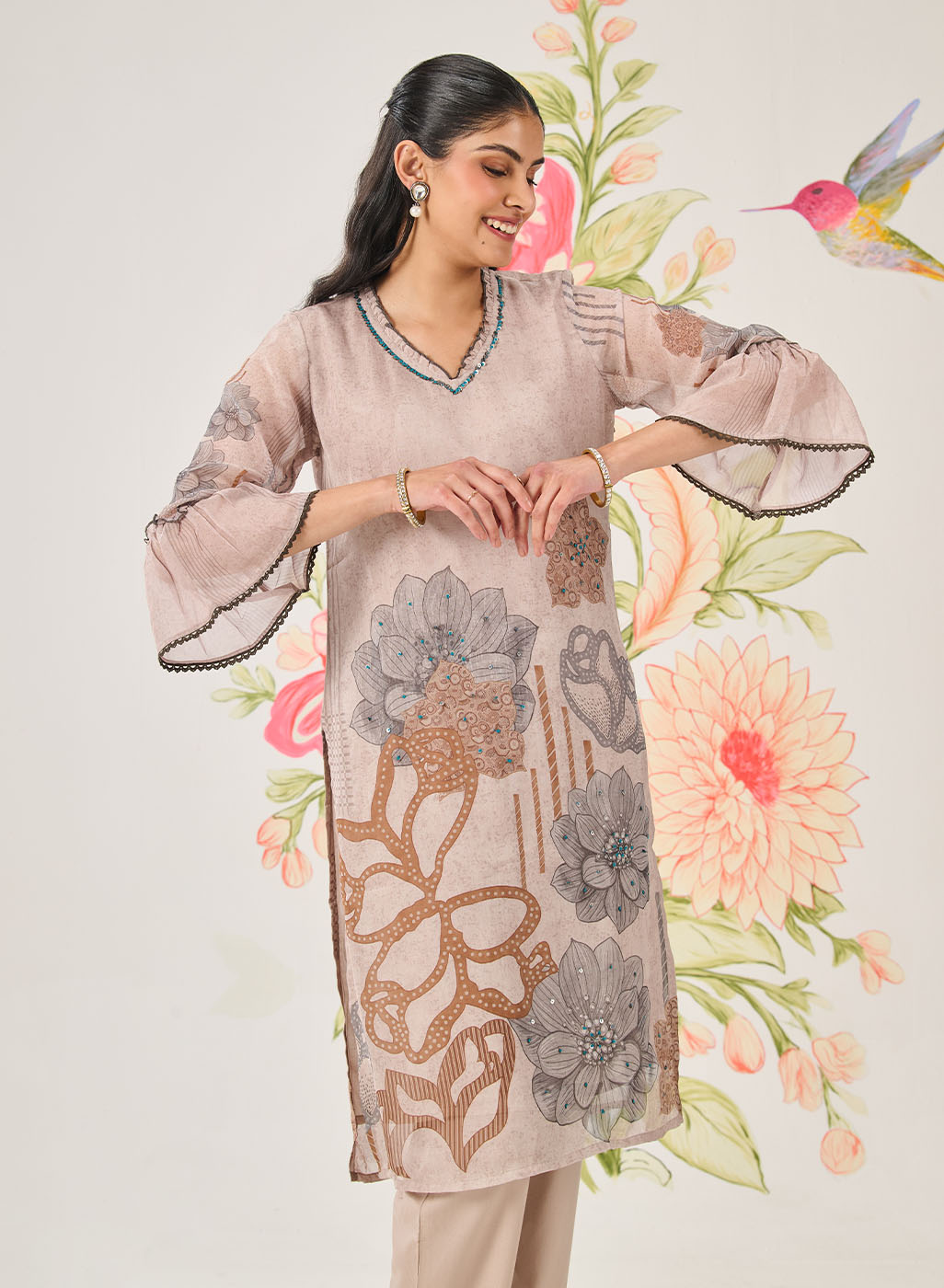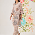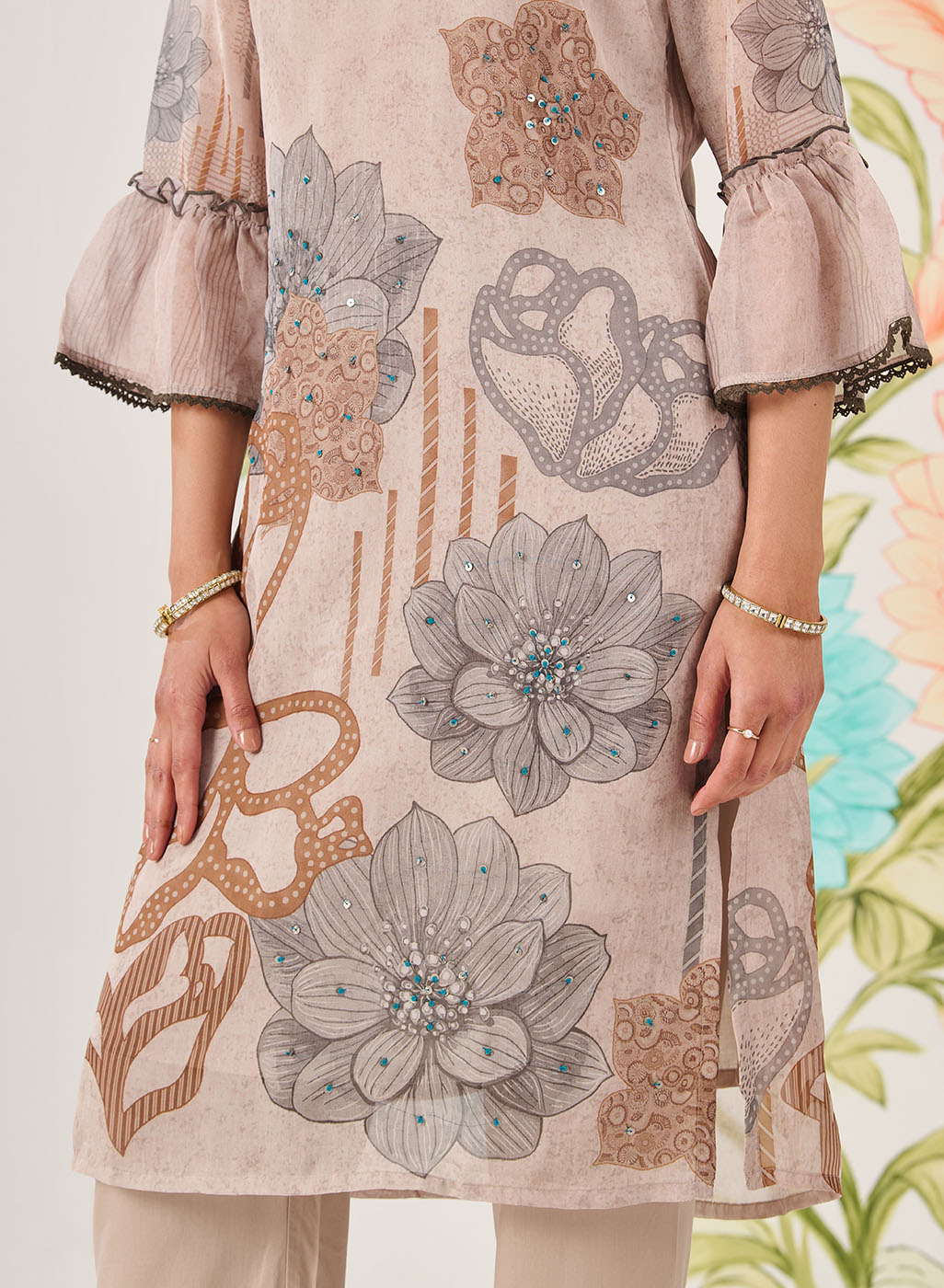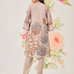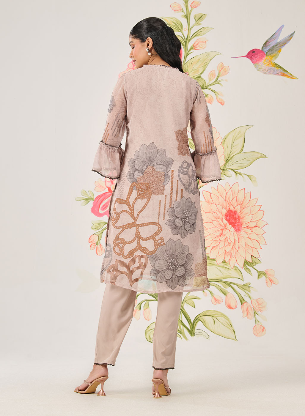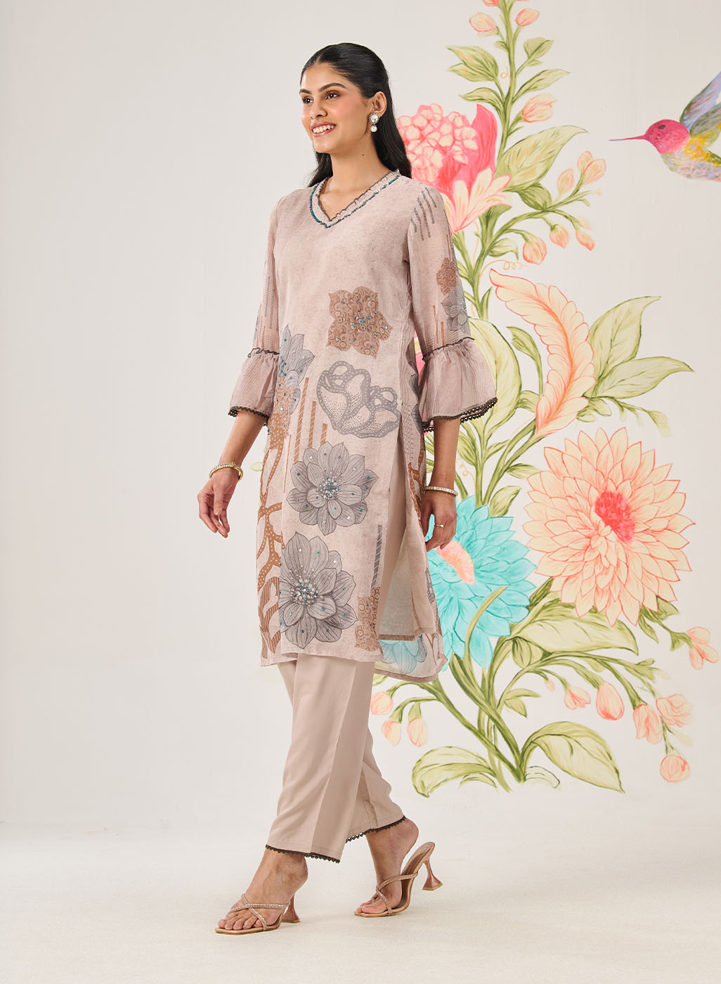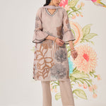 This grey organza suit set blends a contemporary minimalist colour palette with statement florals. The easy silhouette, soft frills and lace detailing make it comfortable, stylish and effortless for everyday plans and casual occasions.