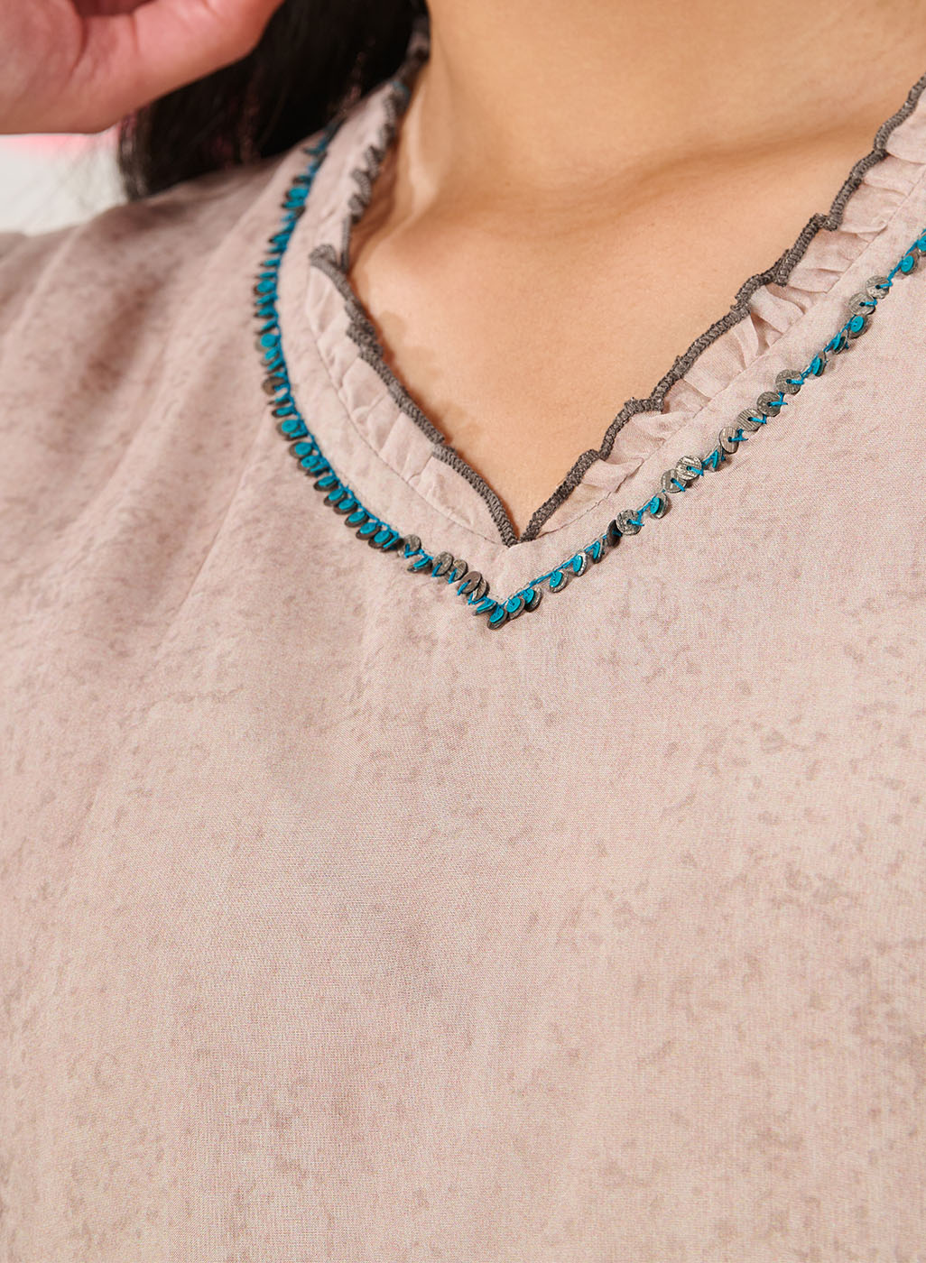 - Sequin and contrast thread highlights add gentle dimension to the print.