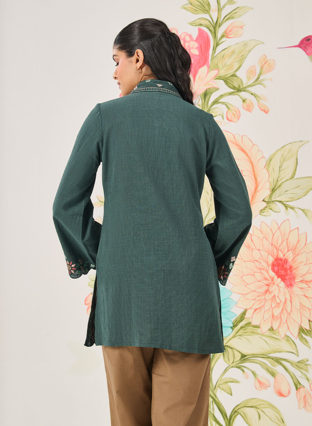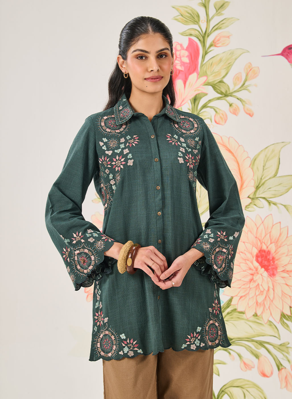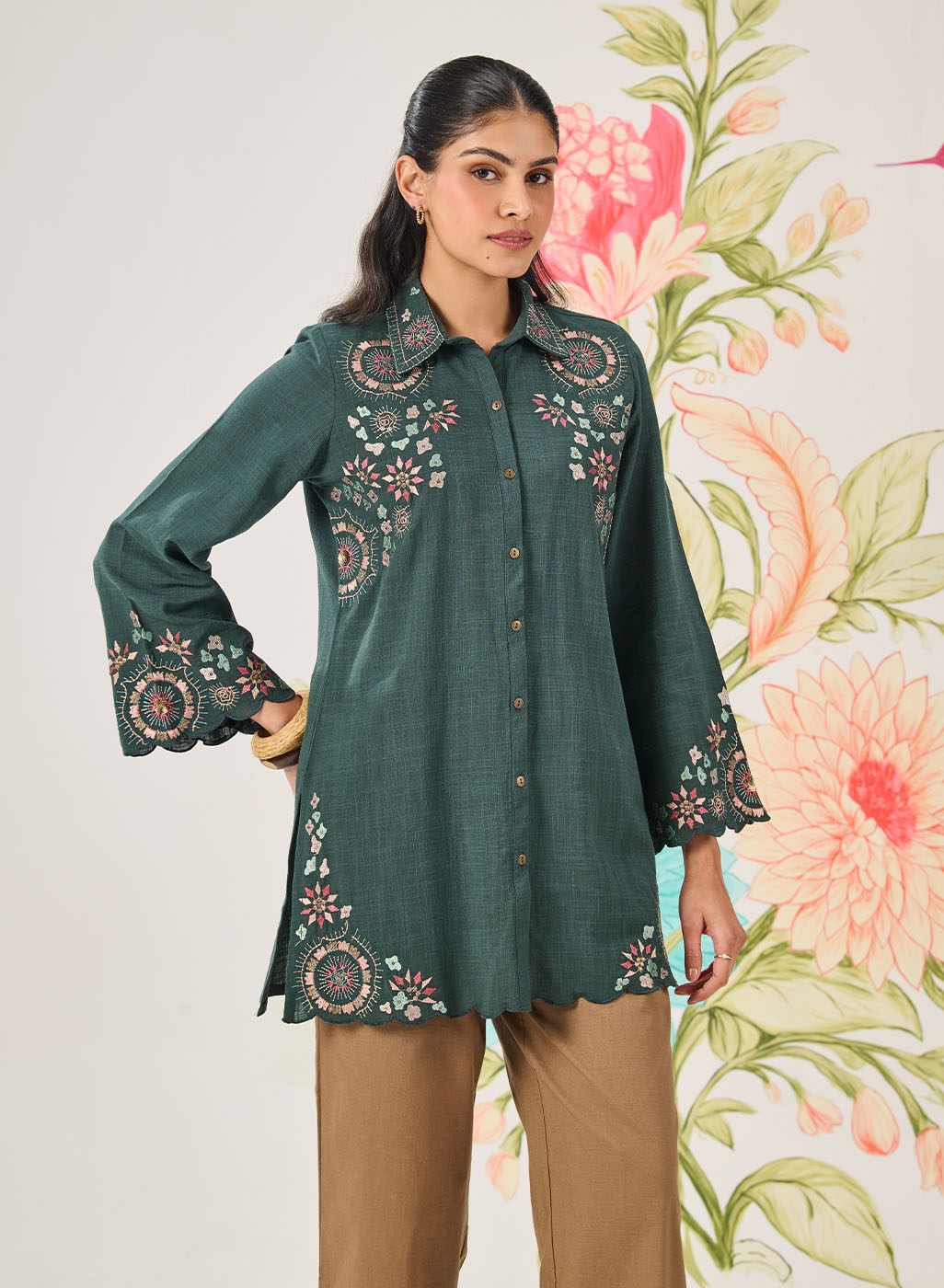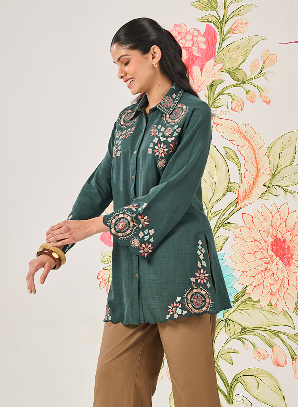 This green embroidered shirt brings together a rich tone and playful detailing, making it a great pick for days when you want comfort with character. It’s relaxed, versatile, and quietly stylish.