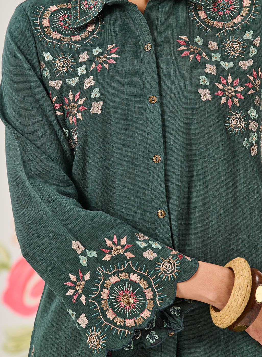 - Finished with scalloped detailing along the front placket and sleeve hems.