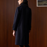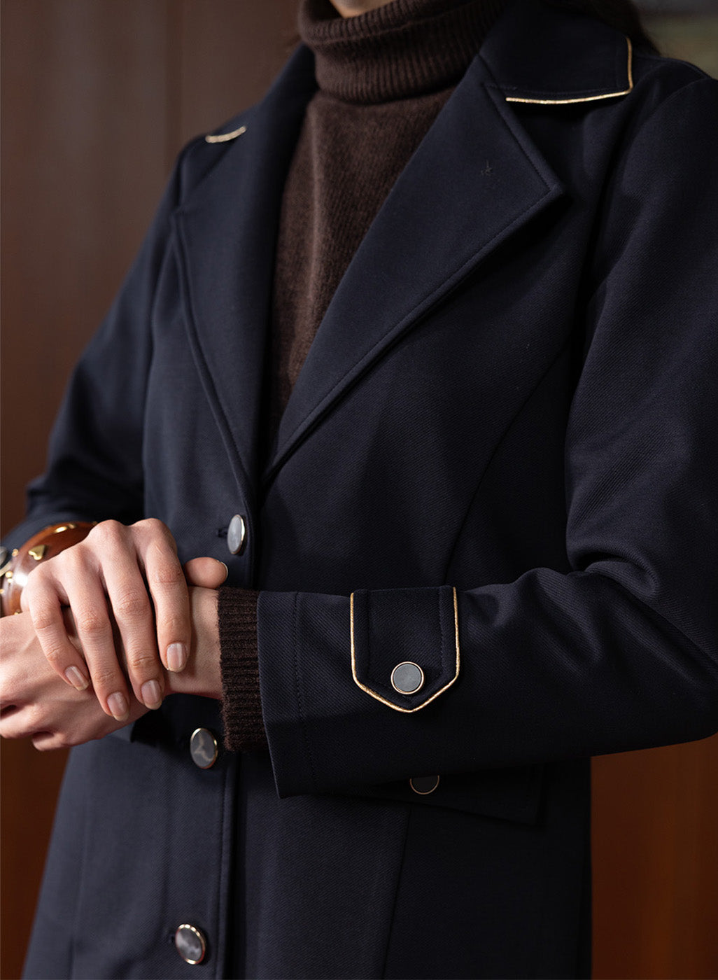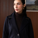 A timeless navy wool coat that blends polished elegance with everyday warmth. The notched lapel frames the silhouette beautifully, while golden piping details add a subtle hint of luxe. Finished with graceful bell sleeves and a structured shape, it’s a winter classic elevated with a refined edge.