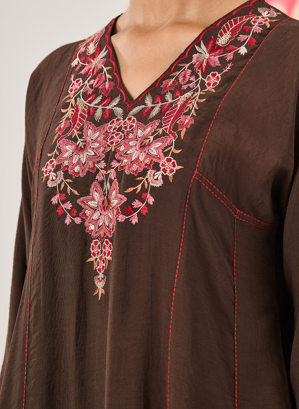 • Resham embroidery with sequin highlights along the V-neckline and sleeves.