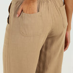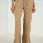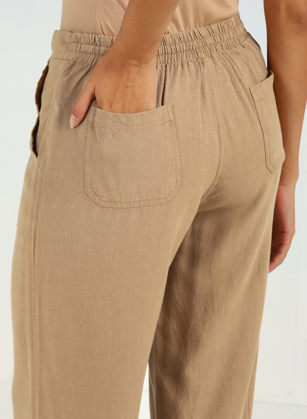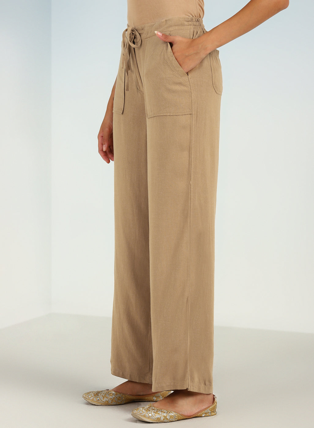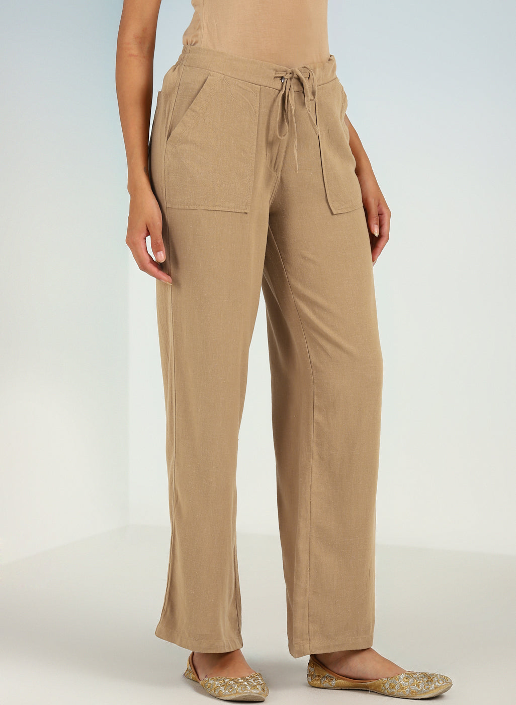 Beige Plain Straight-fit Pants with a Drawstring Waist and Pockets