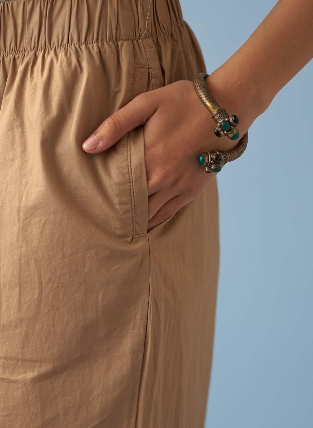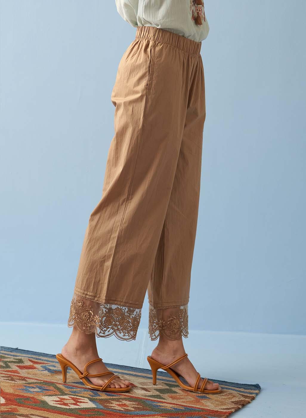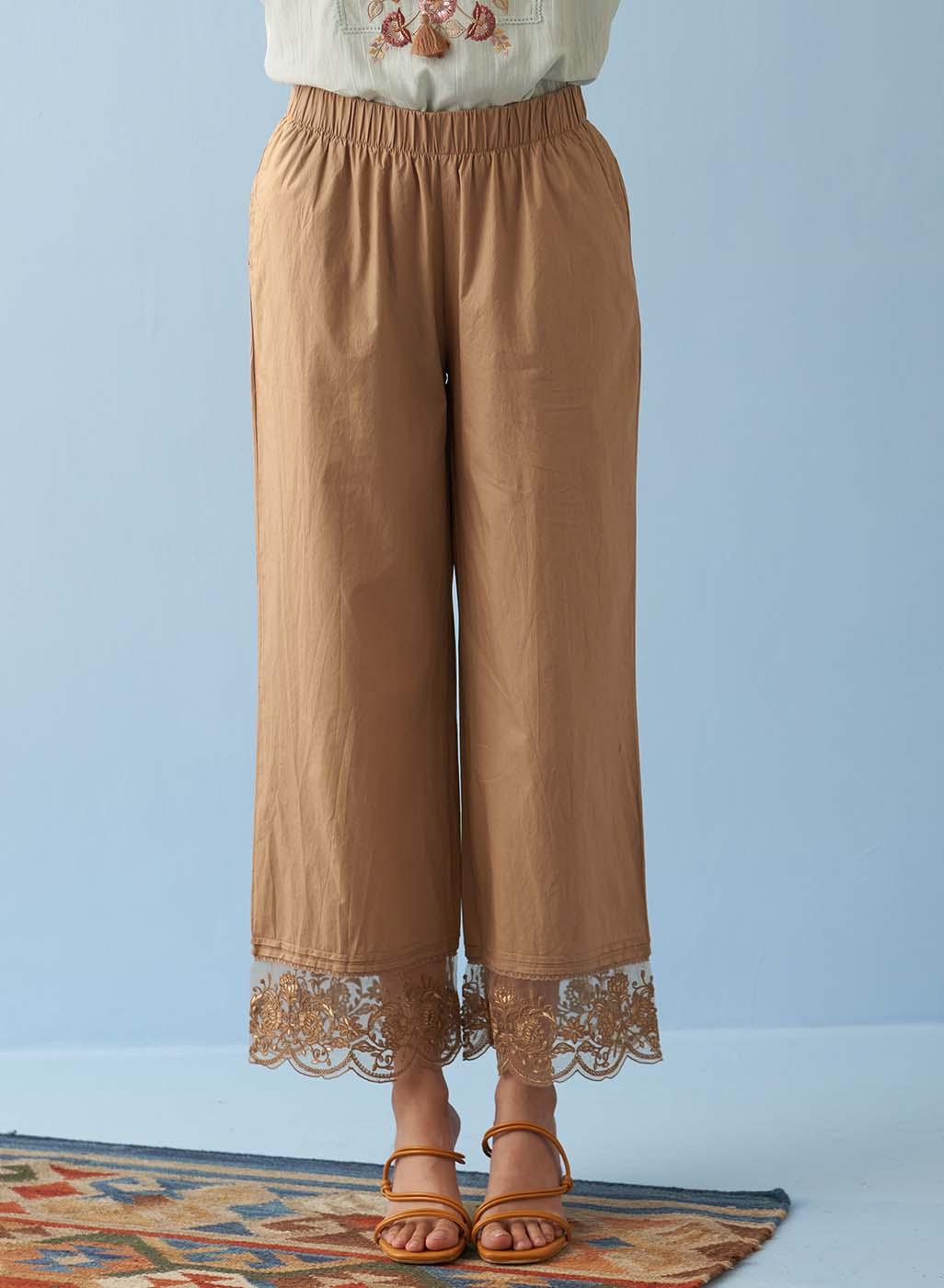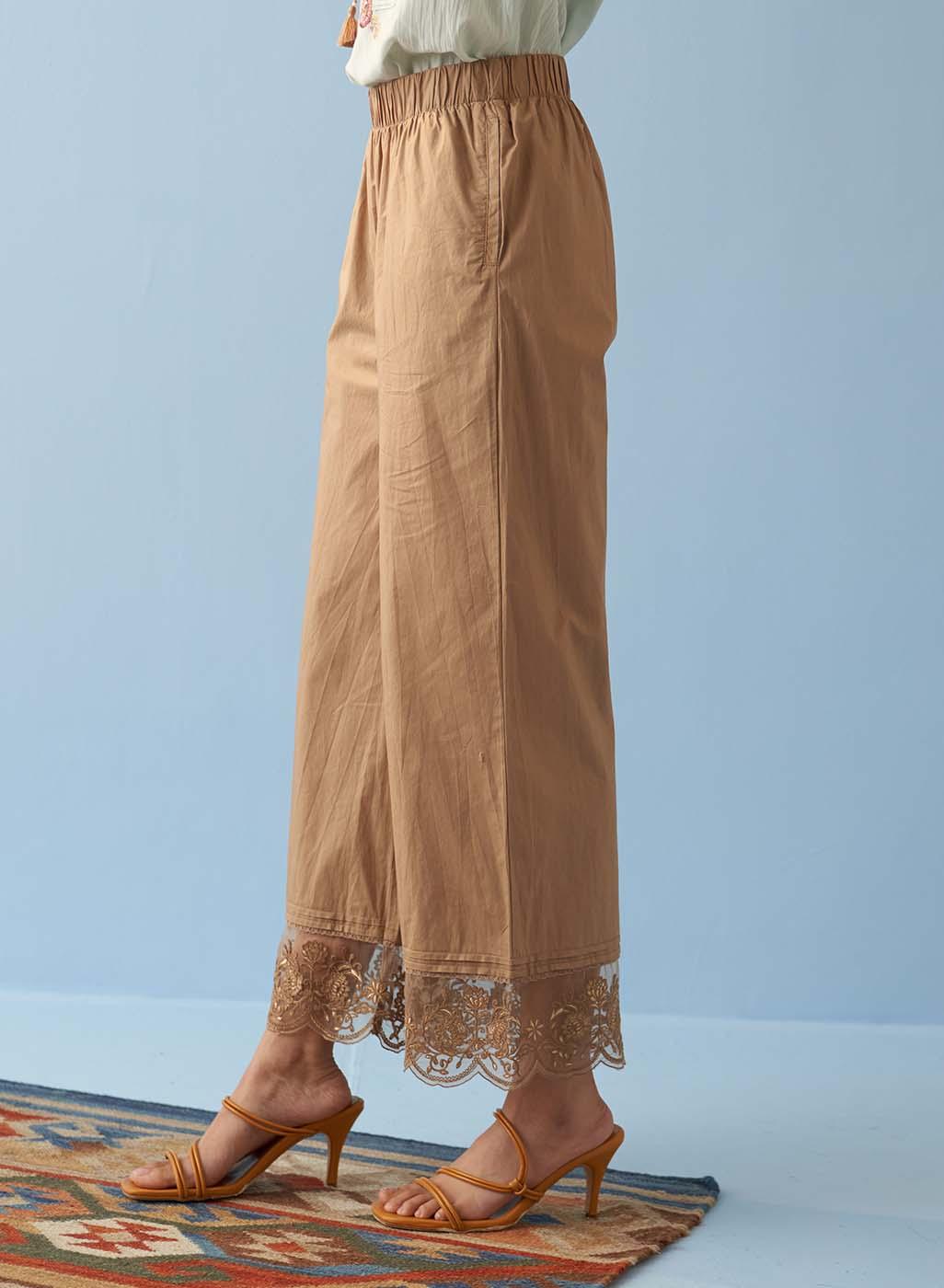 Beige Straight Palazzo with Contrast Thread Embroidery
