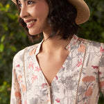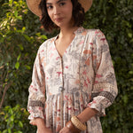 Crafted from soft and breathable viscose muslin, this Bella light grey dress brings together comfort and style in one effortless piece. The A-line silhouette is complemented by the flowy quarter length balloon sleeves, making it a perfect choice for those warmer days. The dress is adorned with a vibrant tropical print that brings a refreshing burst of nature to your wardrobe.
