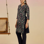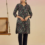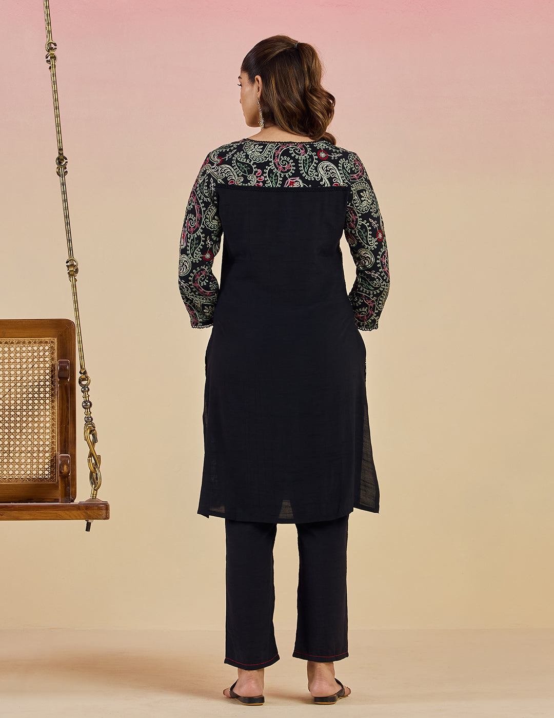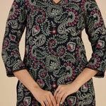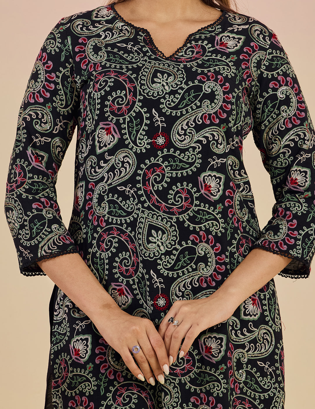 Made in soft, breathable fabric, this kurta set is all about mixing tradition with everyday comfort. The deep black base sets the stage for vibrant embroidery that instantly stands out, while subtle foil-printed florals add a gentle shimmer. Finished with lace-edged details and just a hint of sequins, it’s that perfect blend of easy and festive—without ever feeling over the top.