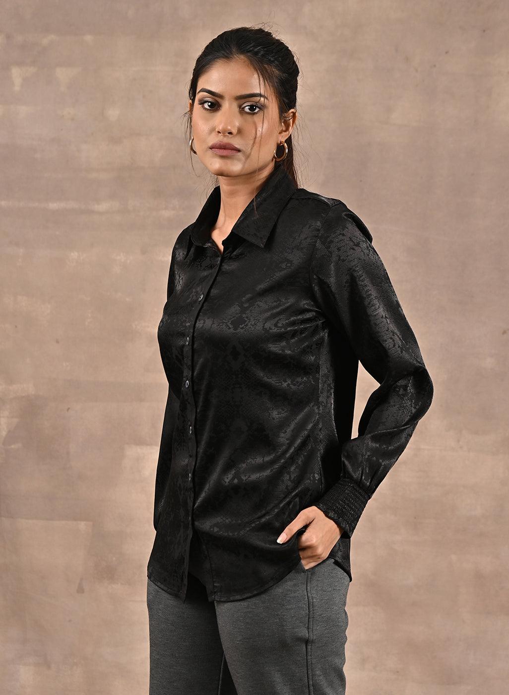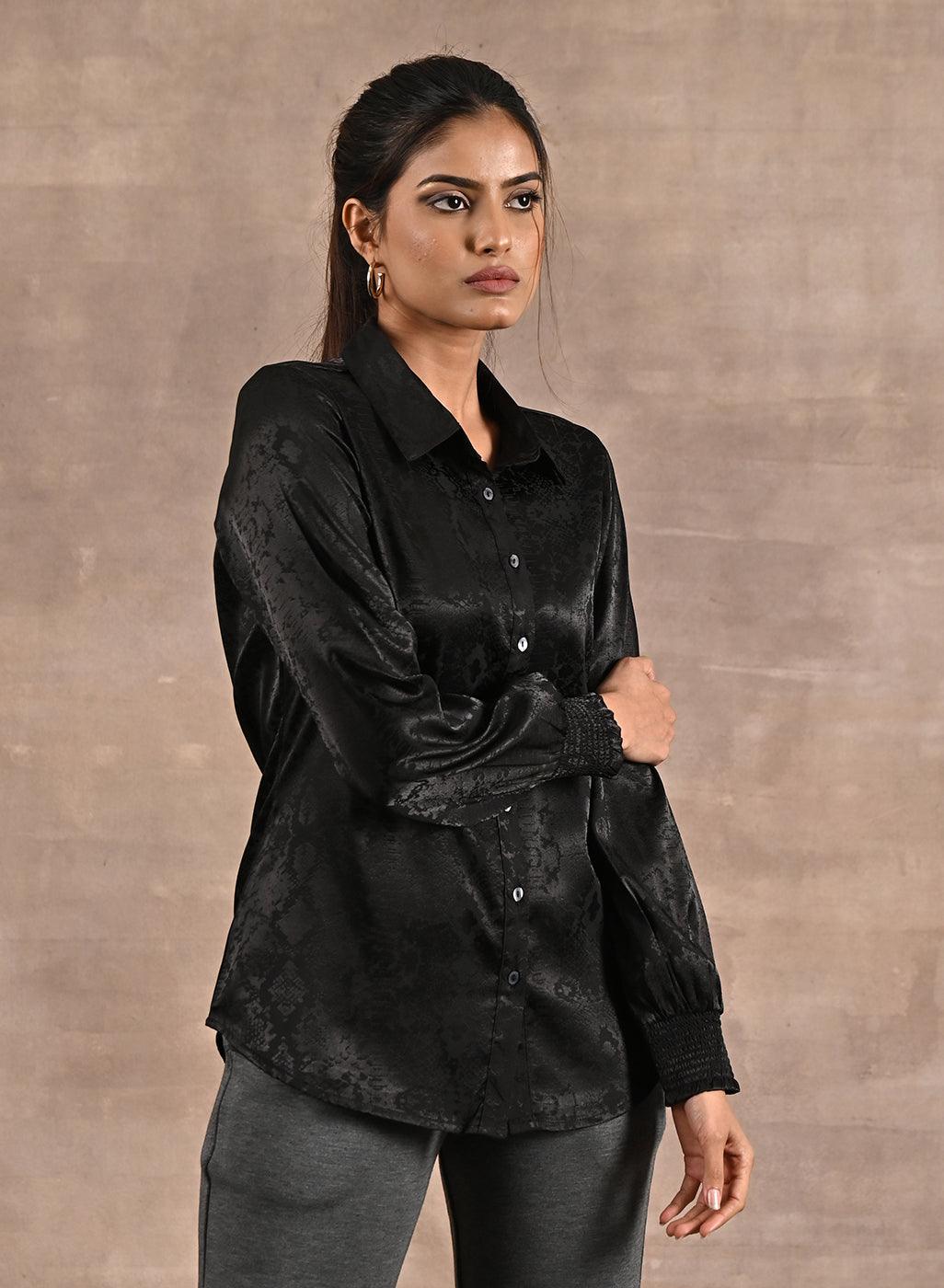 Black Aztec Printed Satin Shirt with Gathered Sleeves