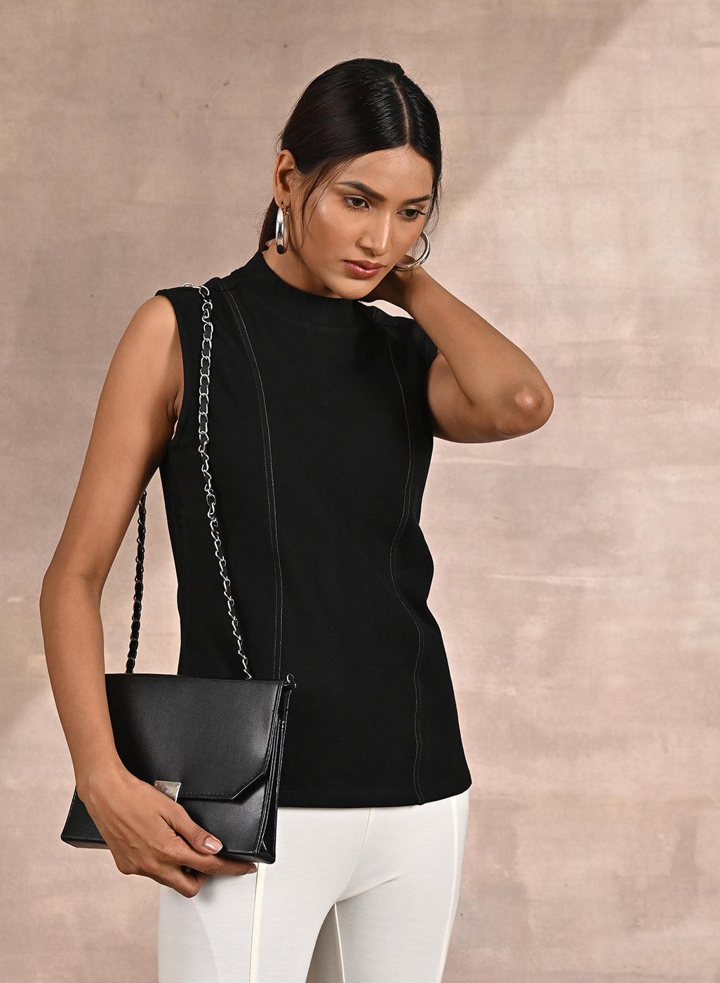 Black Sleeveless Winter Top with Fine Stitch Detailing