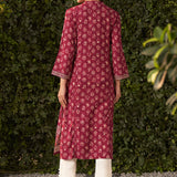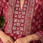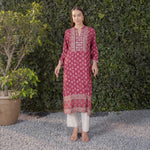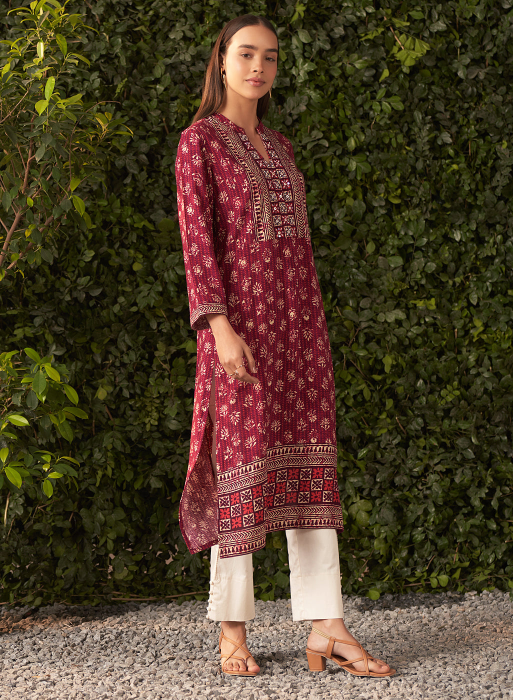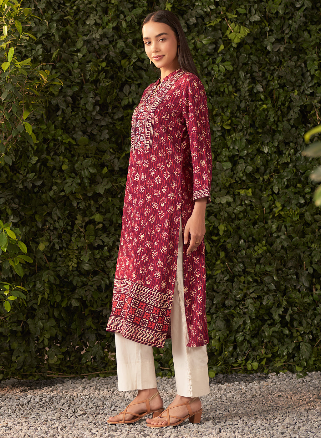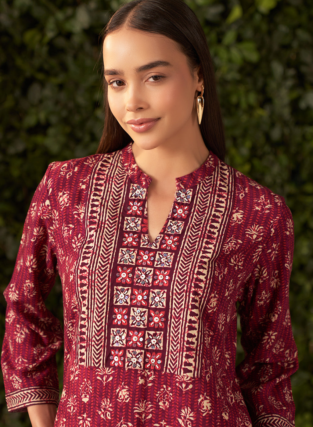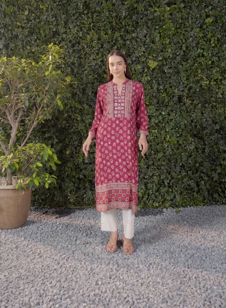 This striking bloom long kurta is a perfect blend of comfort and style, crafted from soft, breathable rayon fabric that gently drapes the body. The rich, Mughal floral print gives it an artistic appeal. The delicate sheen of the fabric adds elegance.
