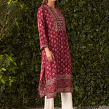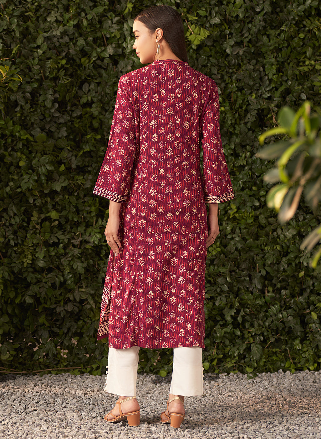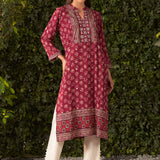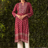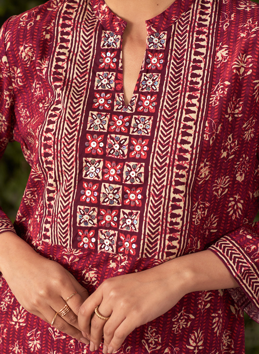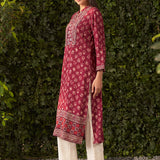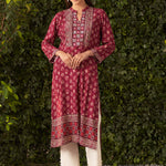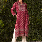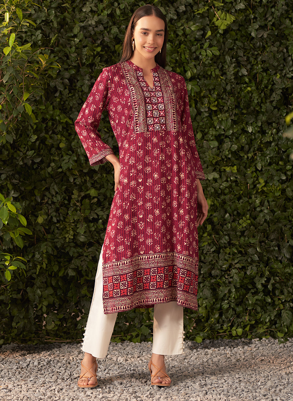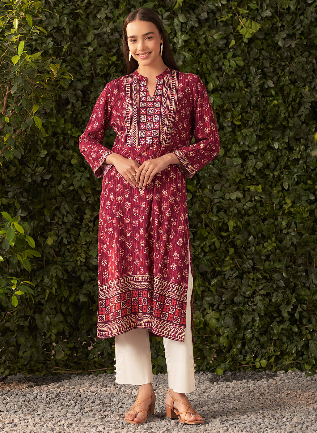 This striking bloom long kurta is a perfect blend of comfort and style, crafted from soft, breathable rayon fabric that gently drapes the body. The rich, Mughal floral print gives it an artistic appeal. The delicate sheen of the fabric adds elegance.