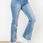 Our Airah Medium Blue Embroidered Denims for Women bring a stylish twist to classic denim. Made from durable denim fabric, these jeans are both comfortable and trendy, designed for everyday wear with a touch of flair.