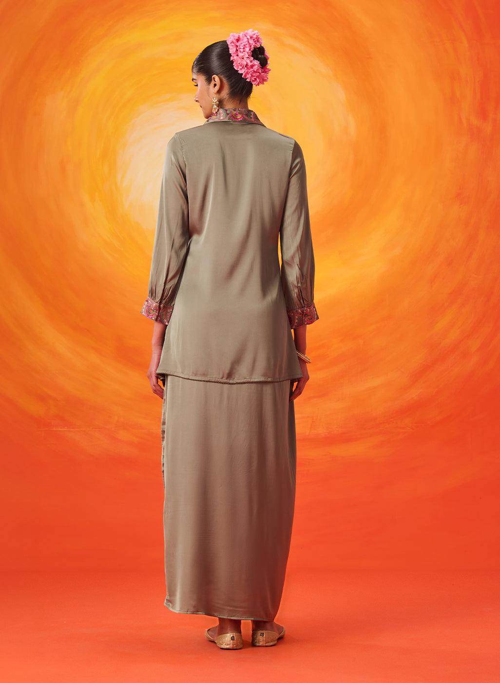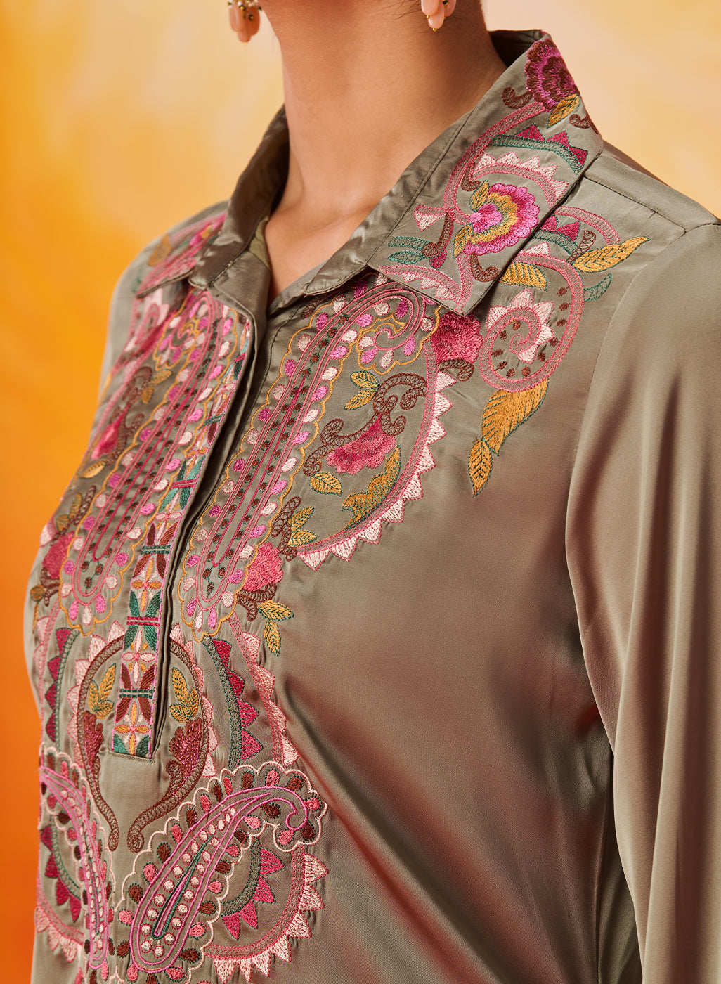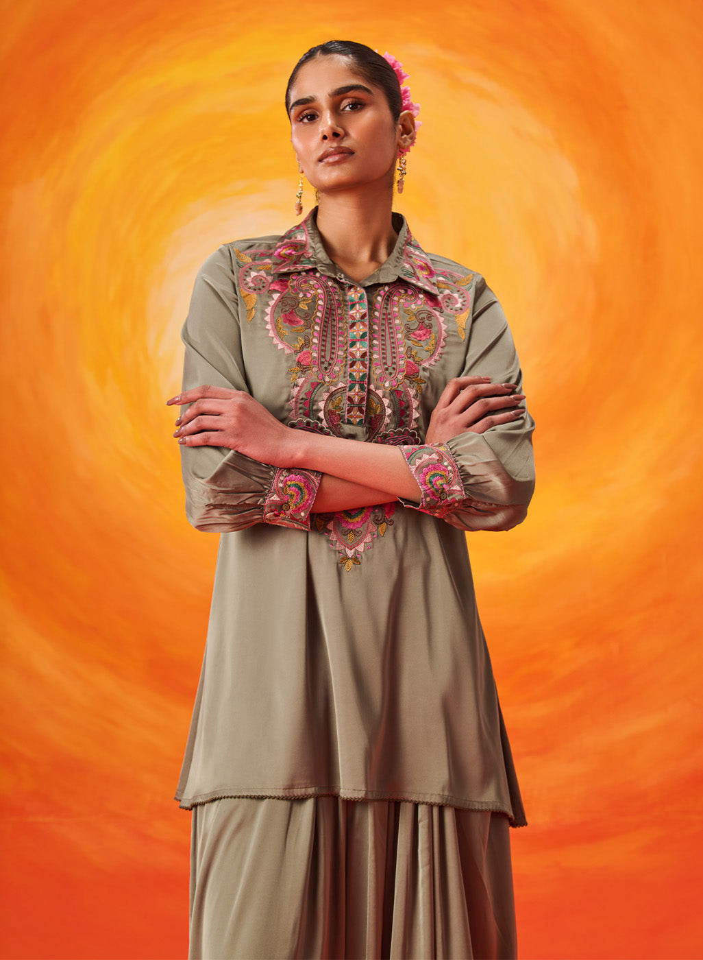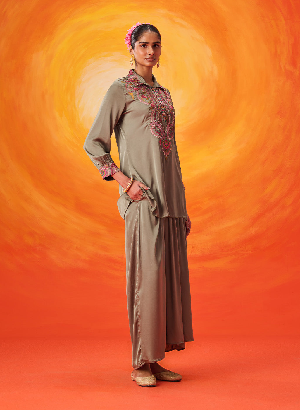 Crafted in a soothing spa hue, this satin co-ord set feels calm, fluid and luxurious. The softness of the colour offsets the intricate embroidery, making it a refined choice for summer evenings that call for grace.