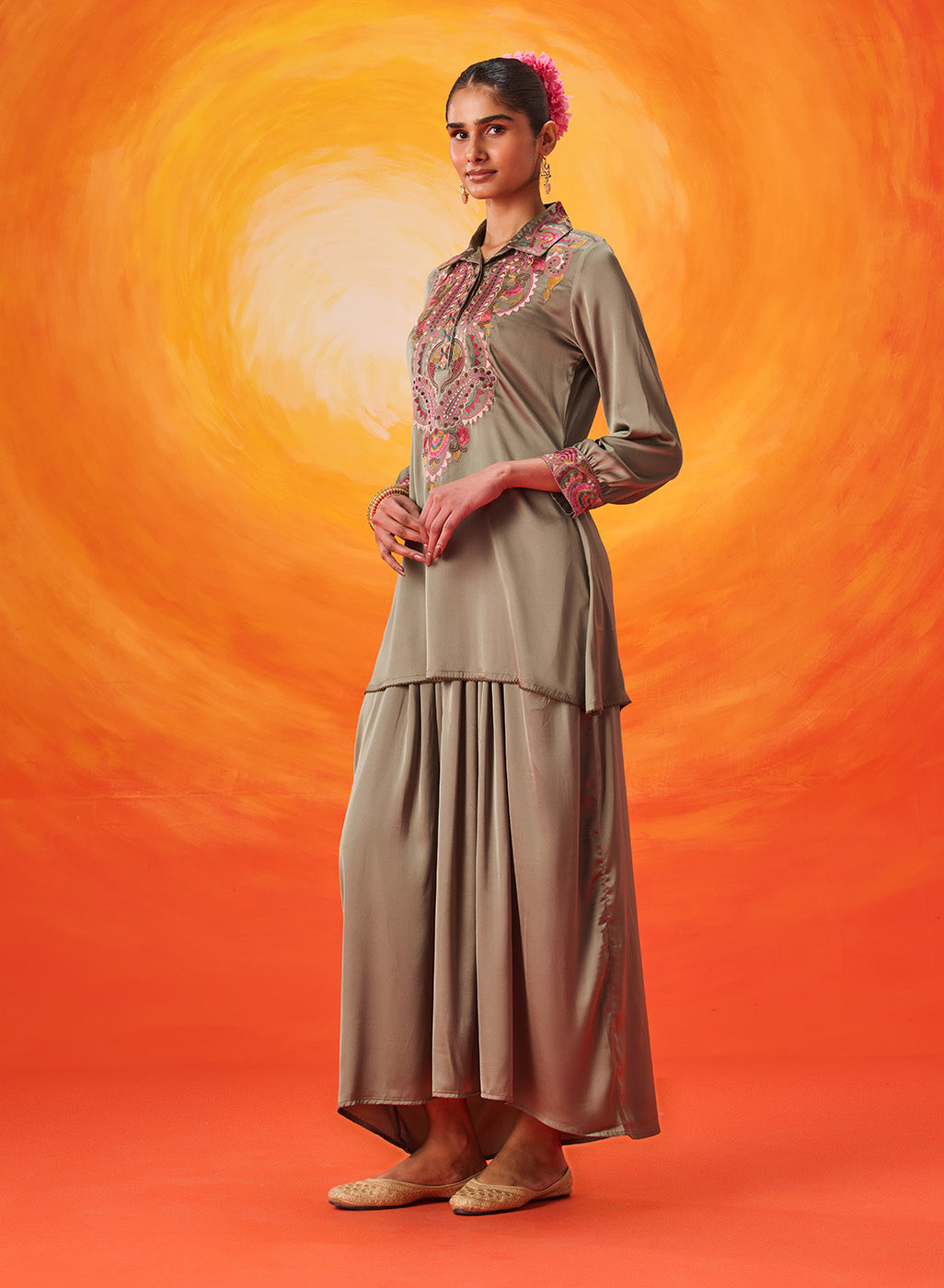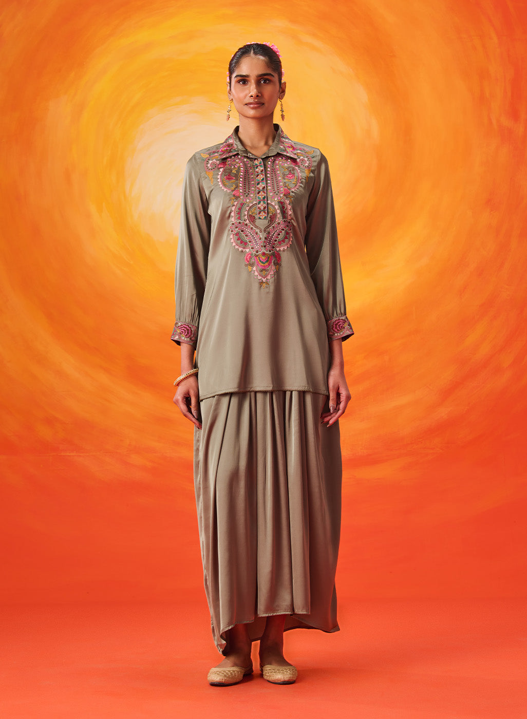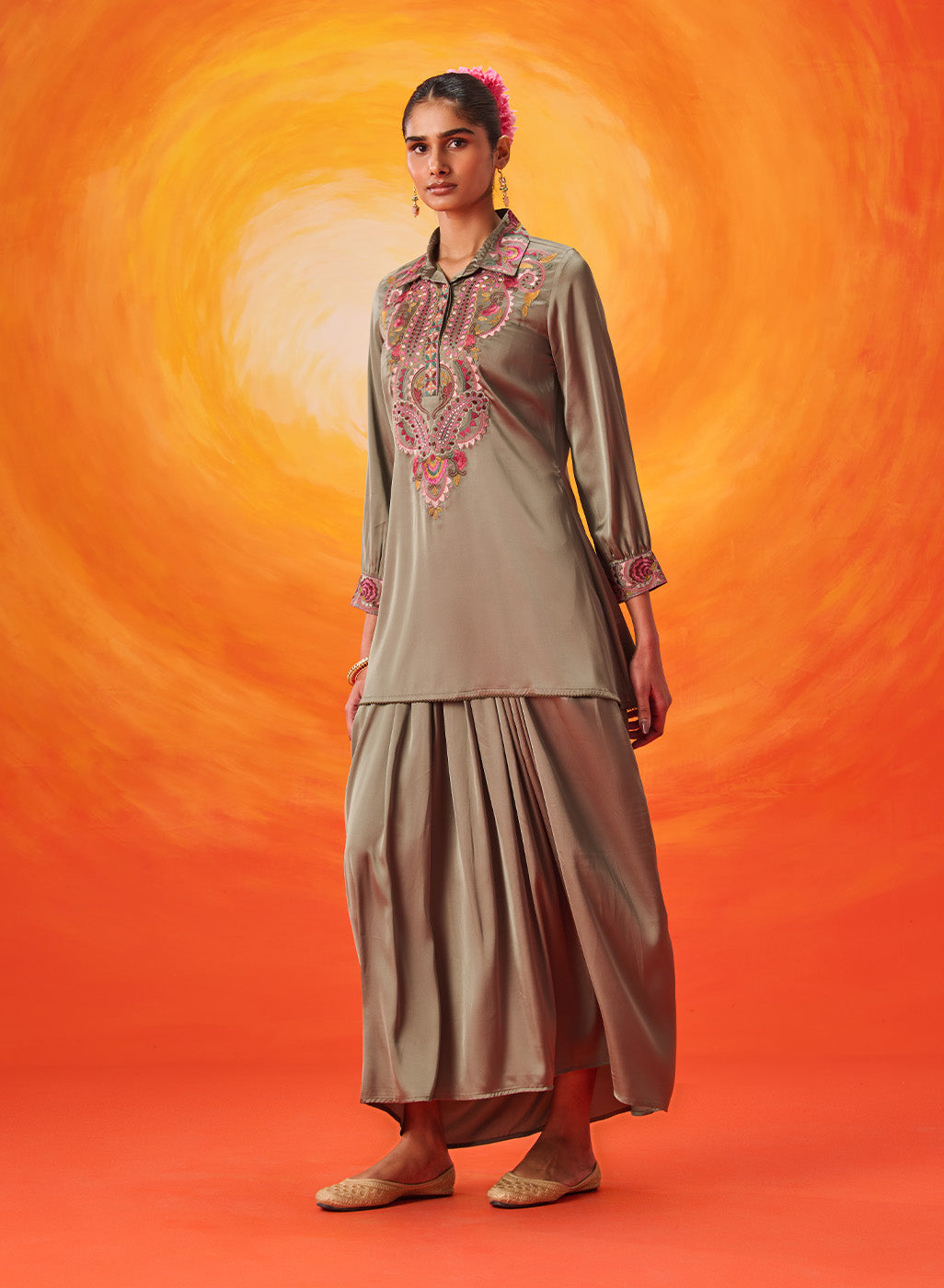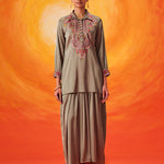 Crafted in a soothing spa hue, this satin co-ord set feels calm, fluid and luxurious. The softness of the colour offsets the intricate embroidery, making it a refined choice for summer evenings that call for grace.