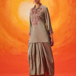 • Mid-waist dhoti skirt with pleats at the waist for a stunning drape