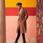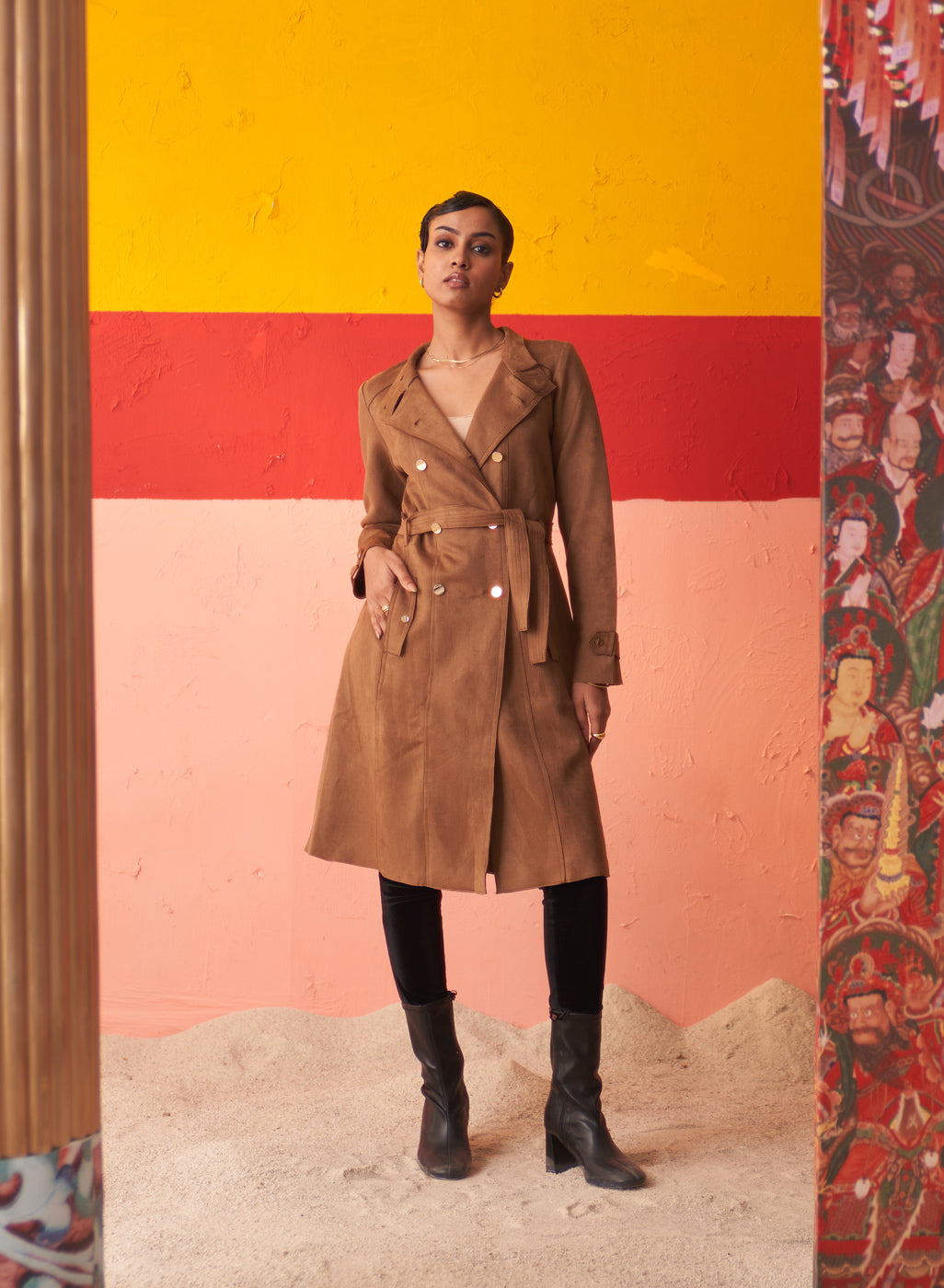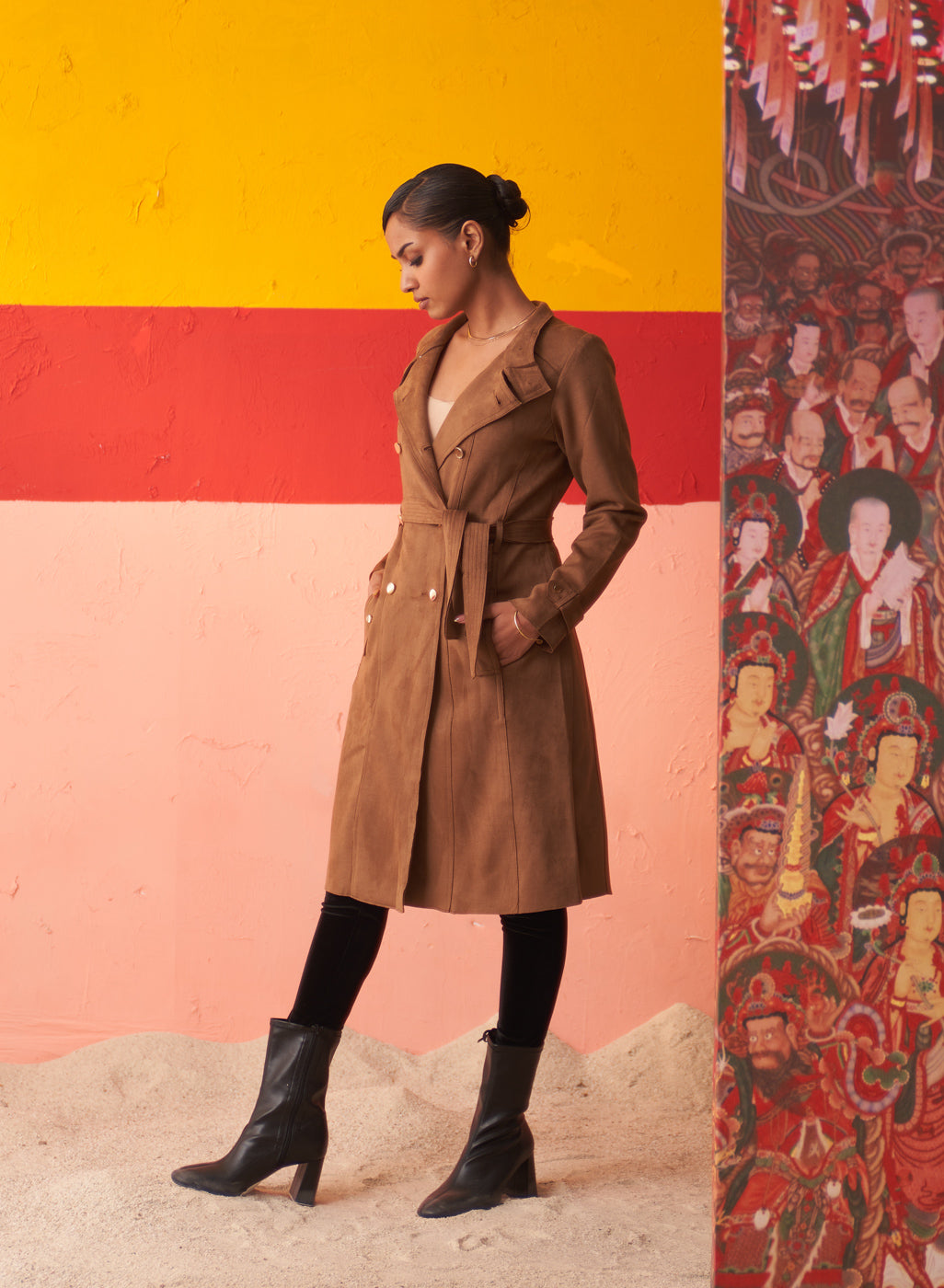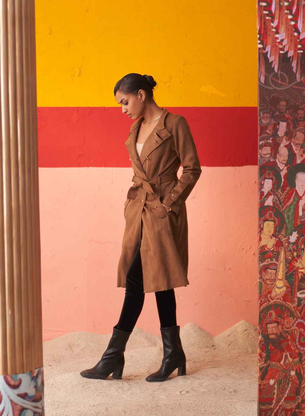 Fabric detailing- Suede epitomizes quality through its velvety texture and supple feel, offering a luxurious touch to fashion and accessories. Known for its durability, suede provides a sophisticated appearance. With its timeless elegance, suede fabric stands as a premium choice when it comes to coats and jackets.