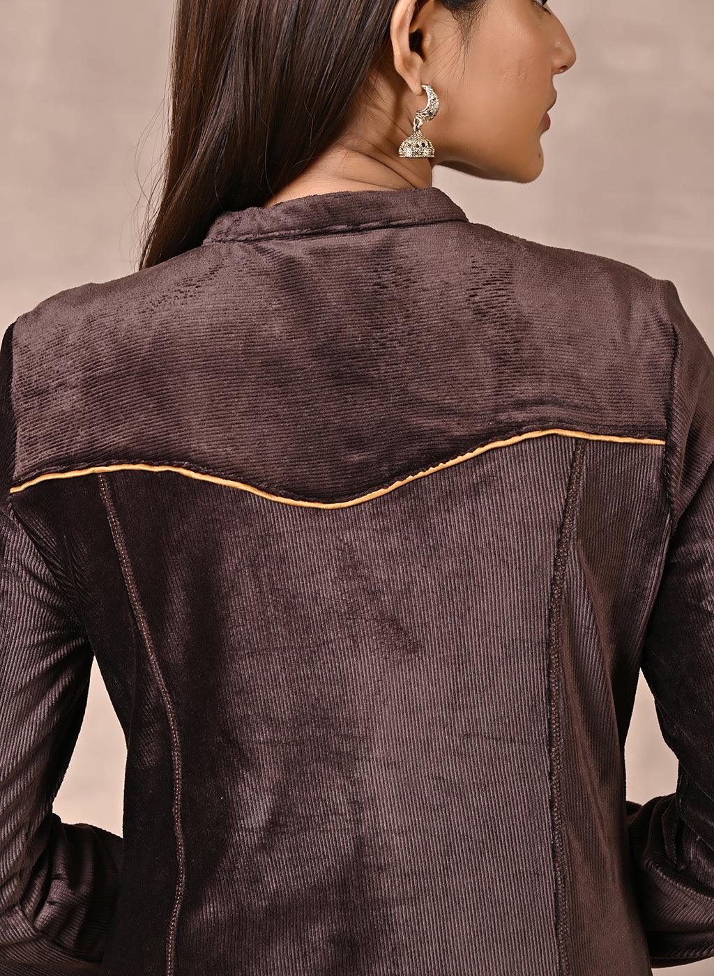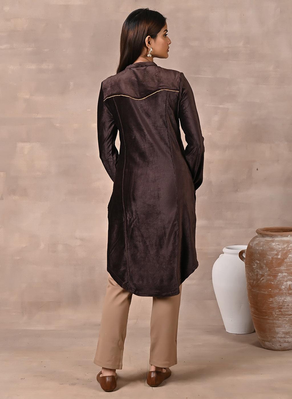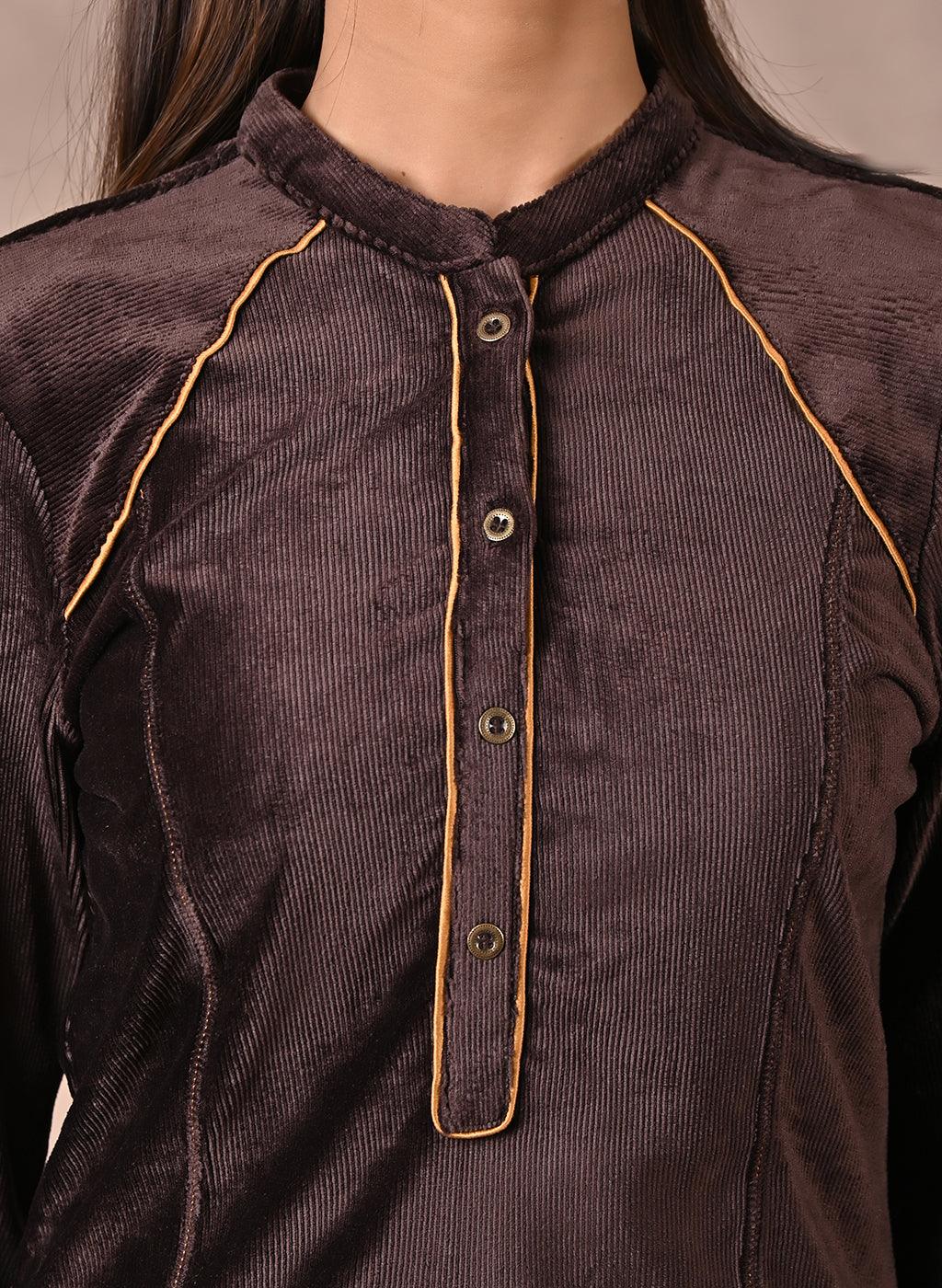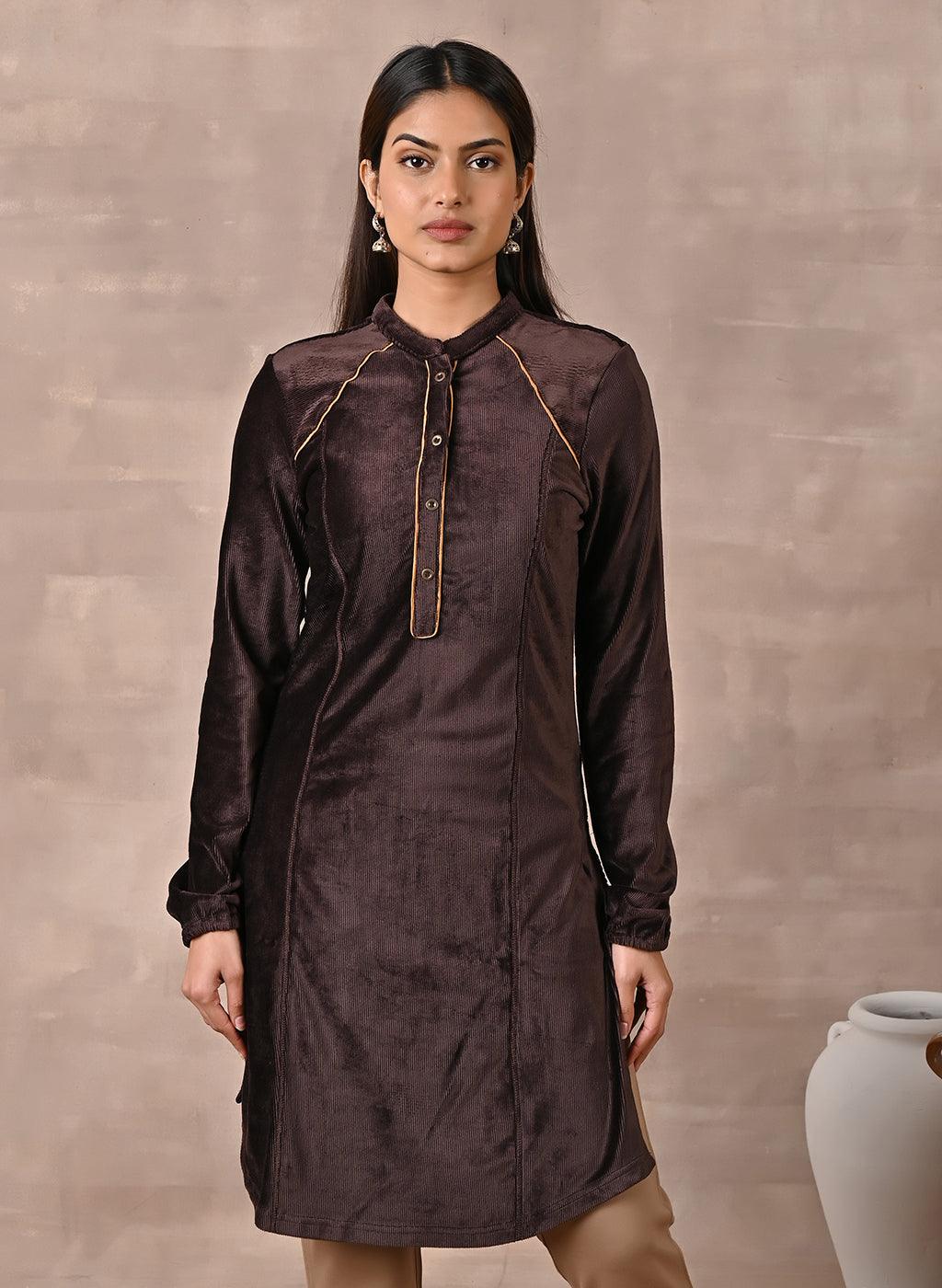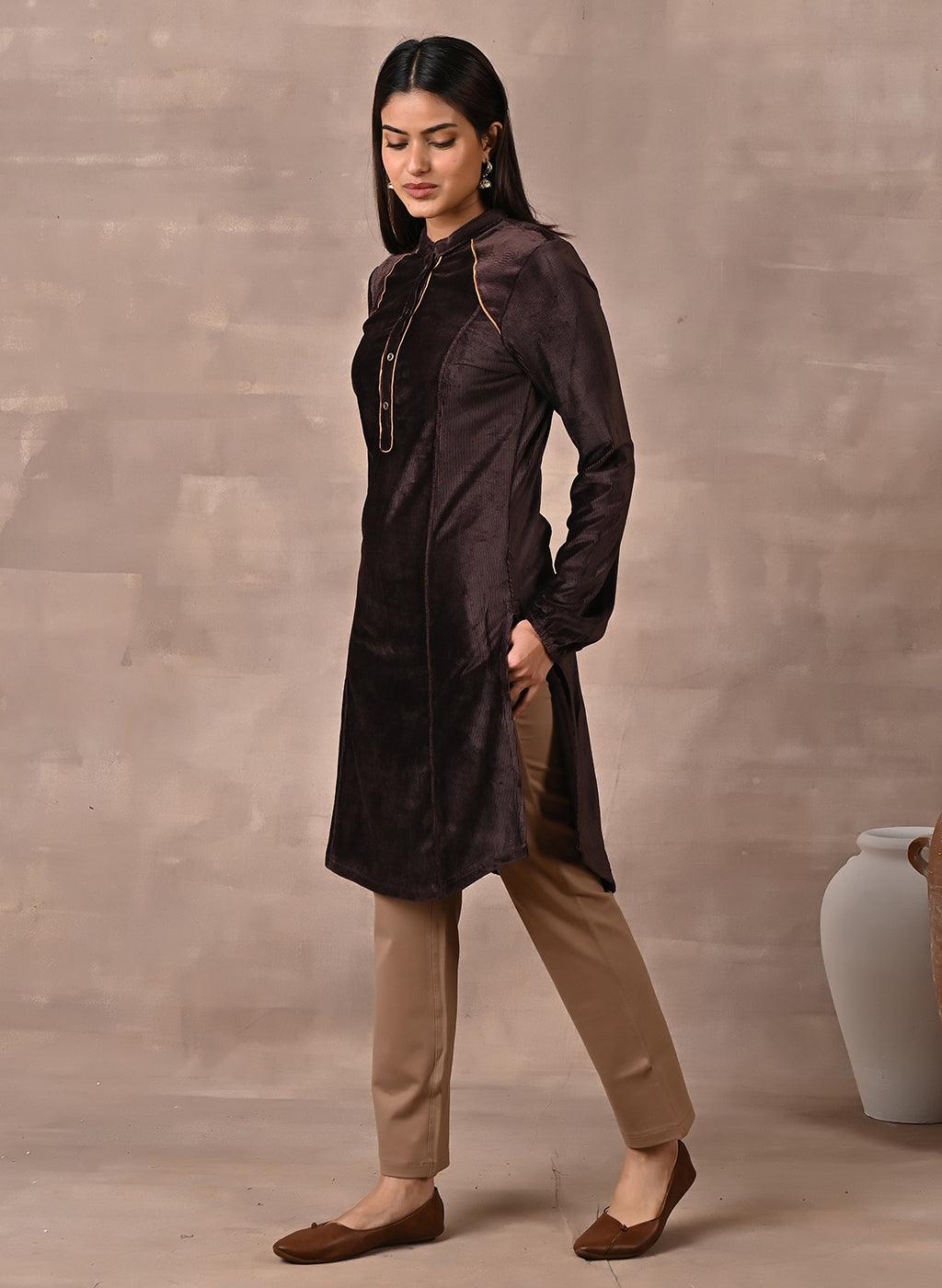 Featuring gathered sleeves and a curved hem, this Brown solid princess-cut kurta is the perfect blend of elegance and simplicity. The contrasting piping details on the front further add to the overall appeal of the kurta. From work to casual meetups, this kurta is suitable for all occasions.