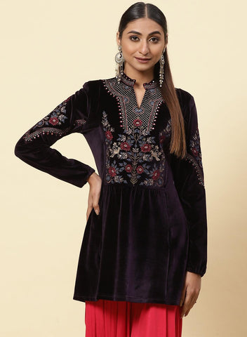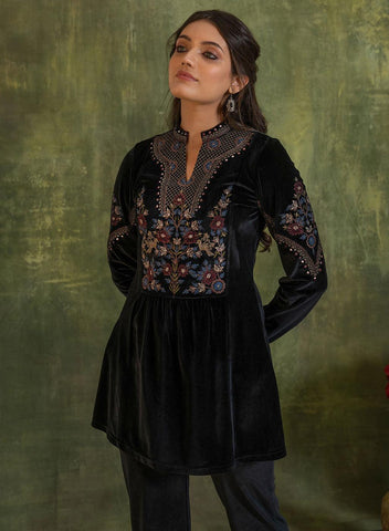 The woman is giving a stylish pose, wearing a black velvet kurti with beautifully decorated floral motifs