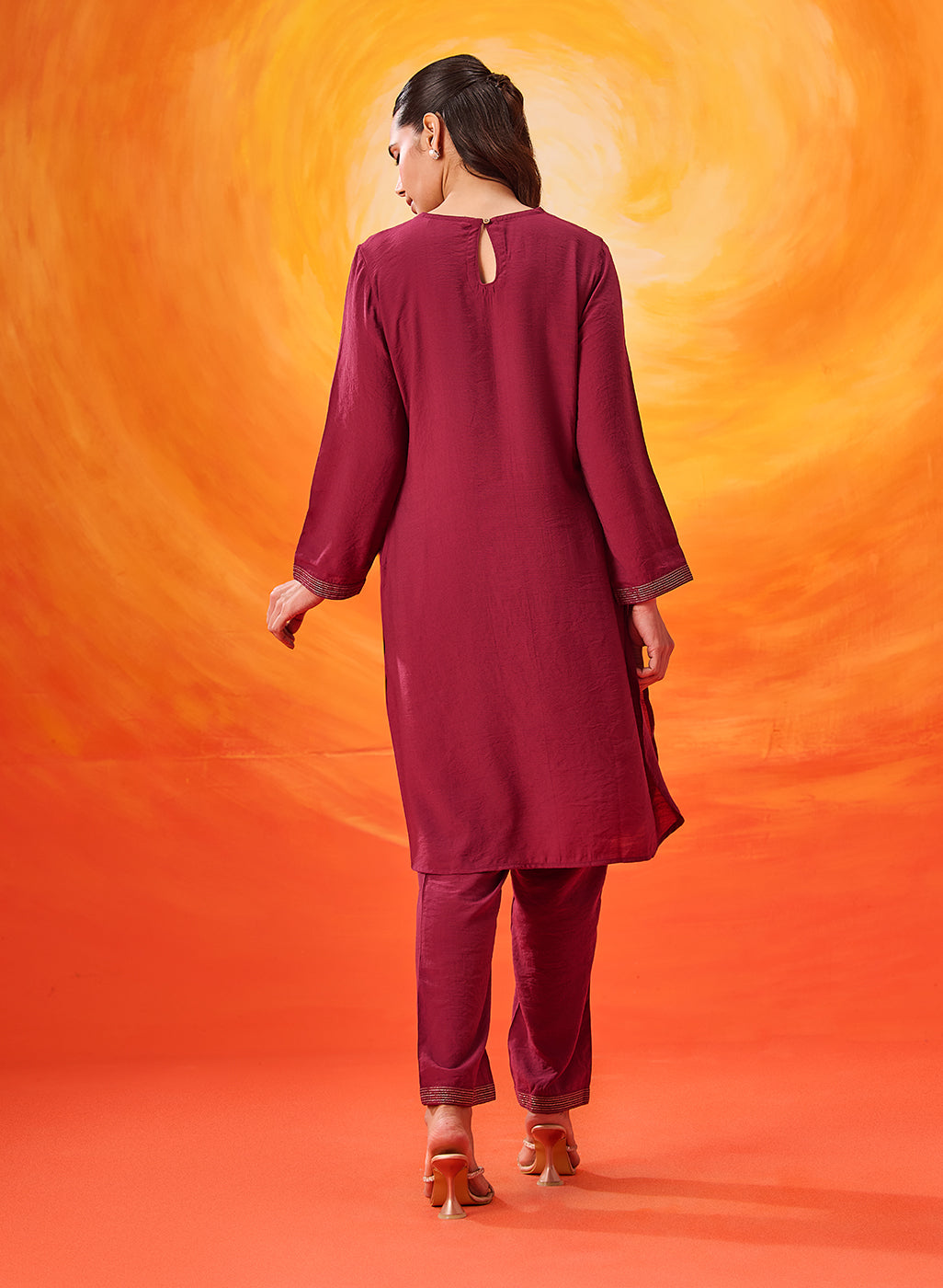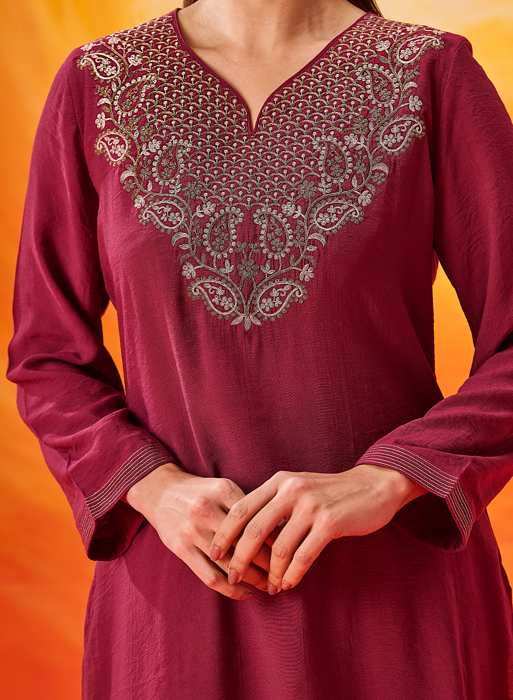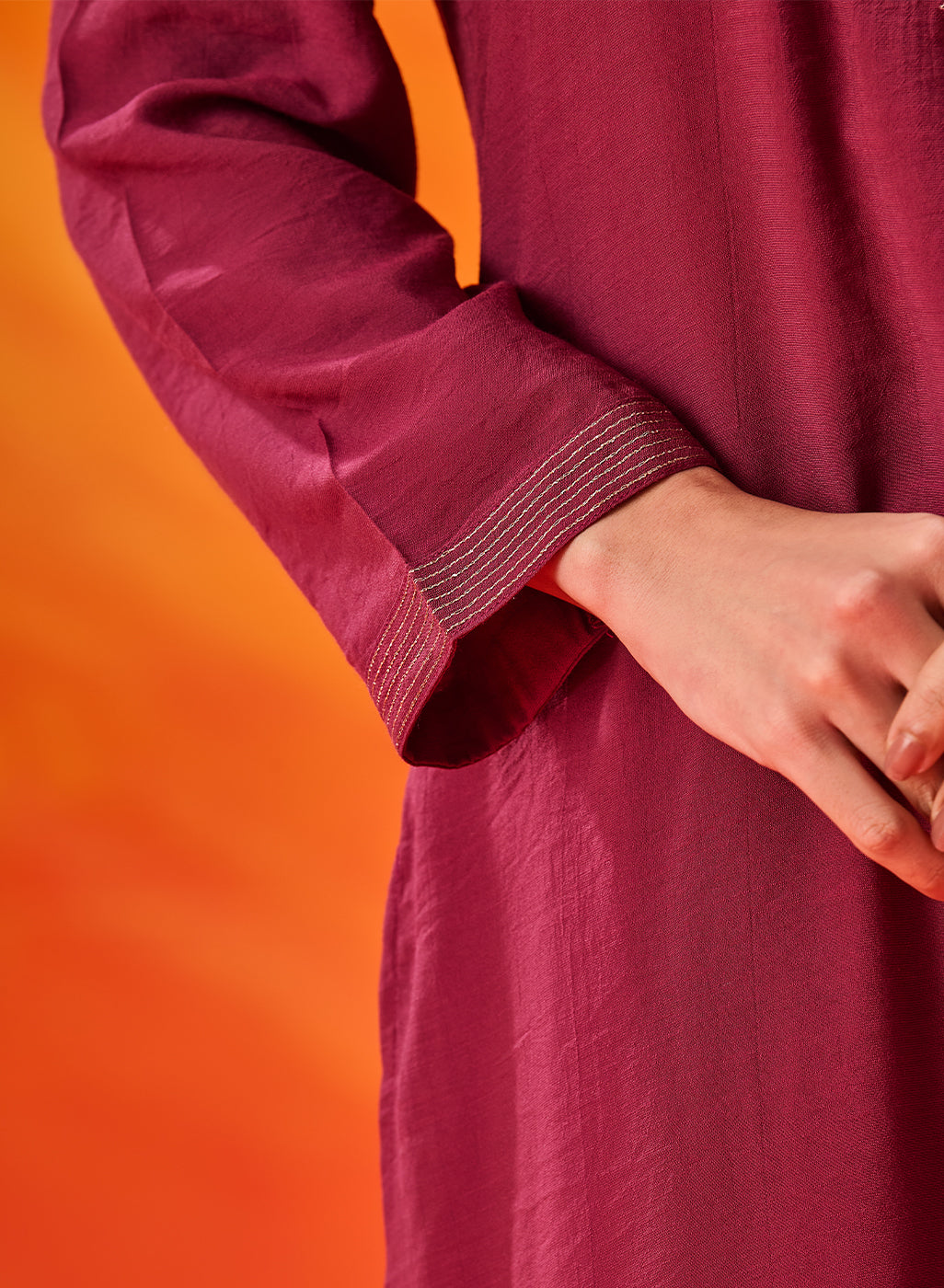 • Zari line embroidery detailing on the sleeve cuffs and bottom hemline.