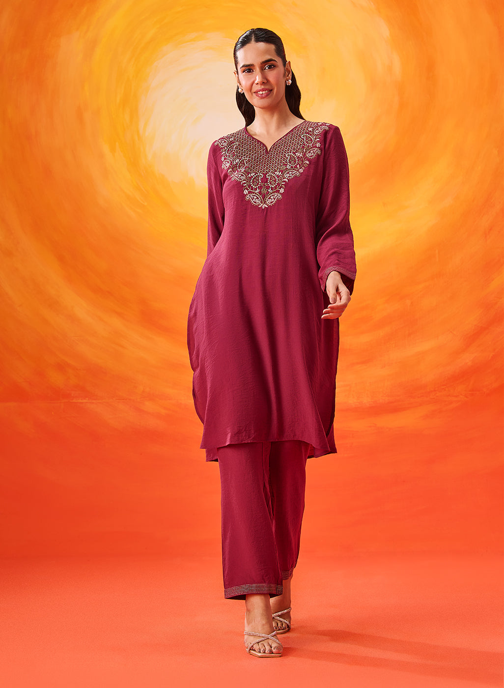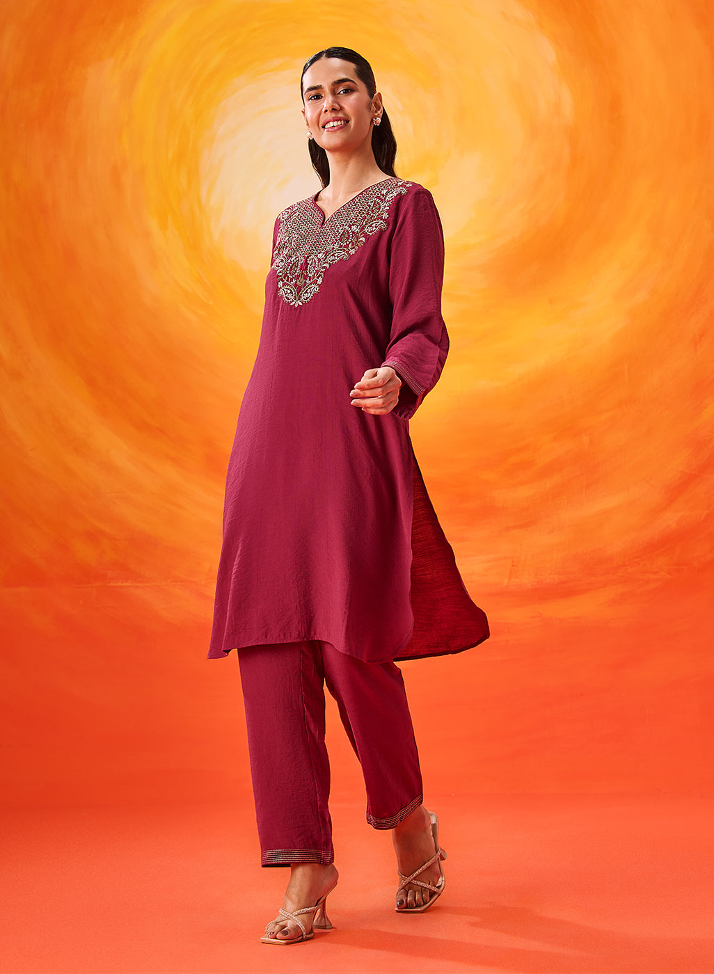 This elegant kurta set in a vibrant fuchsia tone captures the spirit of modern ethnic dressing. Crafted in a breathable cotton blend and highlighted with delicate zari embroidery accents, it offers a look that feels festive yet effortlessly wearable.