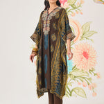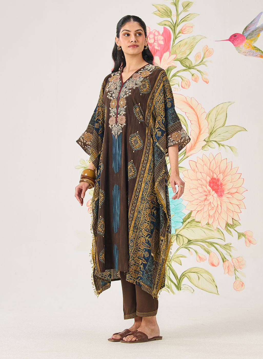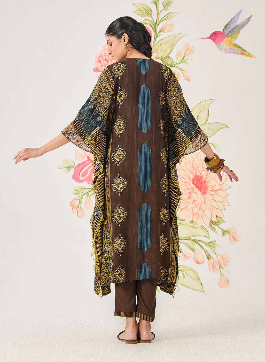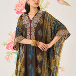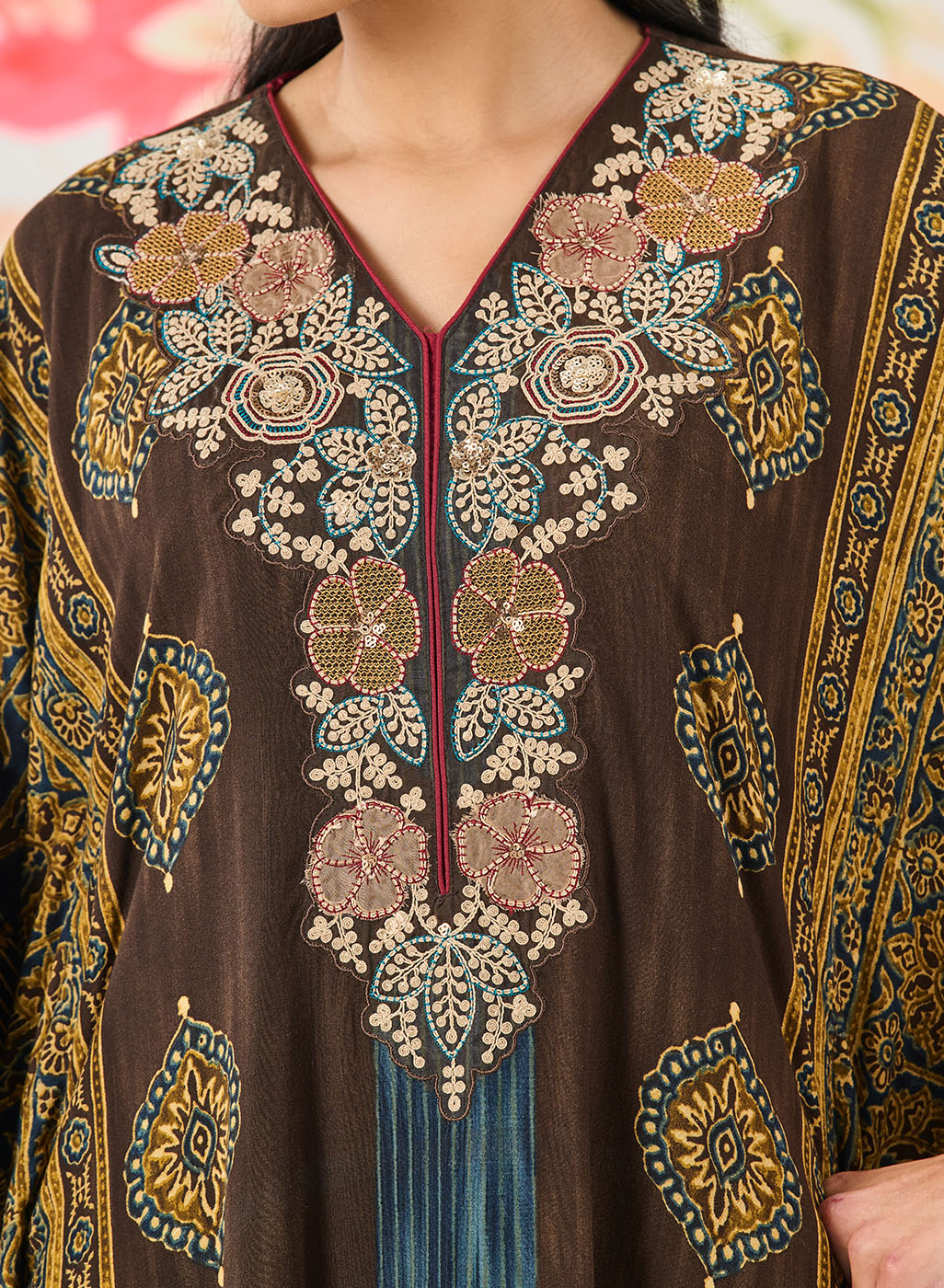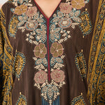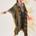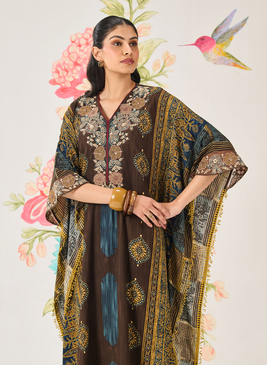 Designed in a rich warm brown, this kaftan set feels relaxed yet refined. The fluid silhouette, striking prints and subtle shimmer on the neckline come together in a look that’s easy to wear and easy to love.