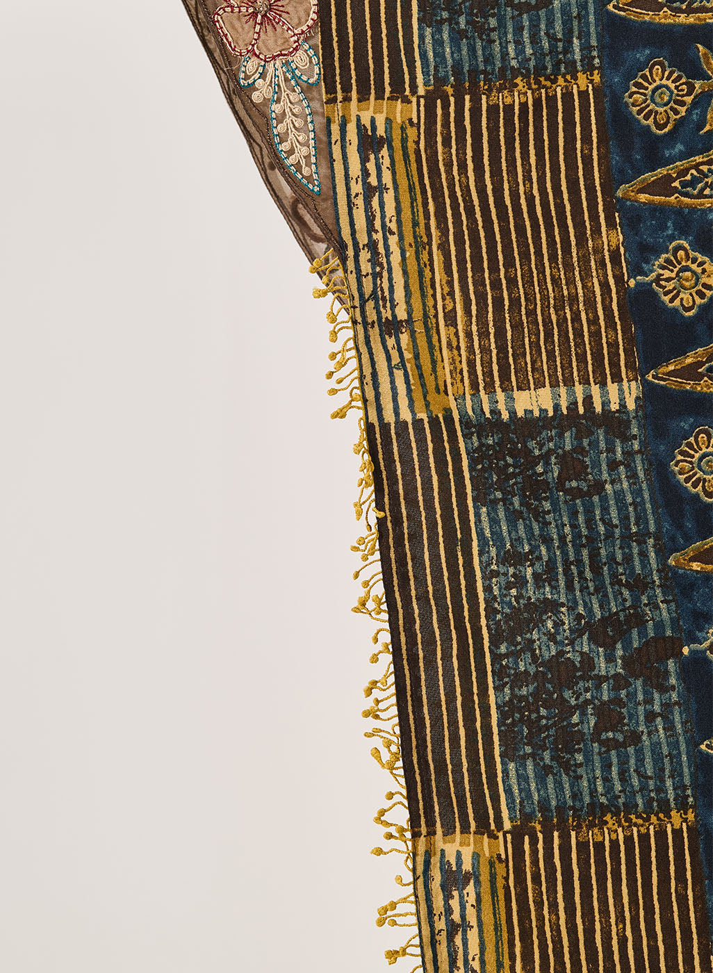 • Dori embroidery with sequin highlights accentuates the V-neckline and sleeves.