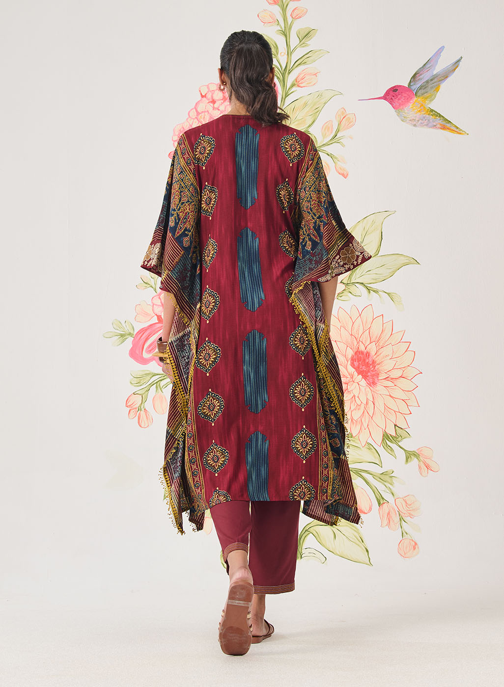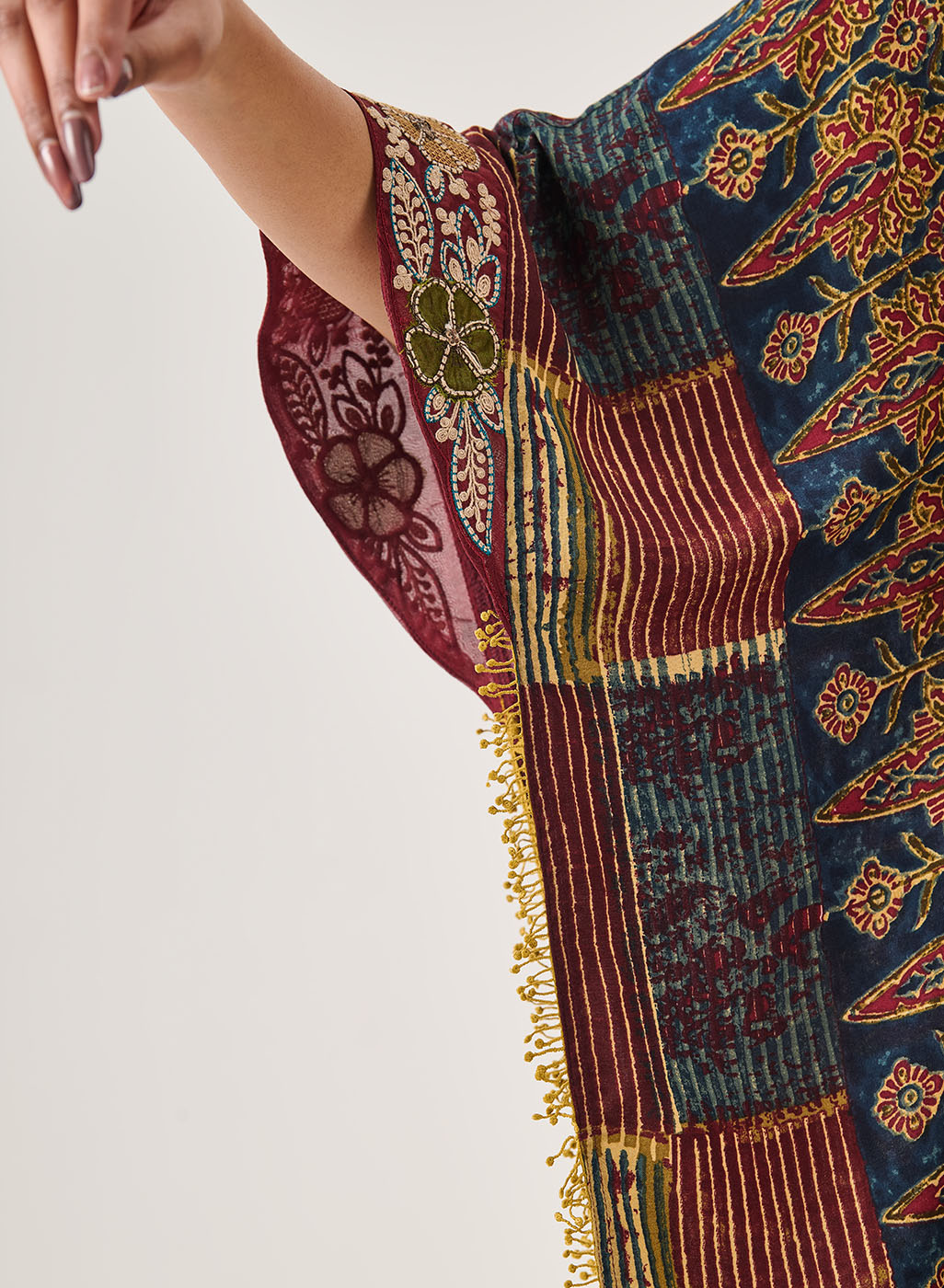 This maroon kaftan set drapes beautifully, blending rich colour with easy movement. The all-over print is elevated with intricate dori embroidery and sequin highlights, making it an ideal choice for relaxed yet polished dressing.