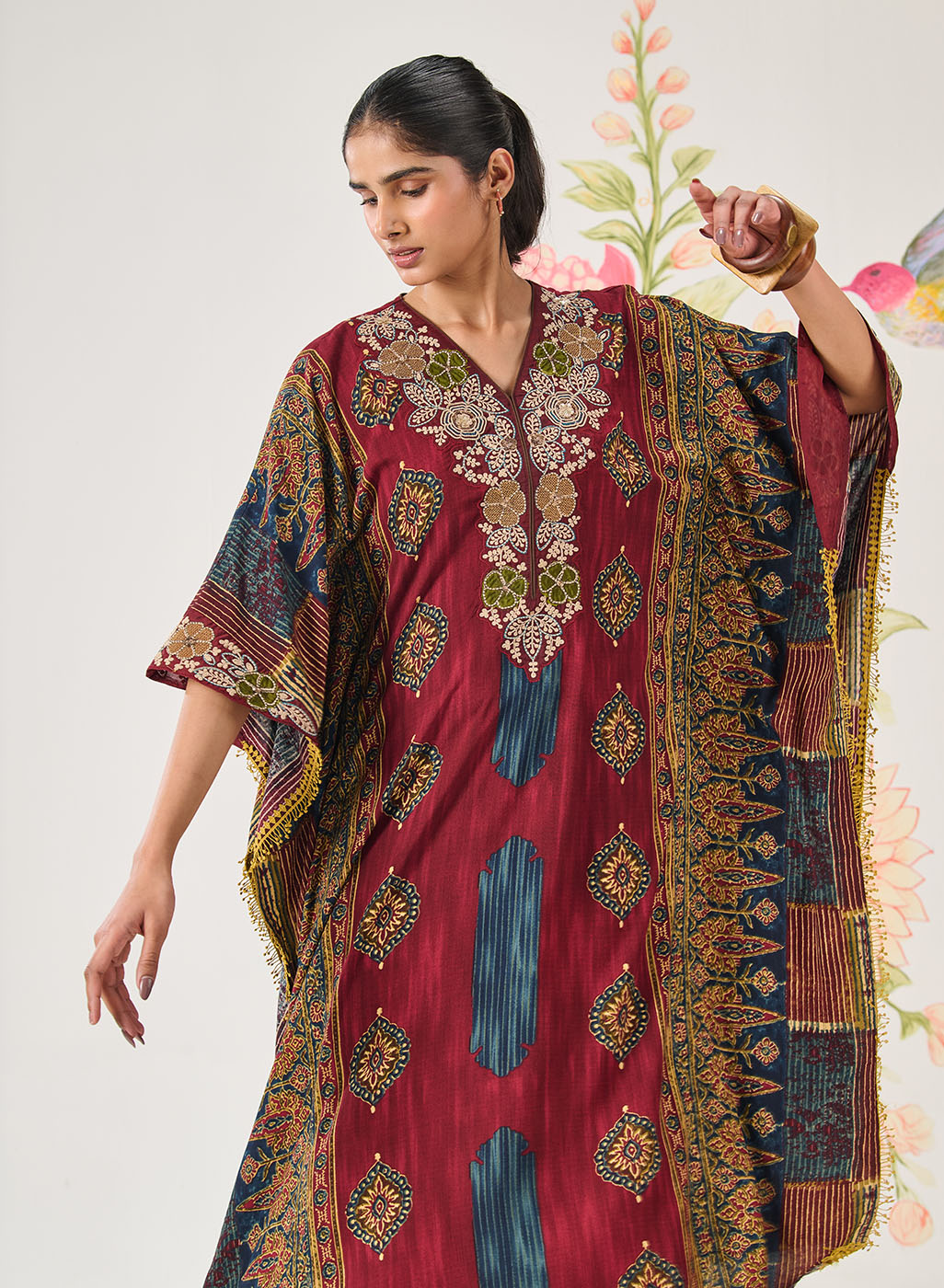 - Lace trims along the fluid kaftan silhouette.